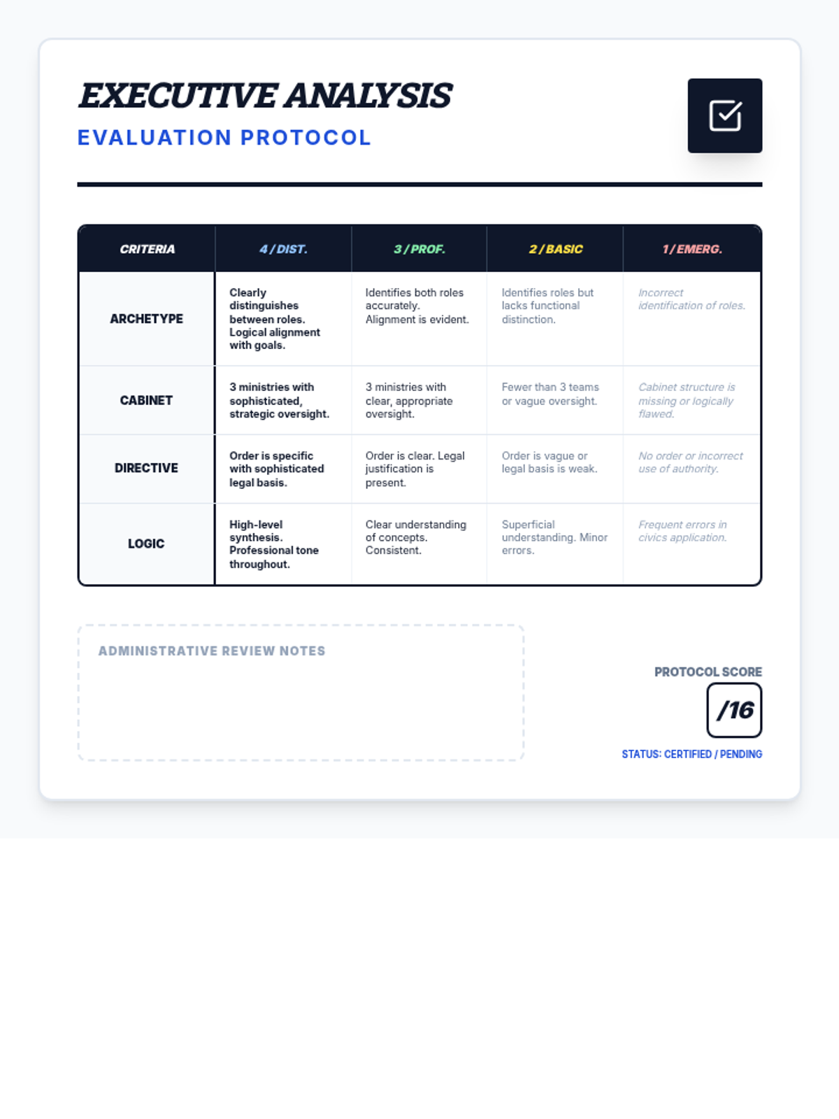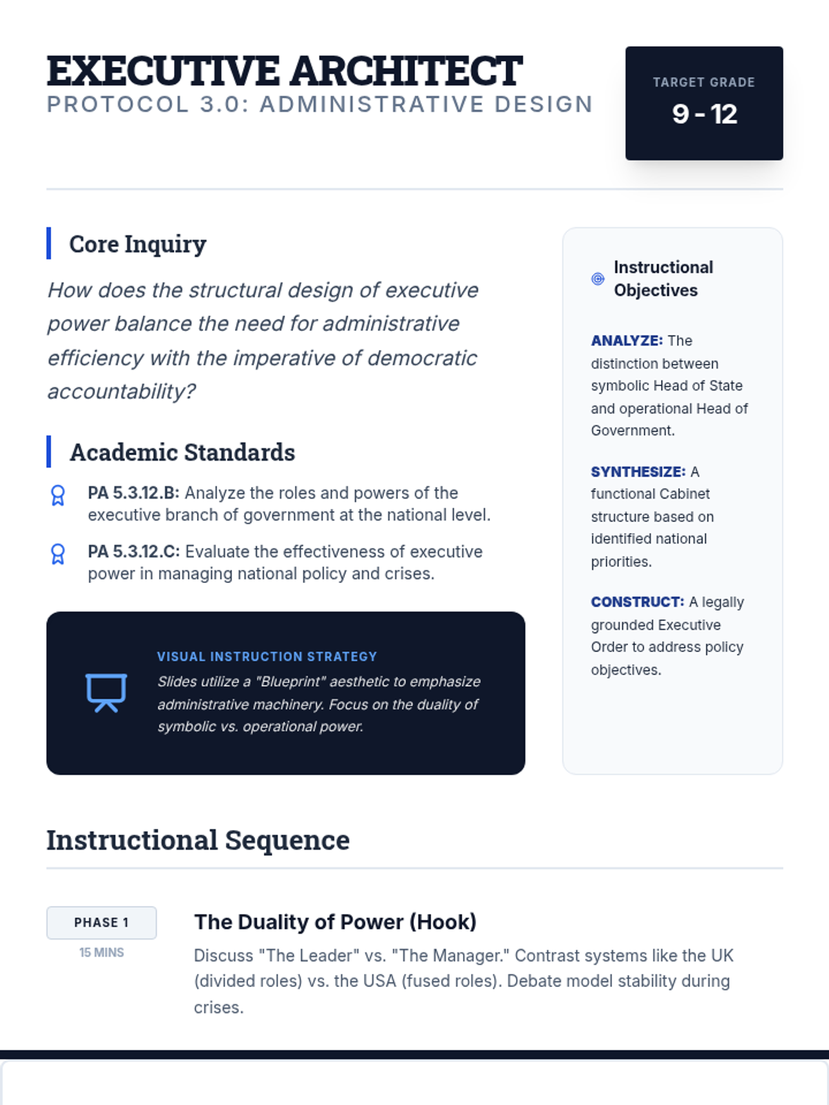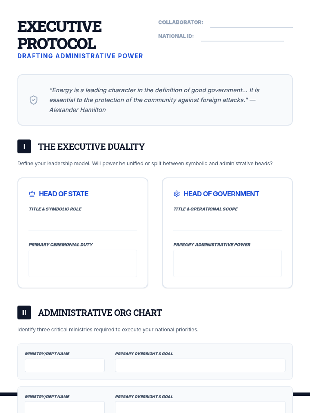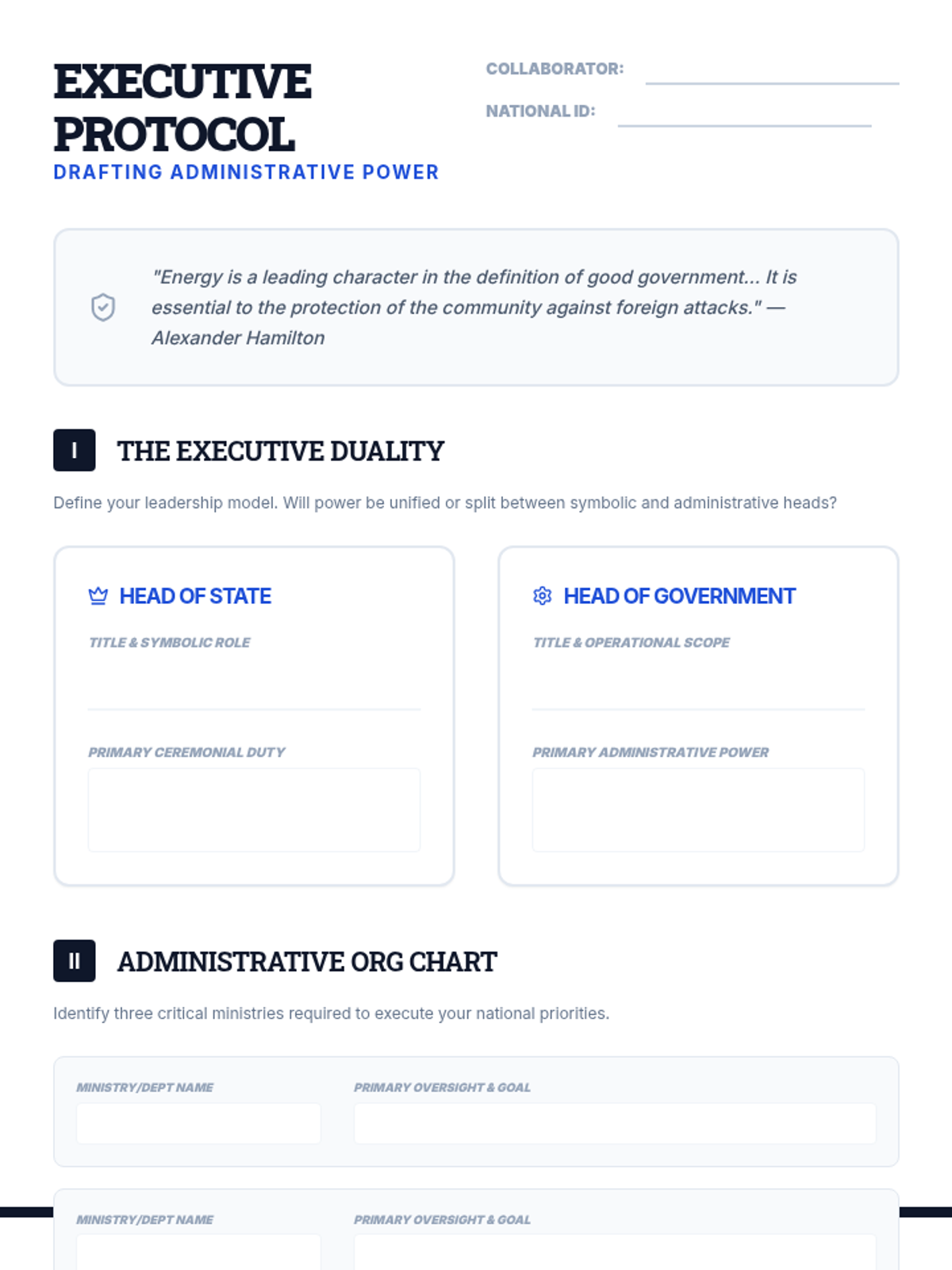 A comprehensive lesson wrapping up the executive branch by challenging students to design the leadership structure and operational machinery of their own fictional countries.