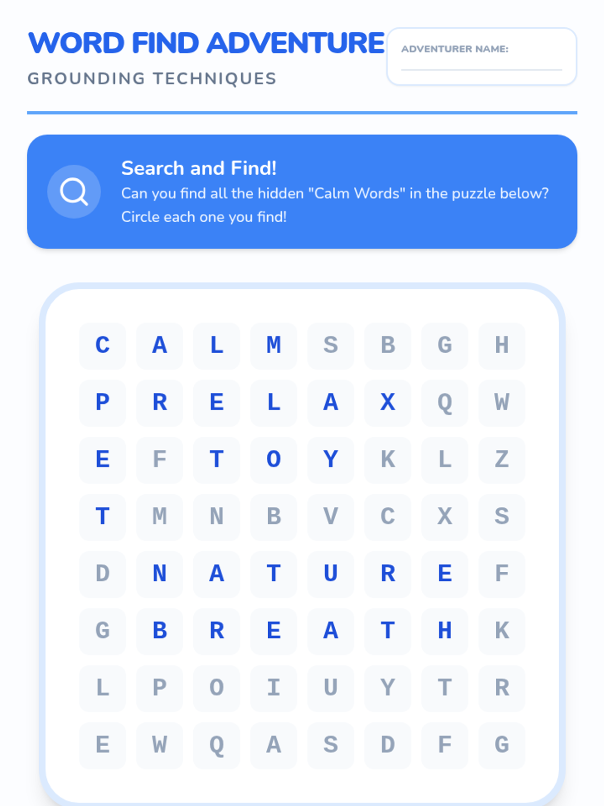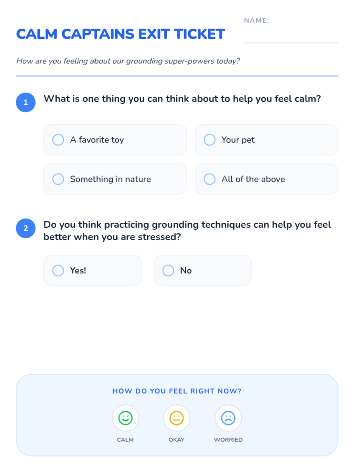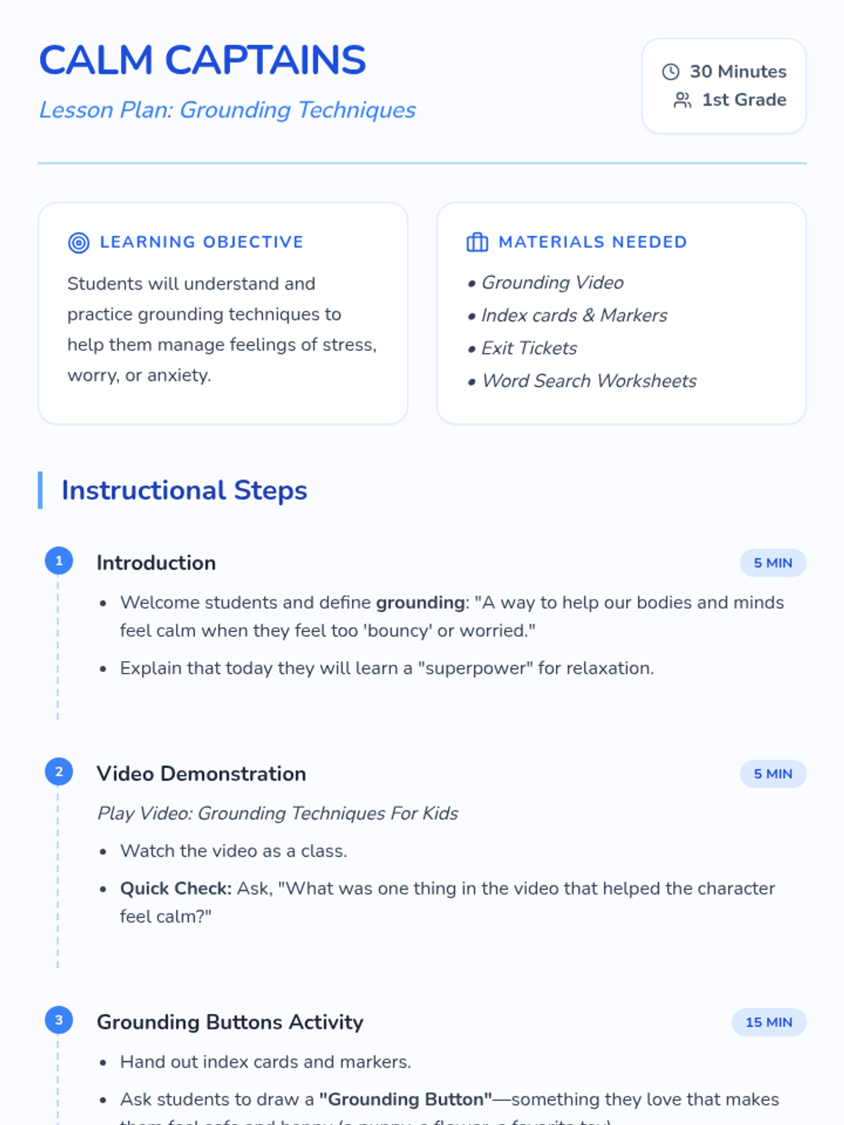 This lesson introduces 1st graders to grounding techniques to help them manage stress and anxiety through a video, an interactive 'Grounding Button' activity, and a reinforcement word search.
