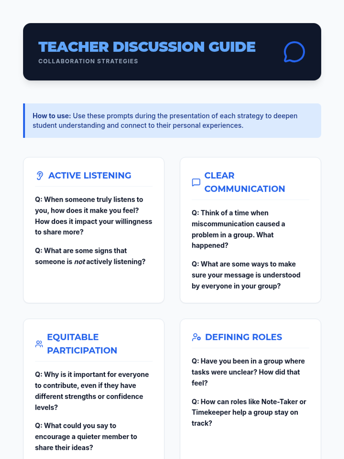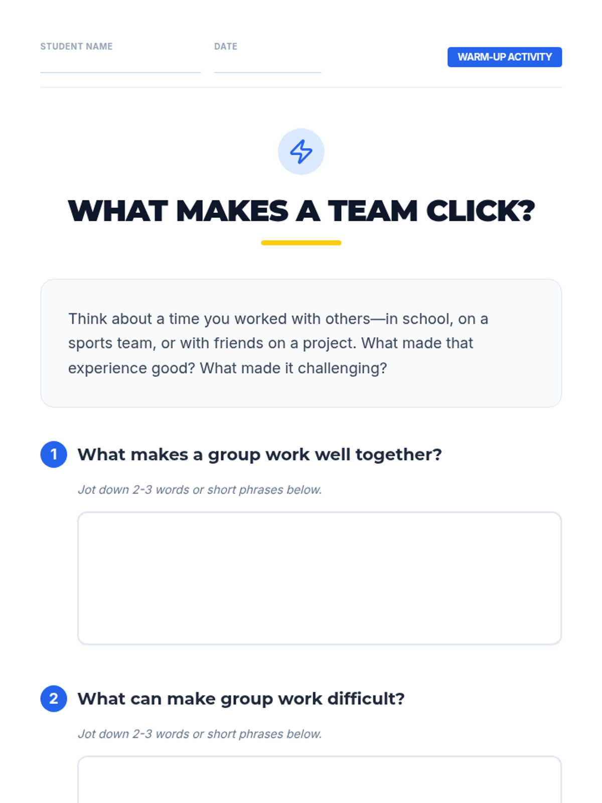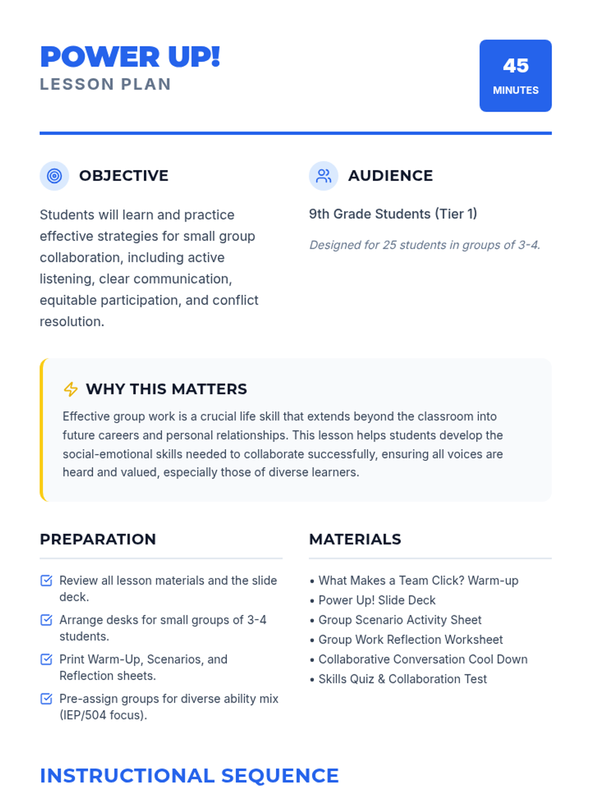 A 45-minute lesson for 9th-grade students on effective collaboration strategies, including active listening, clear communication, and conflict resolution. This lesson uses a 'Power Up' theme to engage students in leveling up their group work skills.