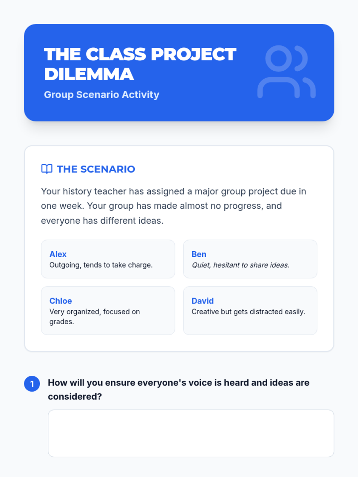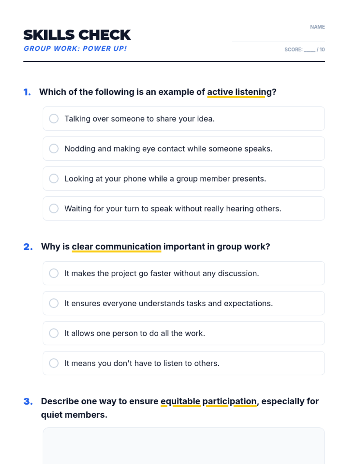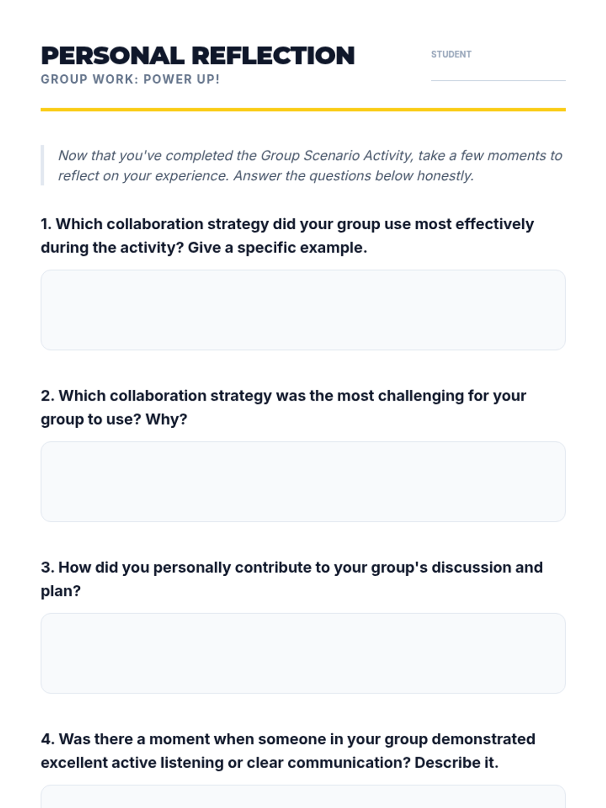 A 45-minute lesson for 9th-grade students on effective collaboration strategies, including active listening, clear communication, and conflict resolution. This lesson uses a 'Power Up' theme to engage students in leveling up their group work skills.