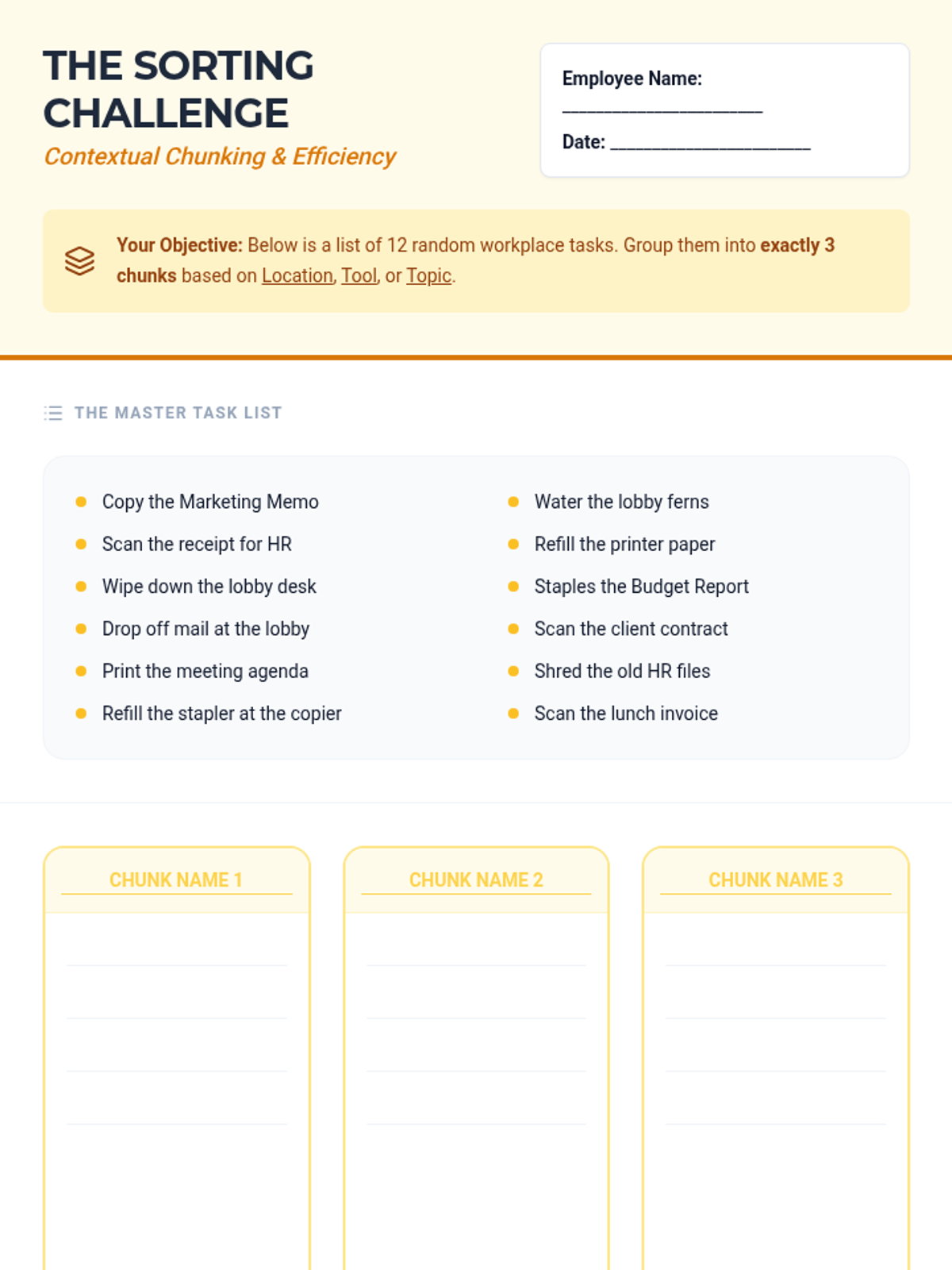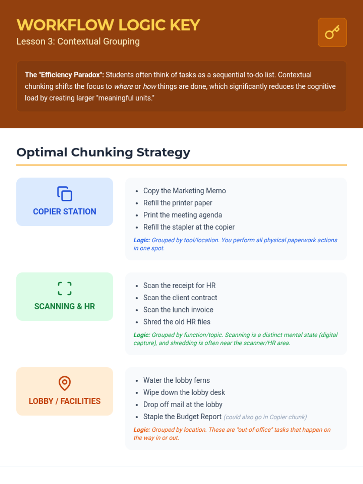 In a workplace simulation, students practice grouping tasks by location or tool required. This teaches efficiency and reduces memory load by chunking actions into logical clusters.