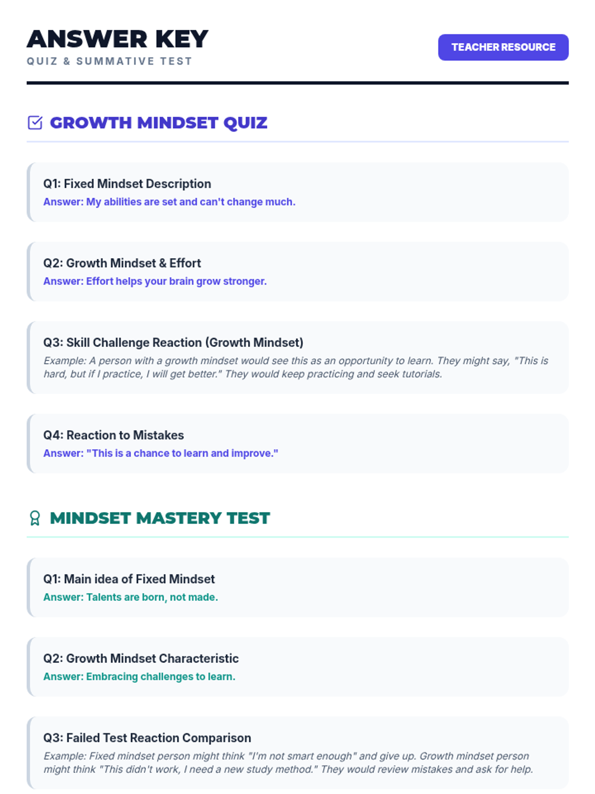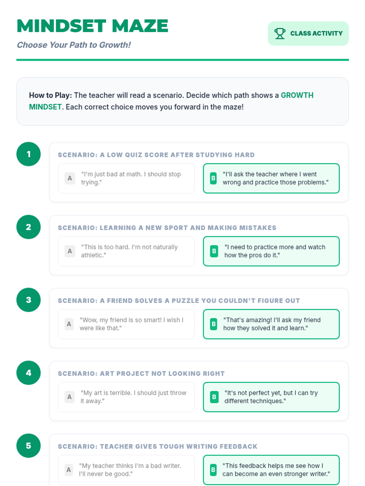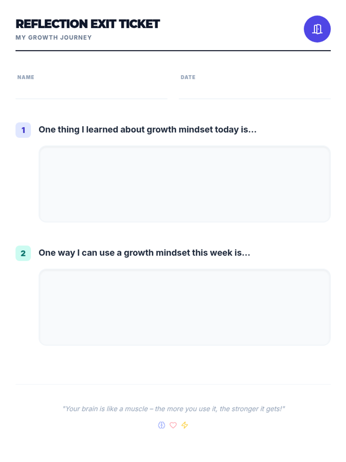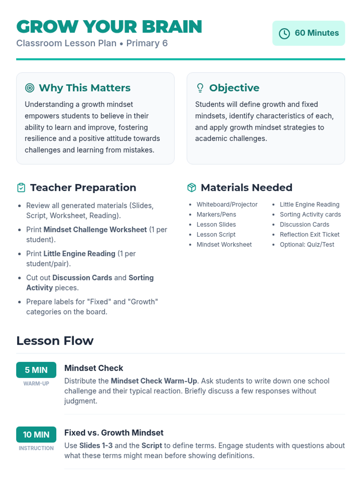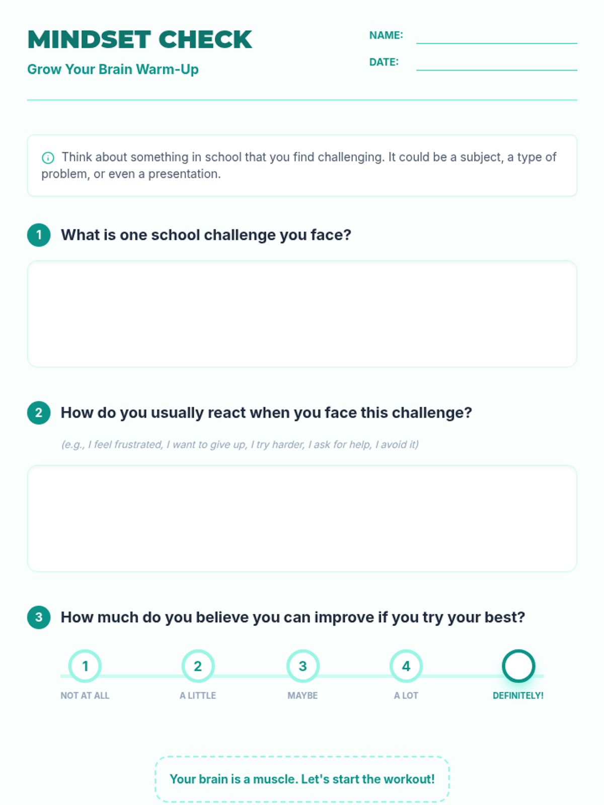 A 60-minute session for Primary 6 students that introduces the difference between a fixed and growth mindset through interactive activities, a classic story, and personal reflection. Students will learn that intelligence is like a muscle that grows with effort.