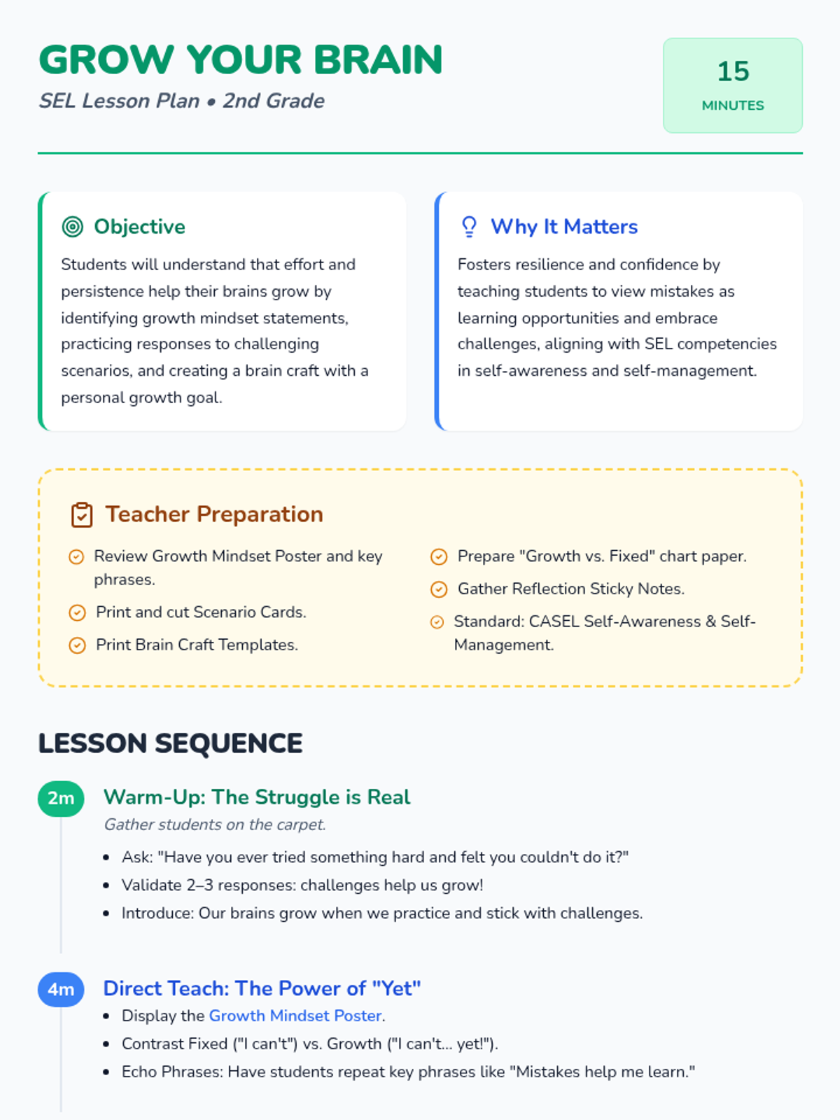 A 15-minute SEL lesson for 2nd graders to explore growth mindset through storytelling, discussion, and creative activities, focusing on the power of "yet."