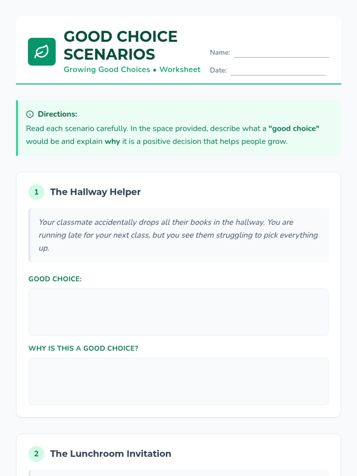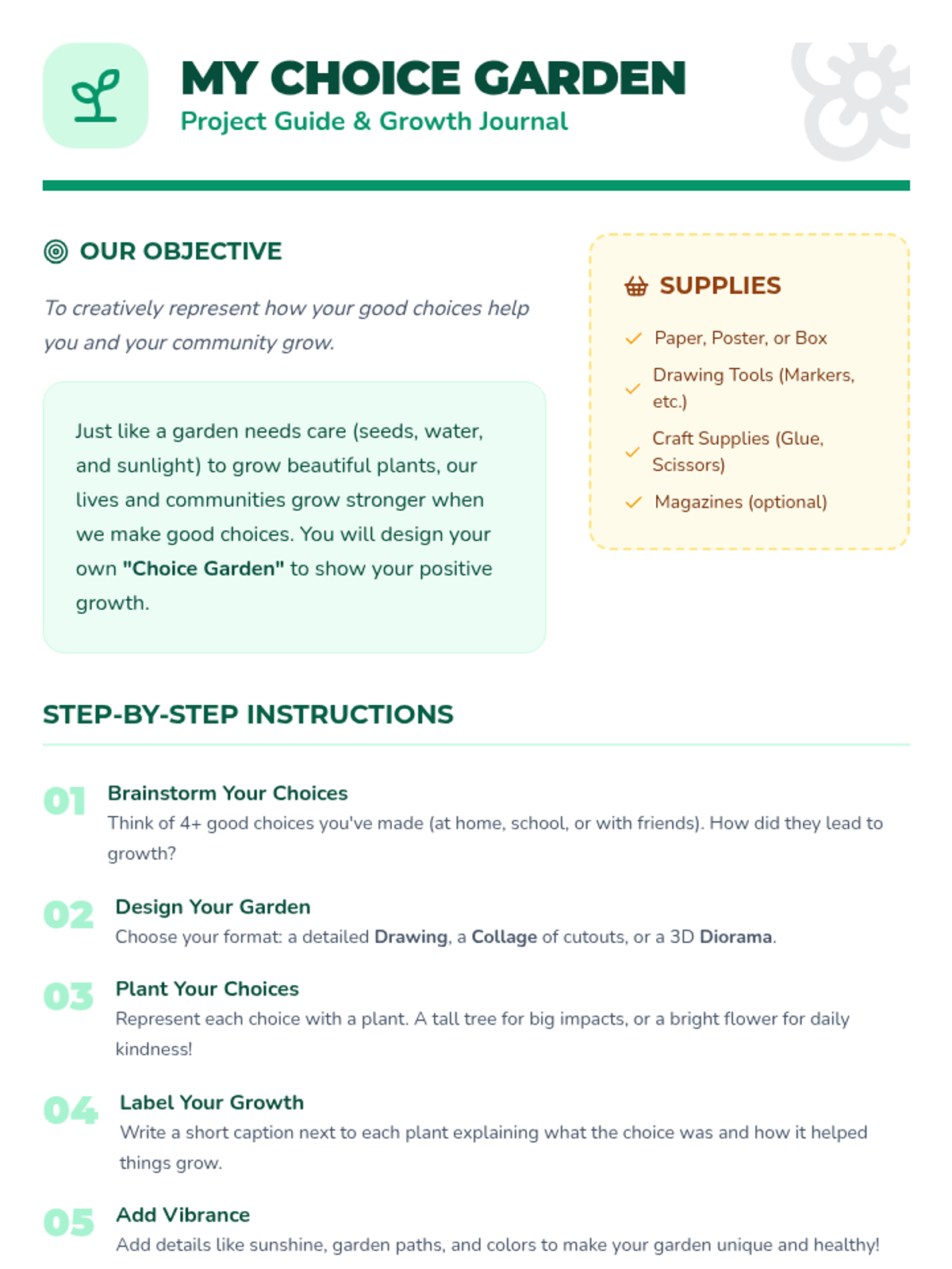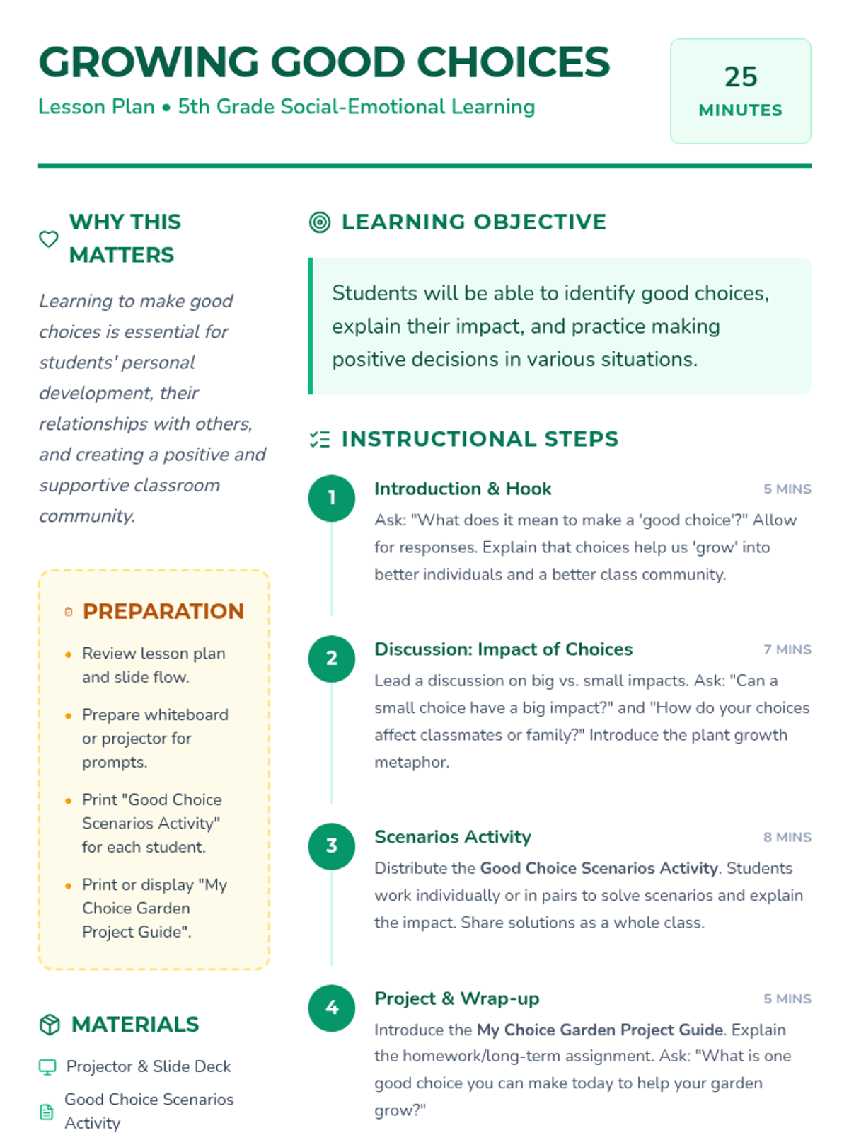A 25-minute lesson for 5th graders focused on understanding the impact of personal choices and developing strategies for positive decision-making through a growth-themed botanical metaphor.
