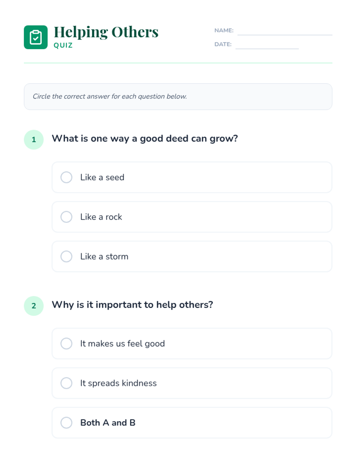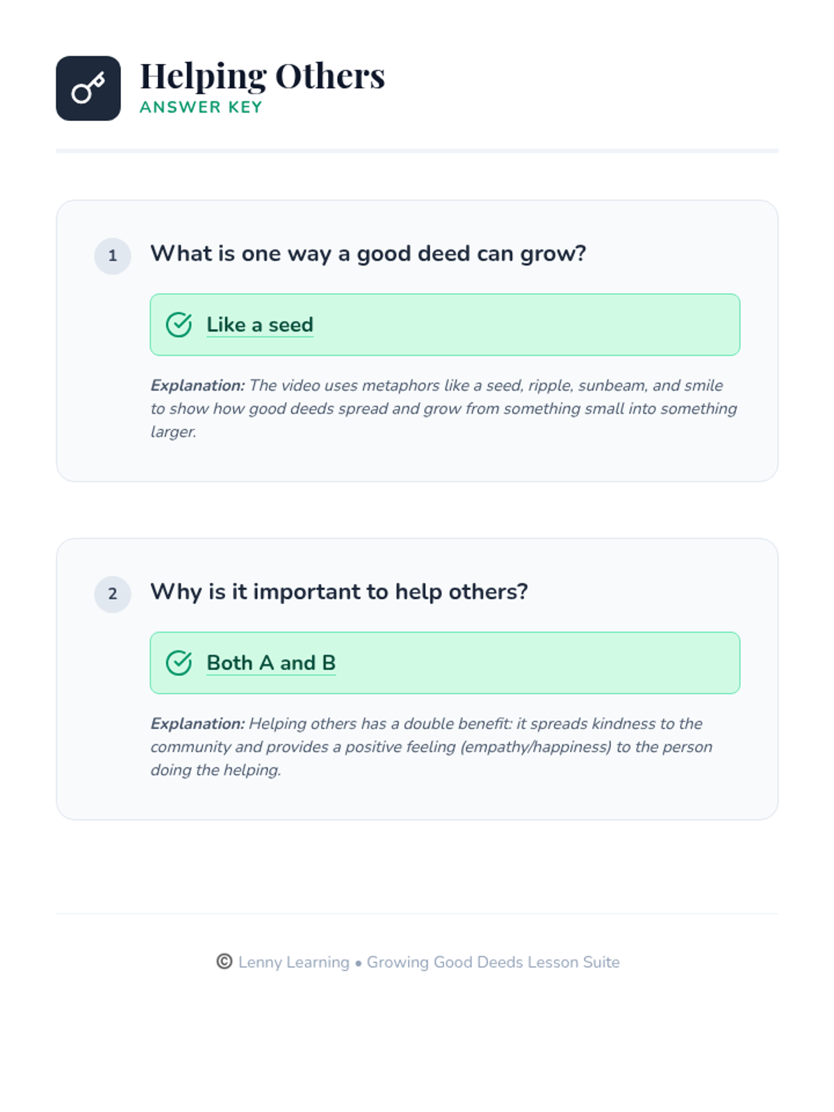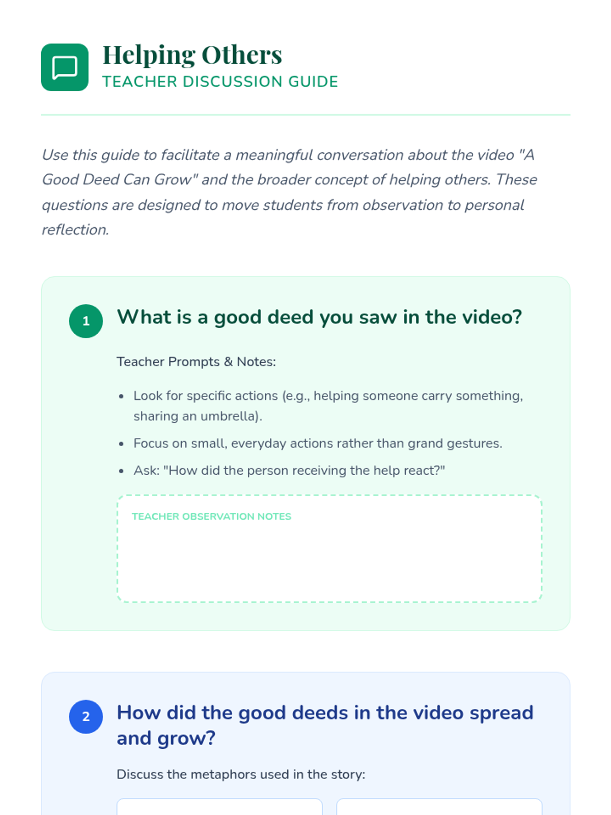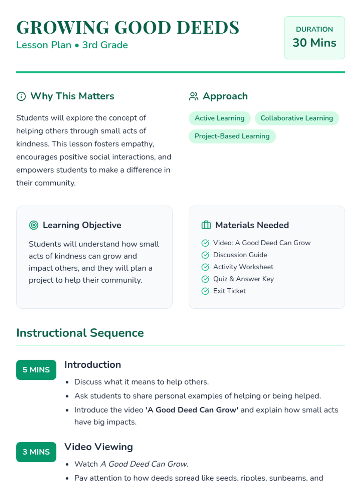Students will explore the concept of helping others through small acts of kindness. Using the video 'A Good Deed Can Grow,' students will learn how their actions can positively impact the world around them. This lesson fosters empathy, encourages positive social interactions, and empowers students to make a difference in their community.