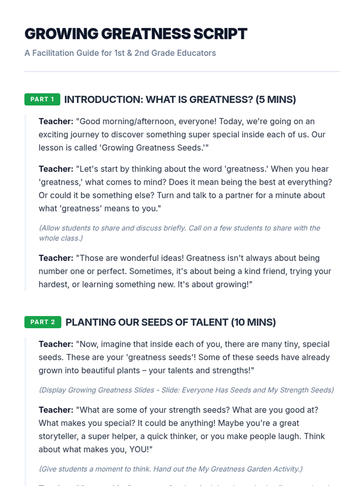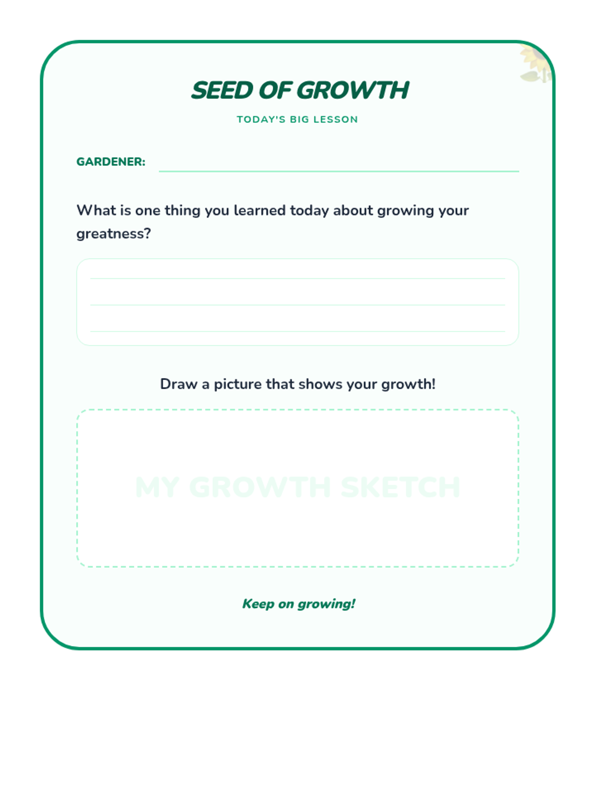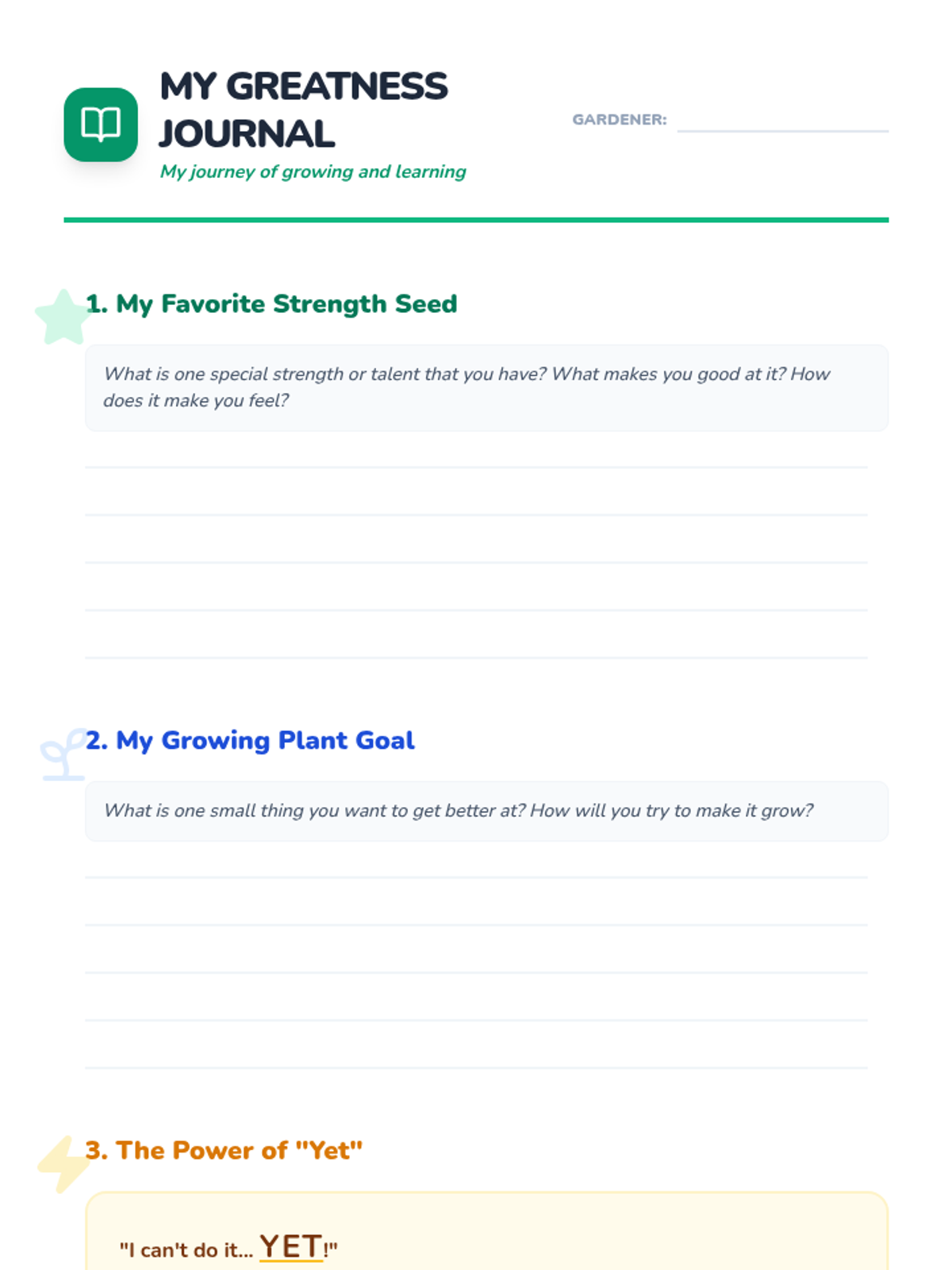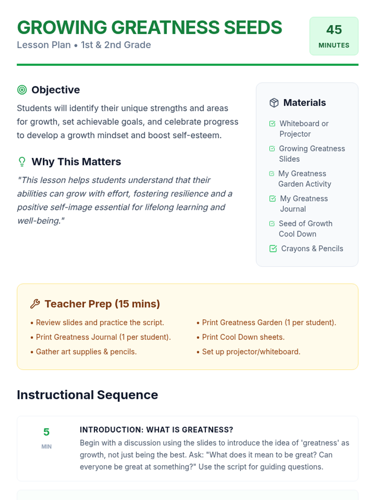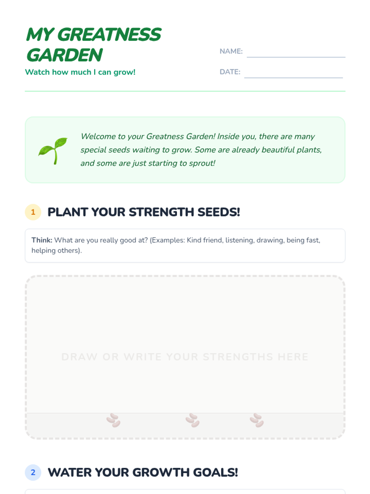 A 45-minute lesson for 1st and 2nd graders to help them recognize their unique talents and set small goals for improvement using a garden metaphor. Students will identify 'strength seeds,' set growth goals, and practice a growth mindset through interactive activities and journaling.