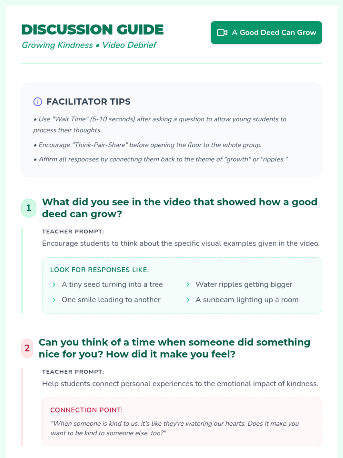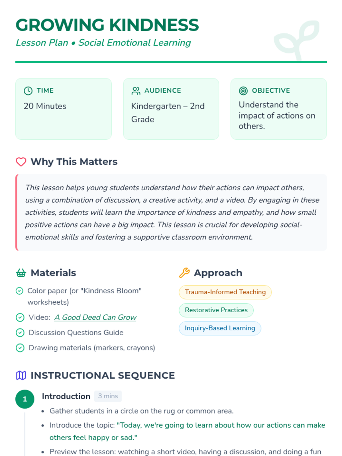 This lesson helps young students understand how their actions can impact others through a video, discussion, and a creative 'Kindness Garden' activity. Students learn that small positive actions grow into a supportive classroom environment.