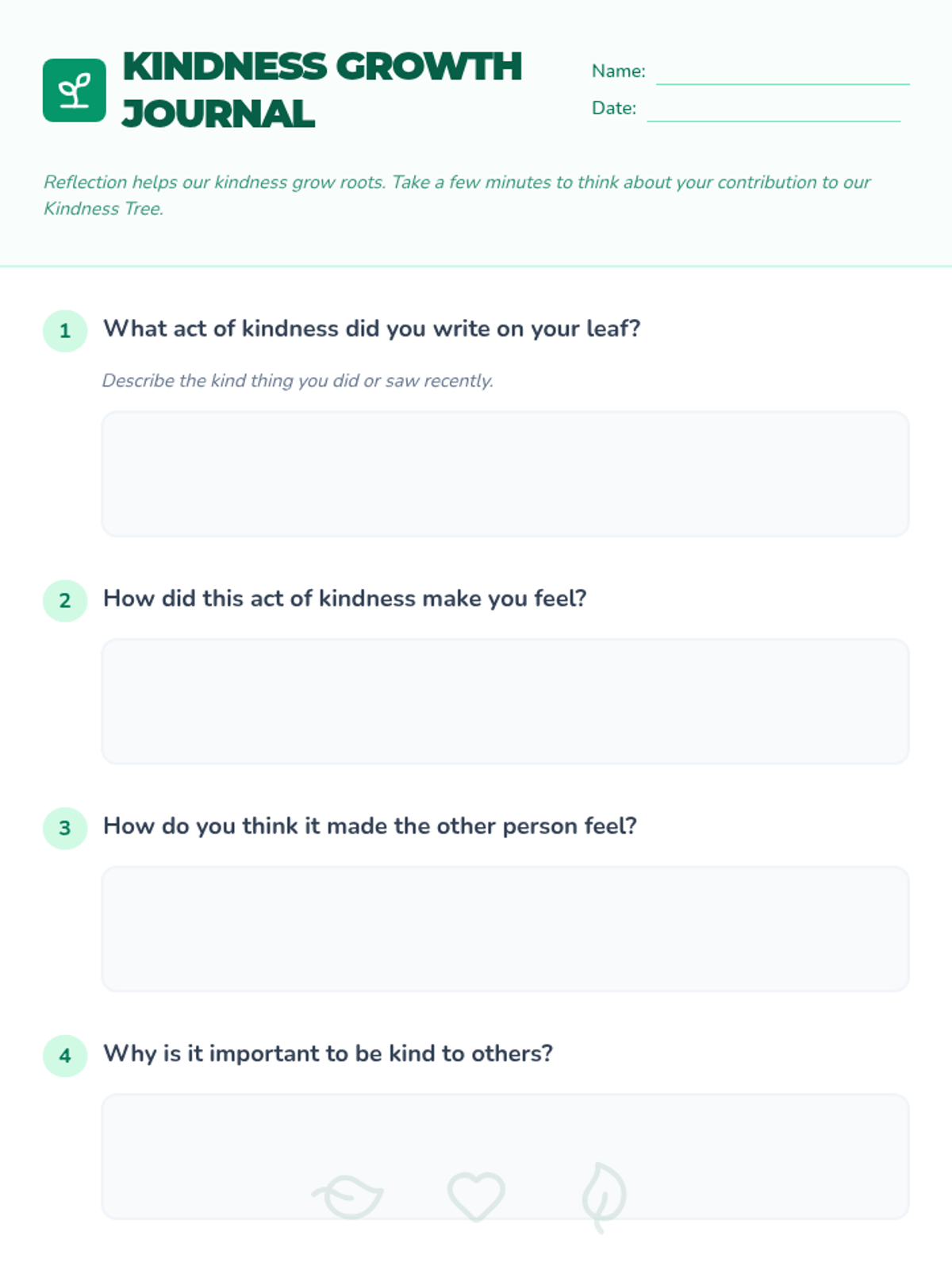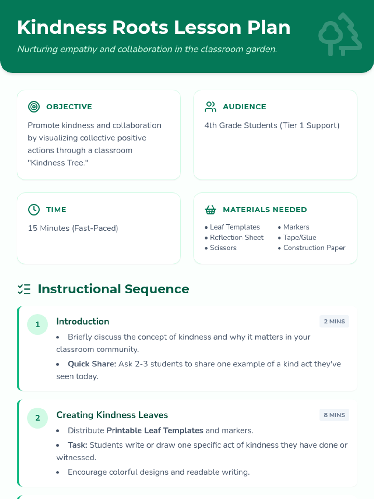 A quick, 15-minute interactive lesson where 4th-grade students create a classroom Kindness Tree by sharing acts of kindness they have witnessed or performed. This activity fosters a culture of empathy and collaboration through a collective visual project.
