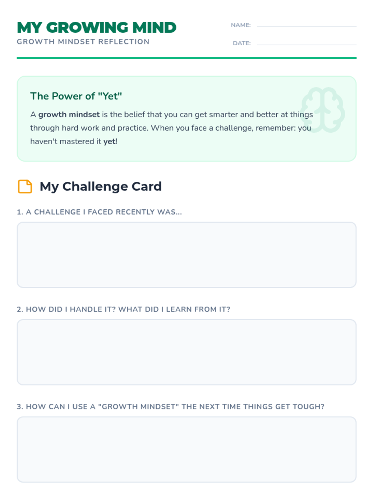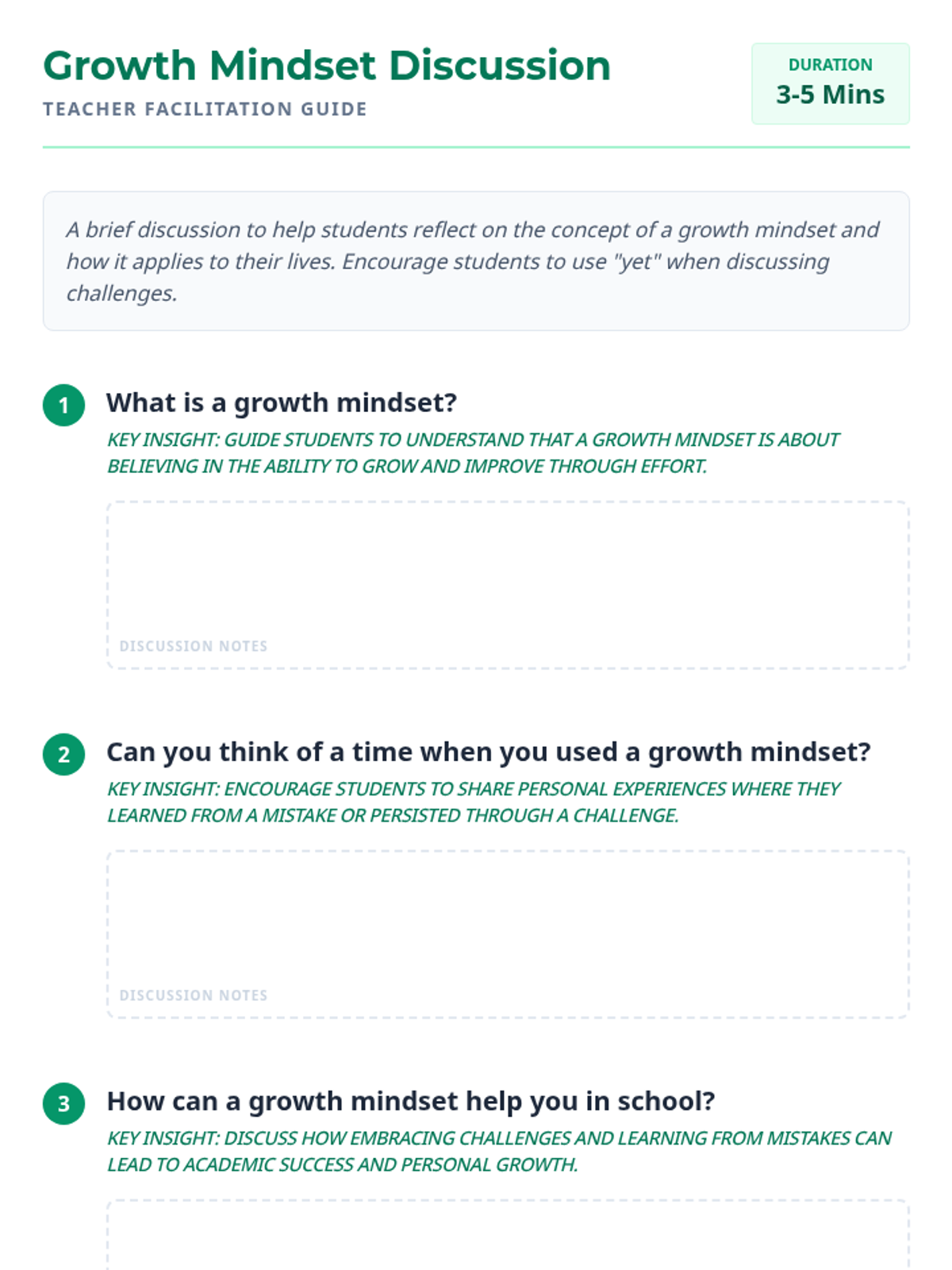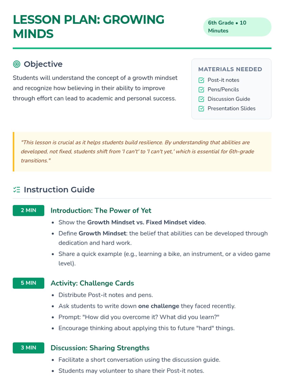 This lesson introduces 6th graders to the concept of a growth mindset, emphasizing the importance of embracing challenges and learning from mistakes. Students will learn that abilities can be developed through dedication and hard work, fostering resilience and a love for learning.