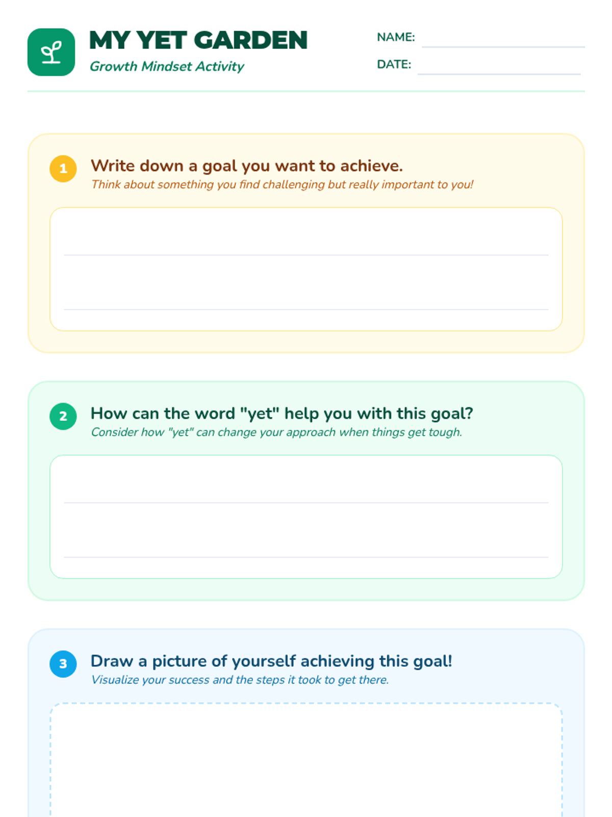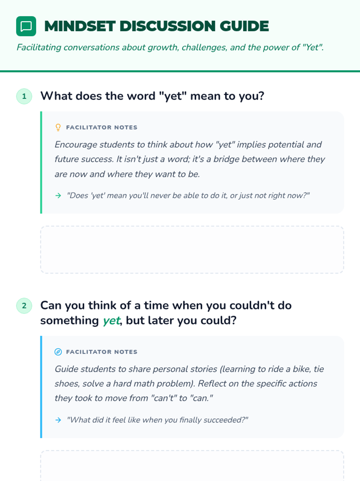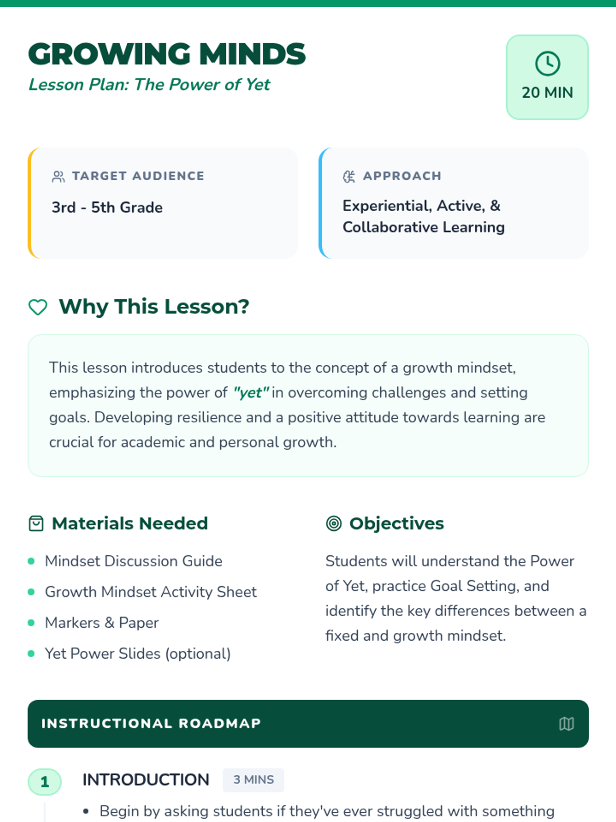 This lesson introduces students to the concept of a growth mindset, emphasizing the power of 'yet' in overcoming challenges and setting goals. Students will learn to shift from a fixed mindset to a growth mindset through interactive discussions and creative goal-setting.