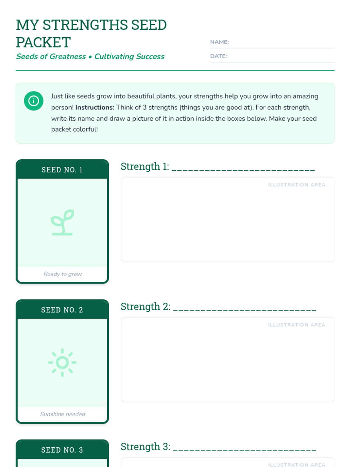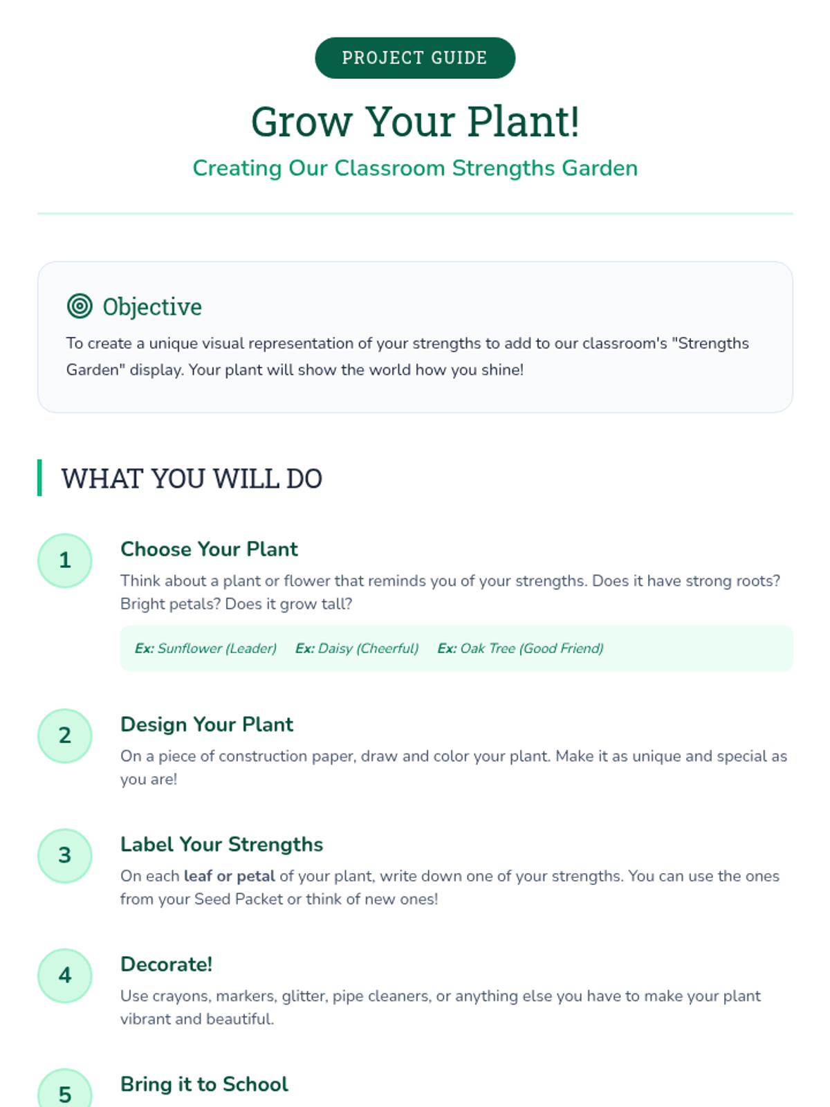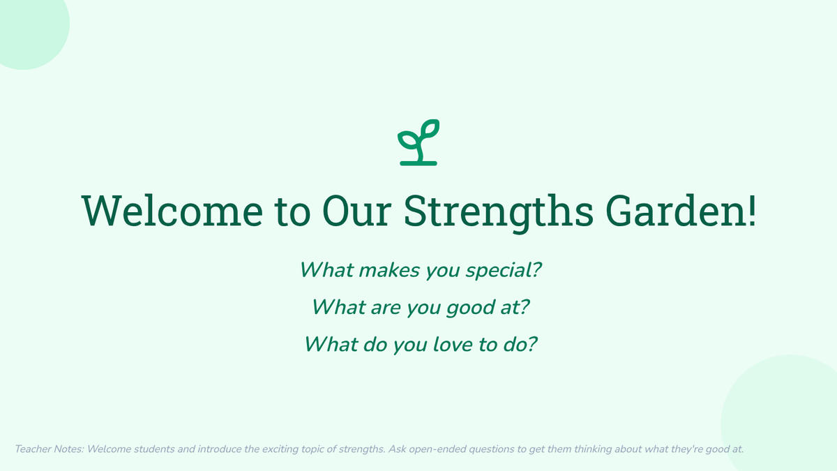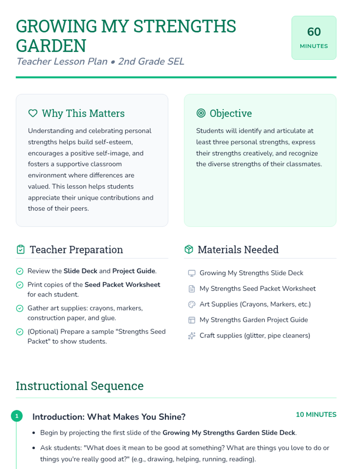 A social-emotional learning lesson for 2nd graders focused on identifying personal strengths using a garden metaphor. Students create 'seed packets' of their talents and plan a creative project to 'grow' their strengths into a class garden display.