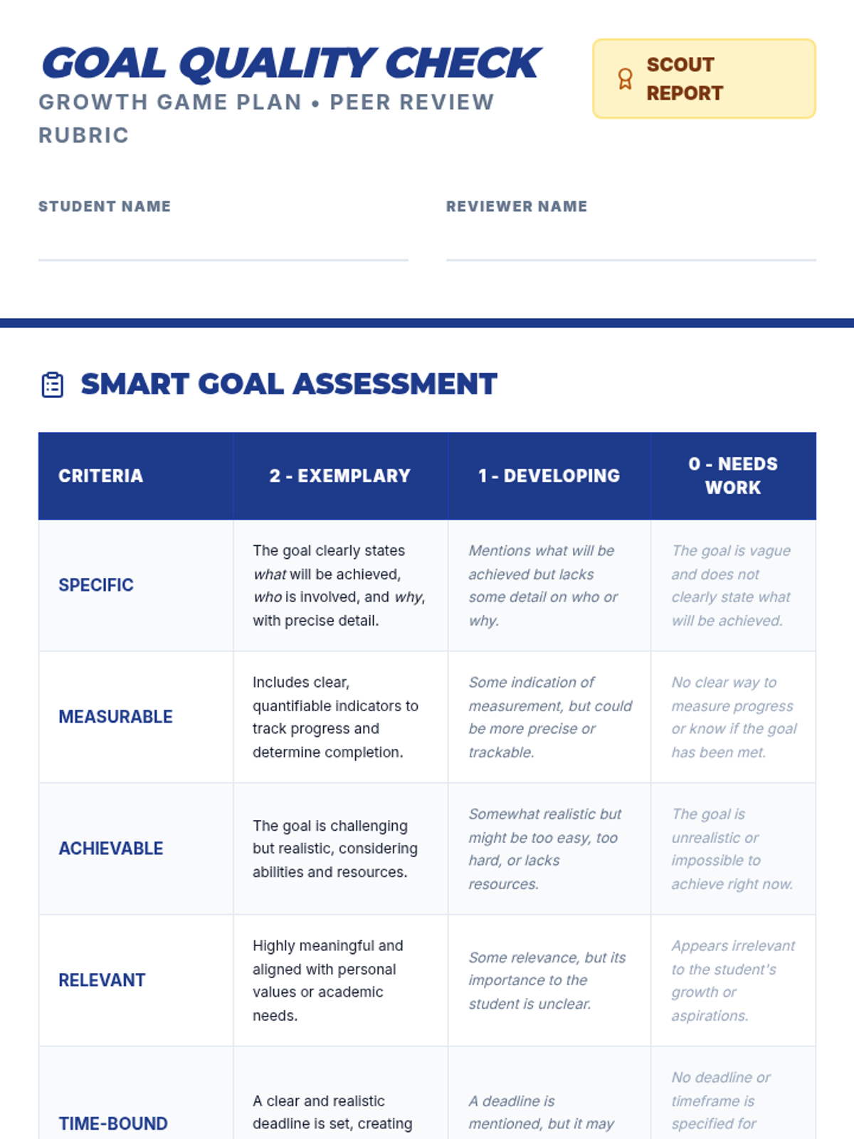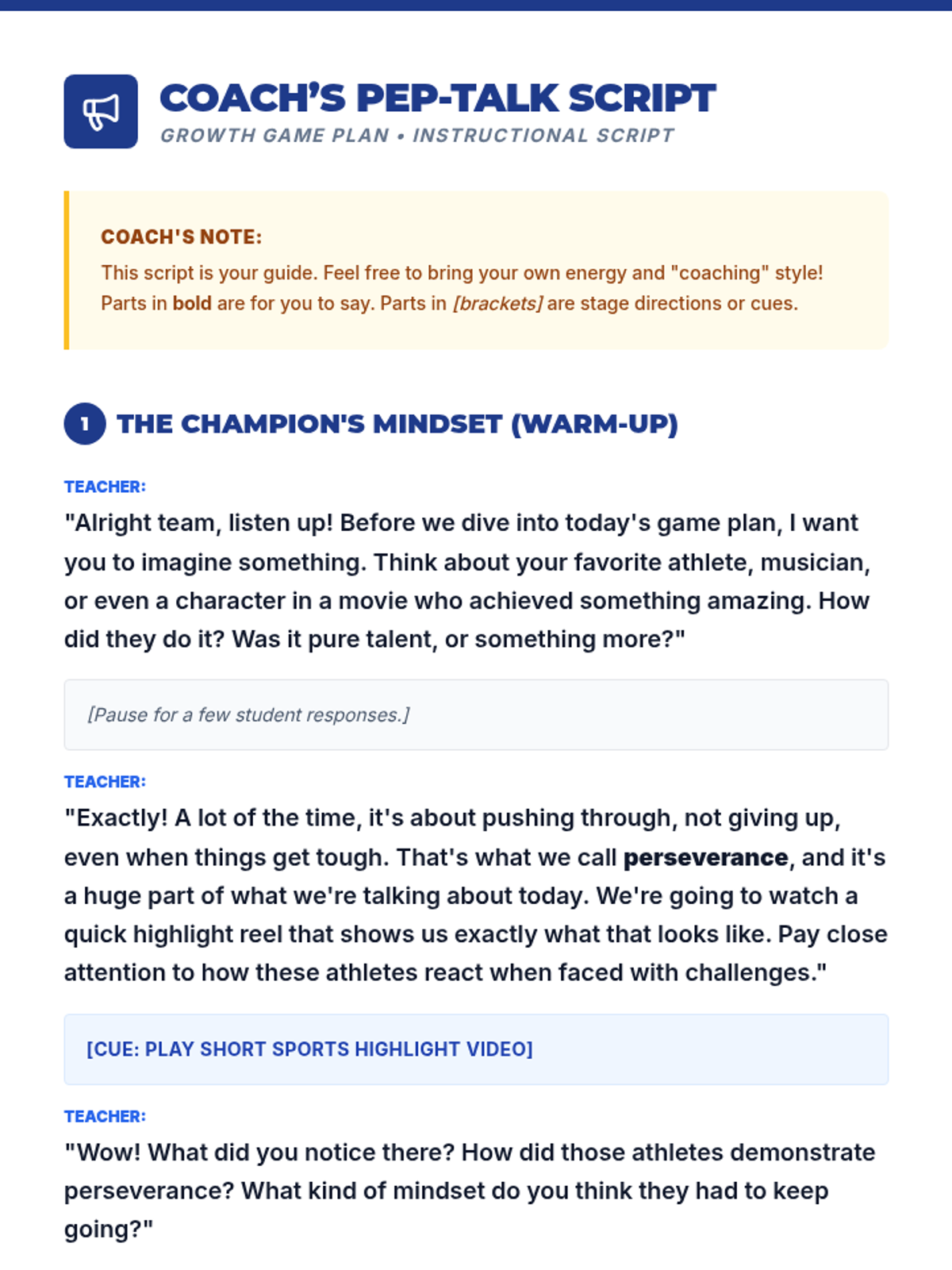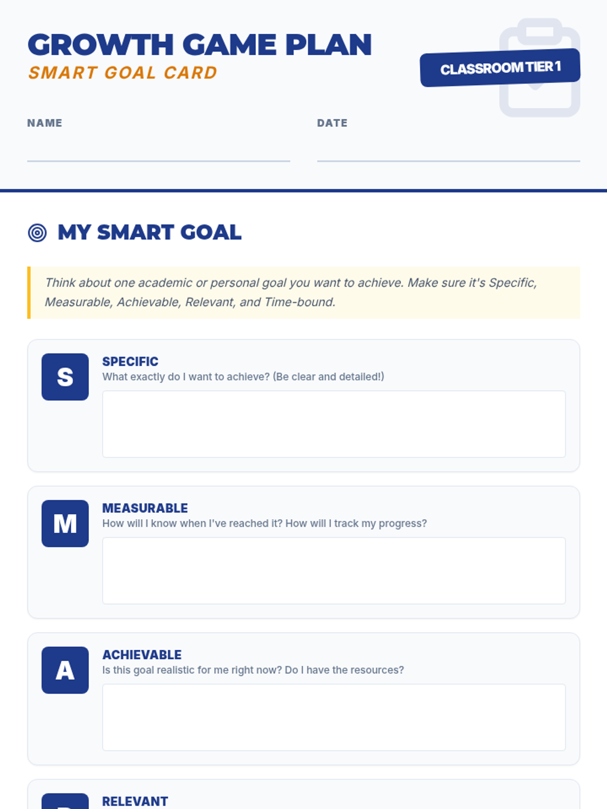 A high-energy, sports-themed lesson where students master the art of goal setting using the SMART framework and develop a 'Perseverance Playbook' to overcome obstacles. Students will draft, peer-review, and commit to personal or academic growth targets.