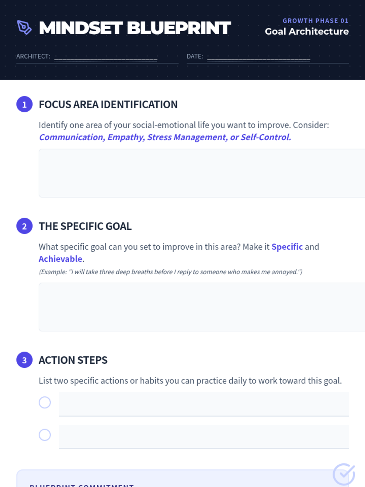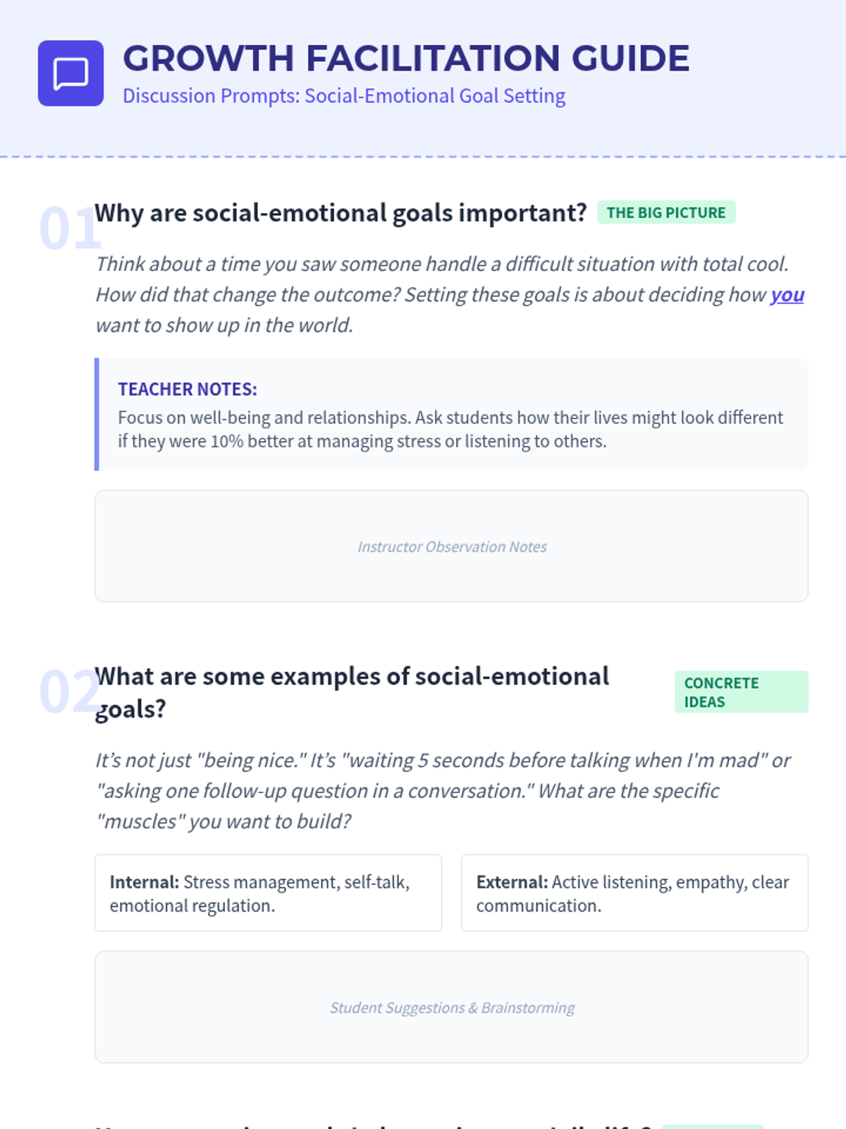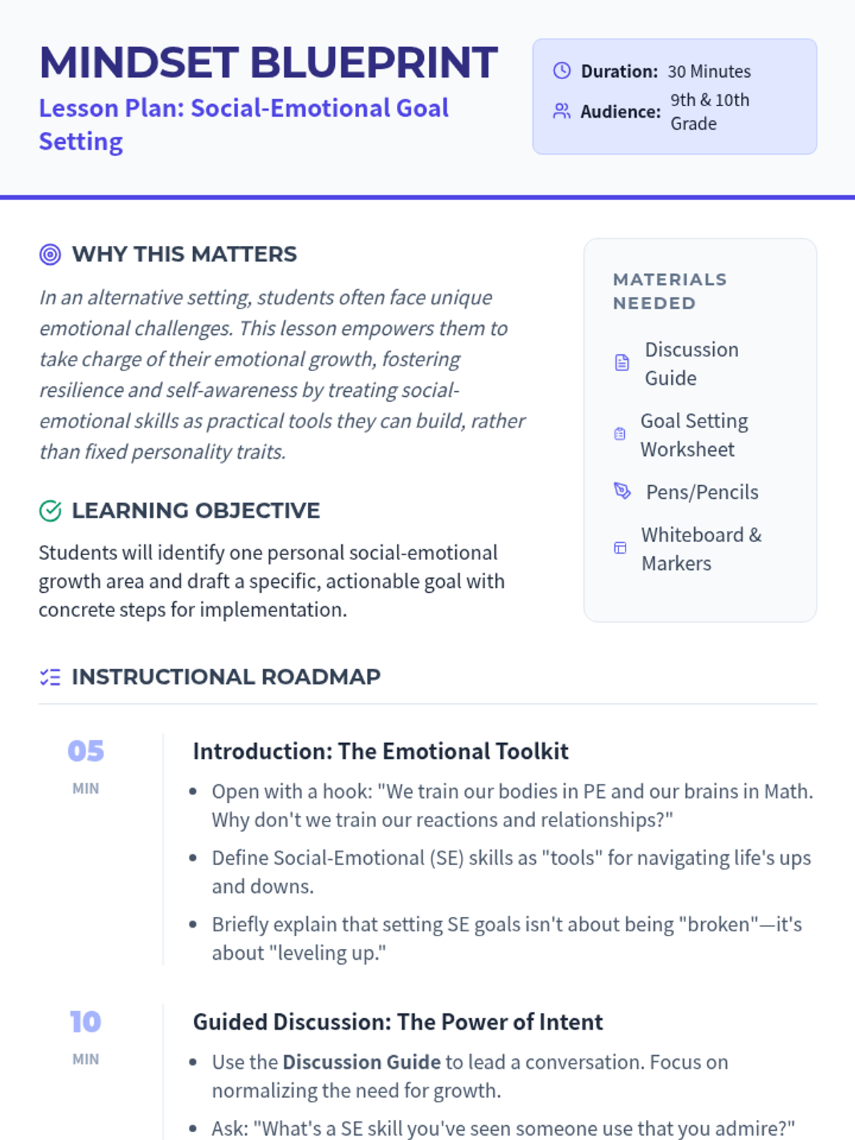 This lesson is designed to help 9th and 10th graders in an alternative classroom setting understand and set social-emotional goals. Through a guided discussion and a worksheet activity, students will explore the importance of social-emotional skills and how setting personal goals can enhance their well-being and interpersonal relationships.