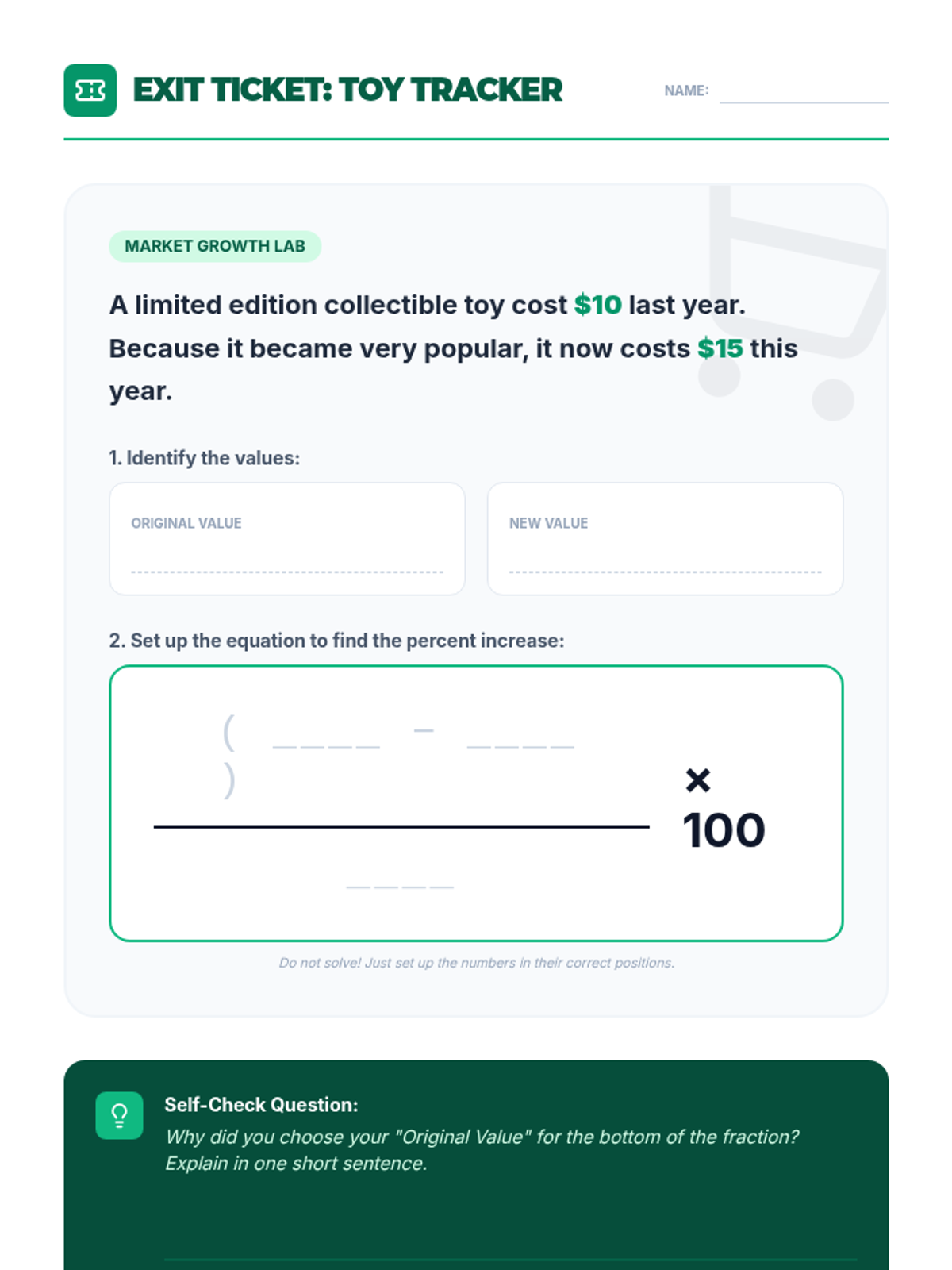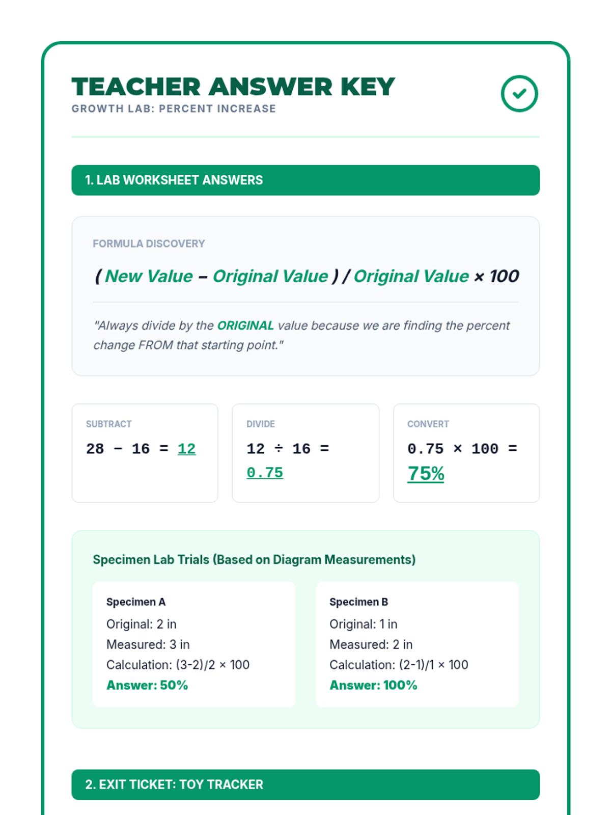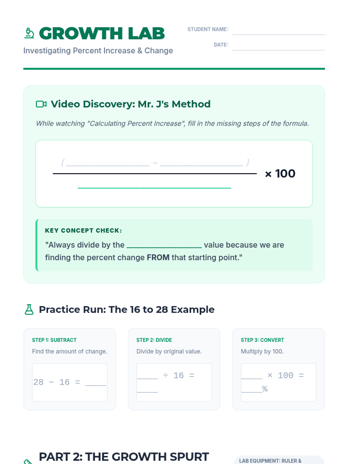 A comprehensive 6th-grade math lesson on calculating percent increase, featuring a video-guided discovery of the formula and a 'Growth Spurt' measurement activity. Students learn to find the amount of change and divide by the original value to track growth over time.