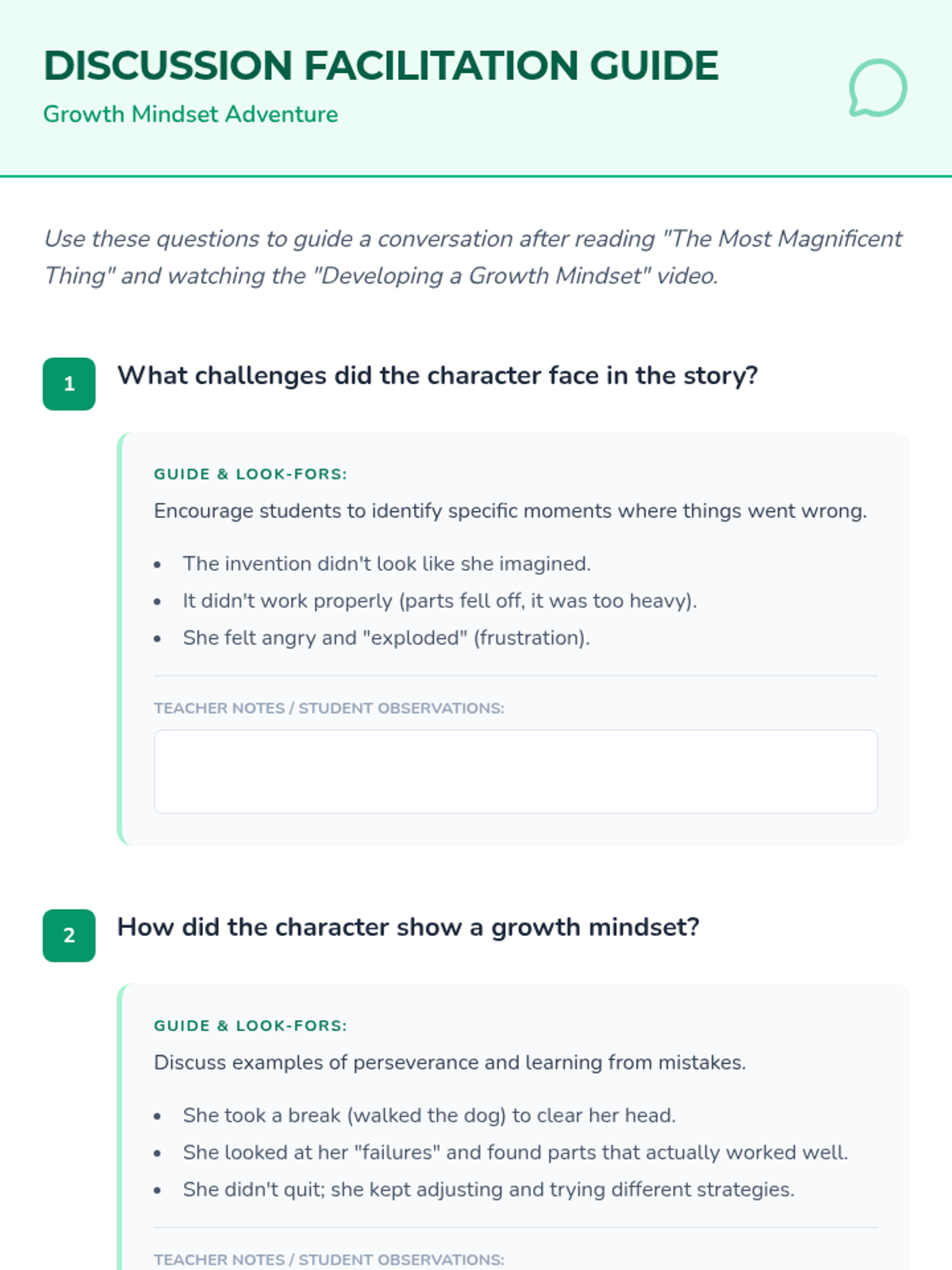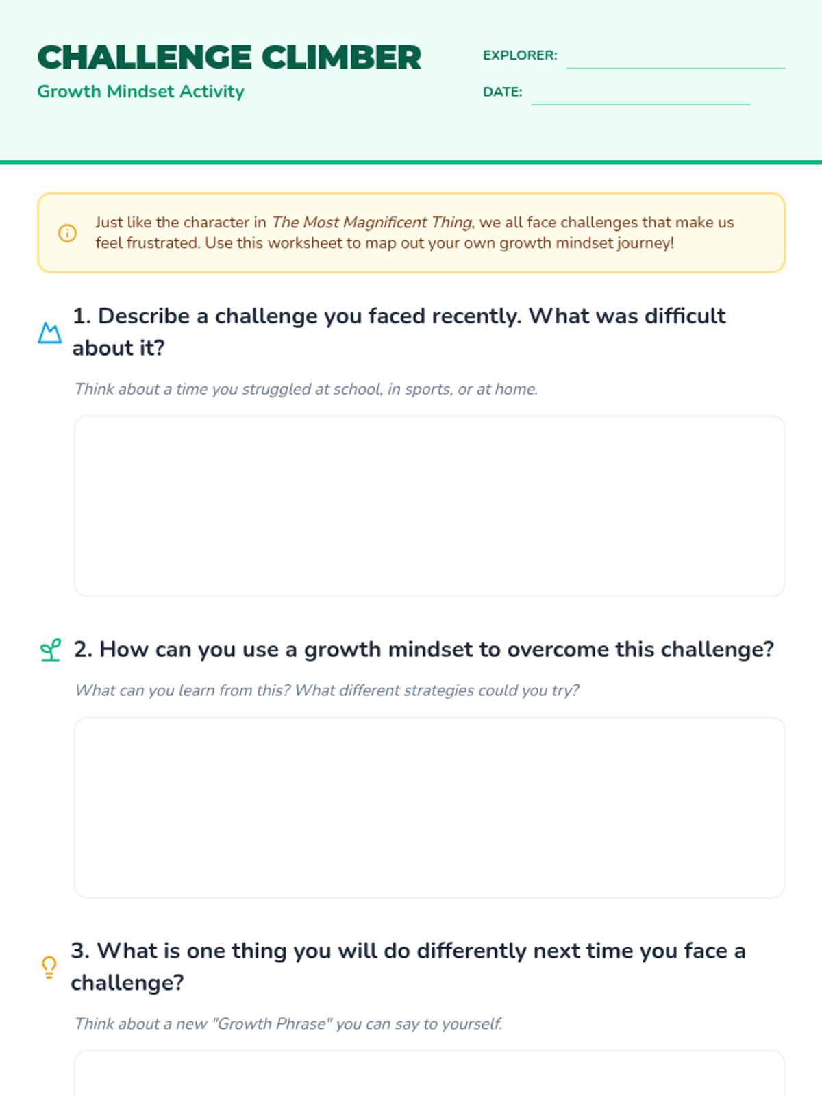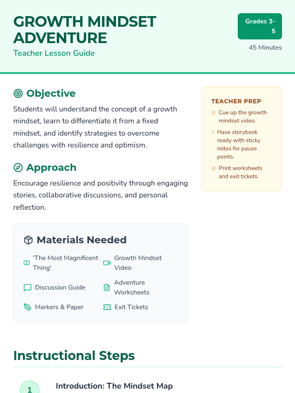 A comprehensive lesson designed for Grades 3-5 to introduce and reinforce growth mindset through storytelling, discussion, and reflective activities. Students will learn to embrace challenges, value effort, and view mistakes as learning opportunities.