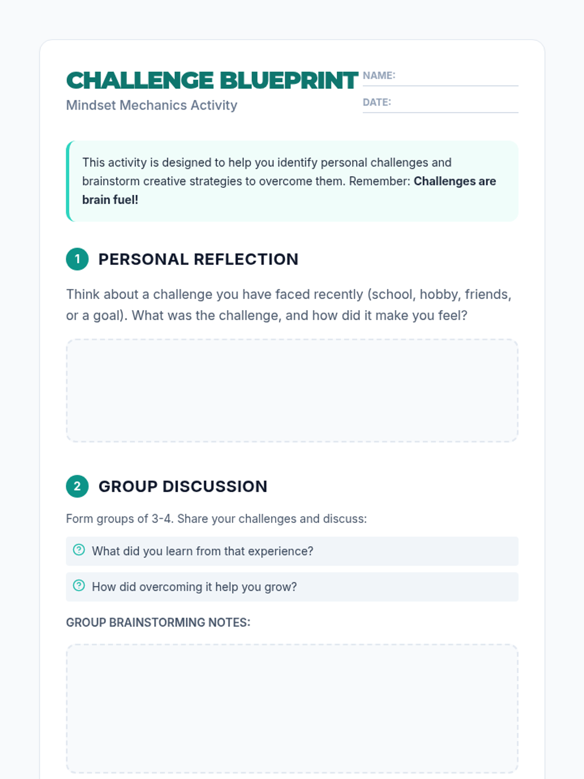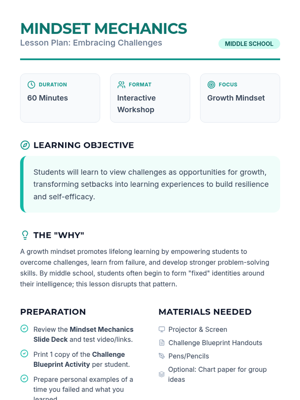A 60-minute lesson for middle schoolers to develop a growth mindset by reframing challenges as learning opportunities and building resilience.