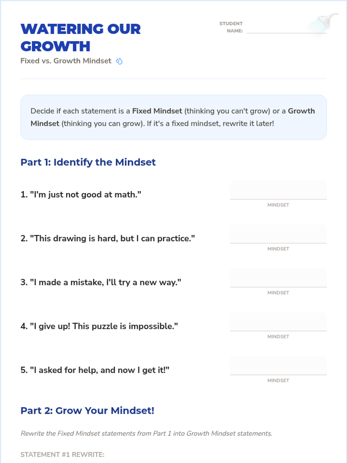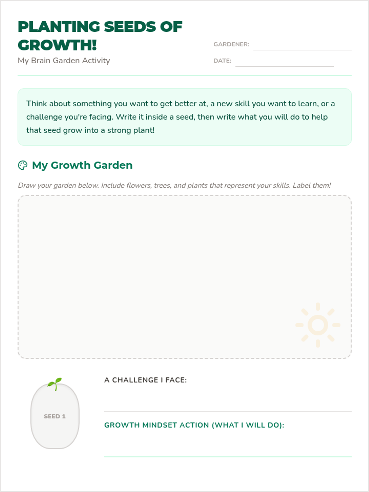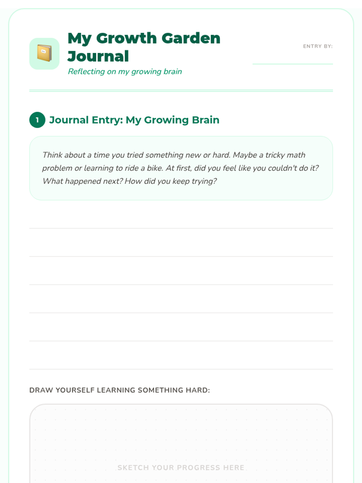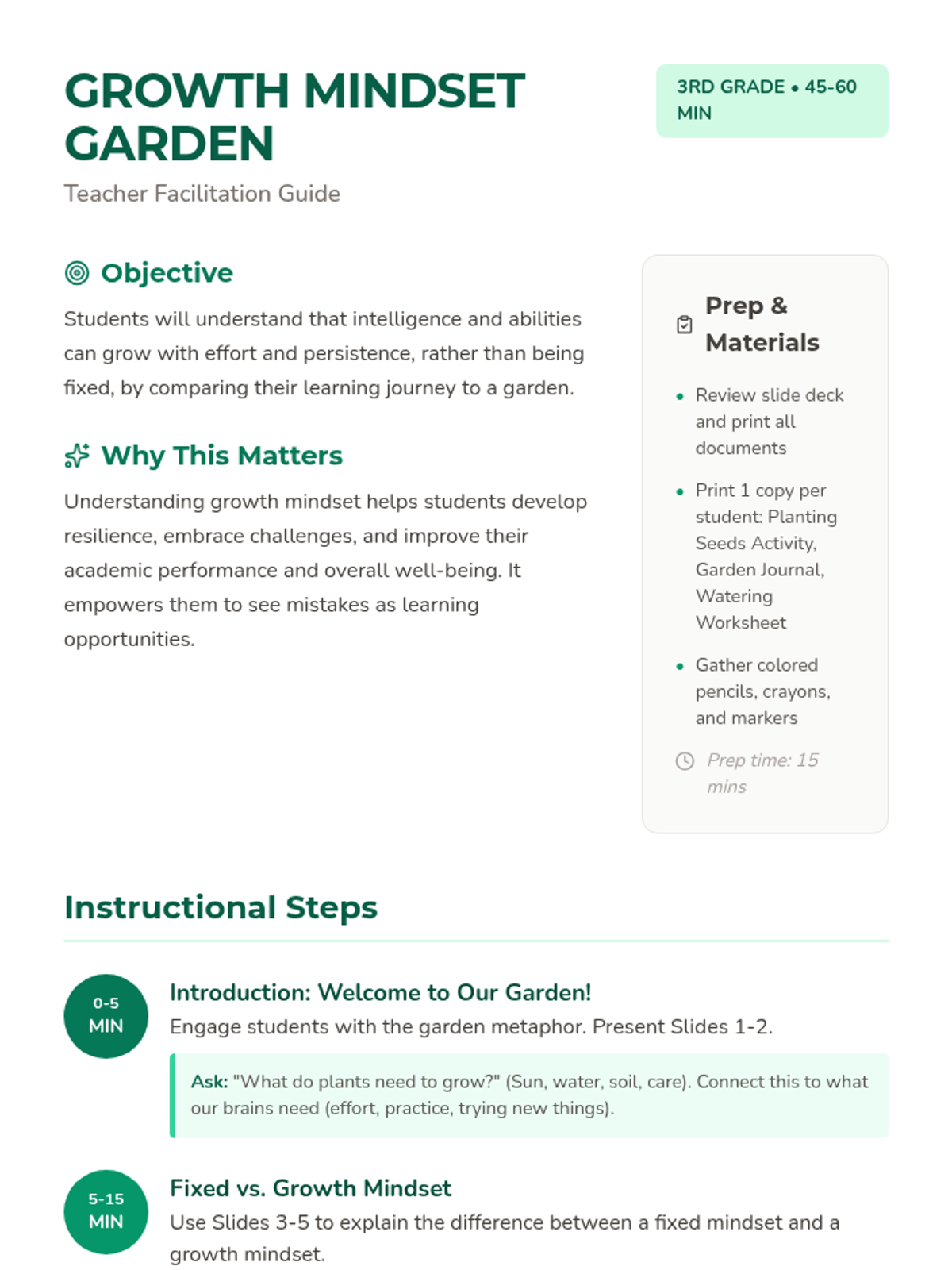 An imaginative lesson for 3rd graders comparing the learning journey to a garden to teach the power of a growth mindset. Students learn to reframe challenges as opportunities and understand that effort leads to growth.