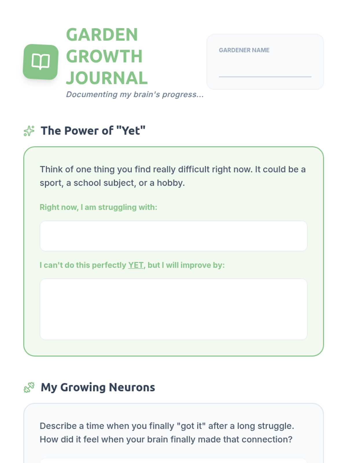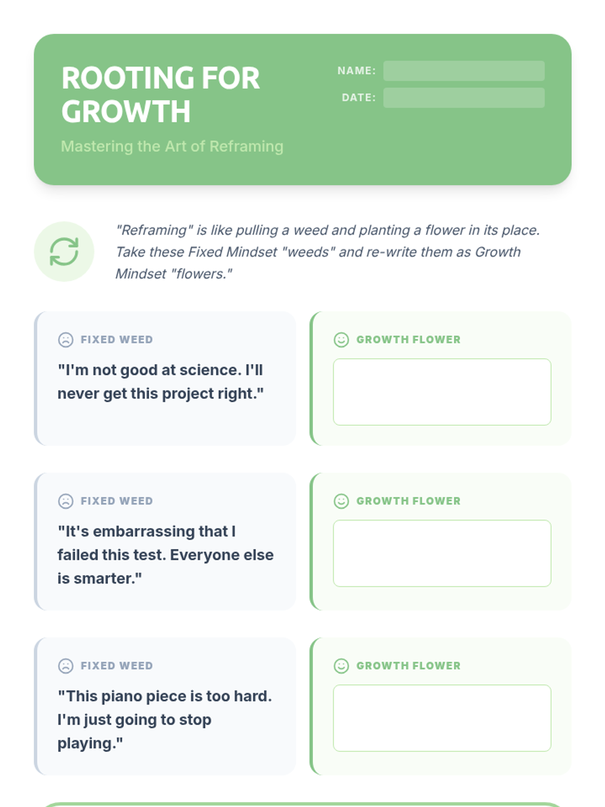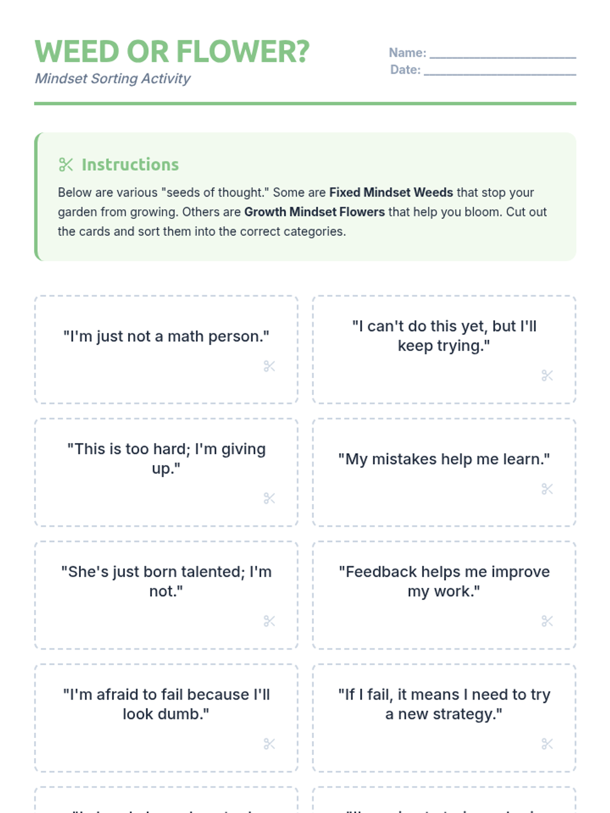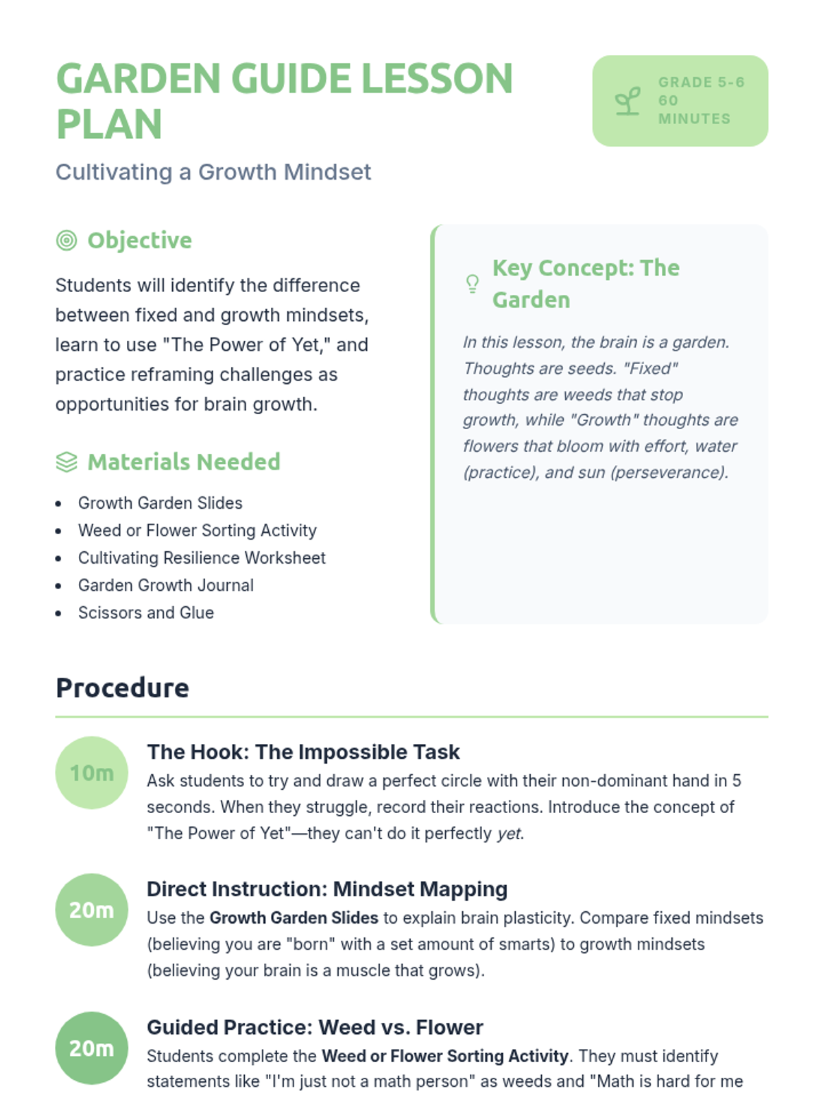This lesson helps 5th and 6th graders understand growth mindset through a garden metaphor, teaching them to reframe challenges and embrace the 'power of yet'. students will learn to identify fixed mindset 'weeds' and cultivate growth mindset 'flowers'.