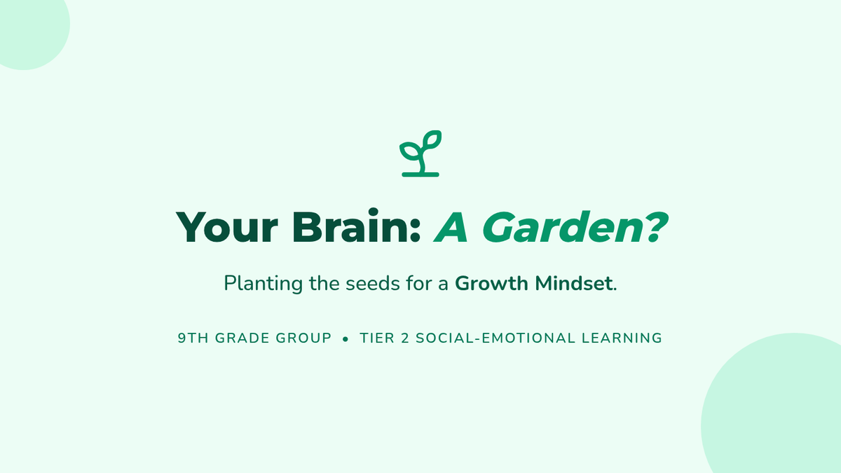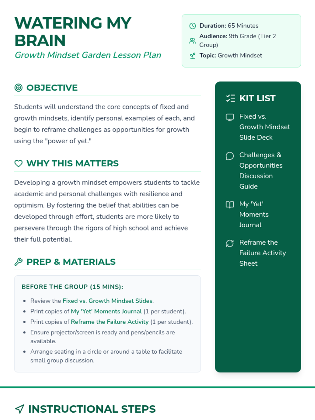 A small-group lesson for 9th graders focused on developing a growth mindset through the metaphor of a garden. Students explore fixed vs. growth mindsets, the power of 'yet', and strategies for reframing failures as learning opportunities.