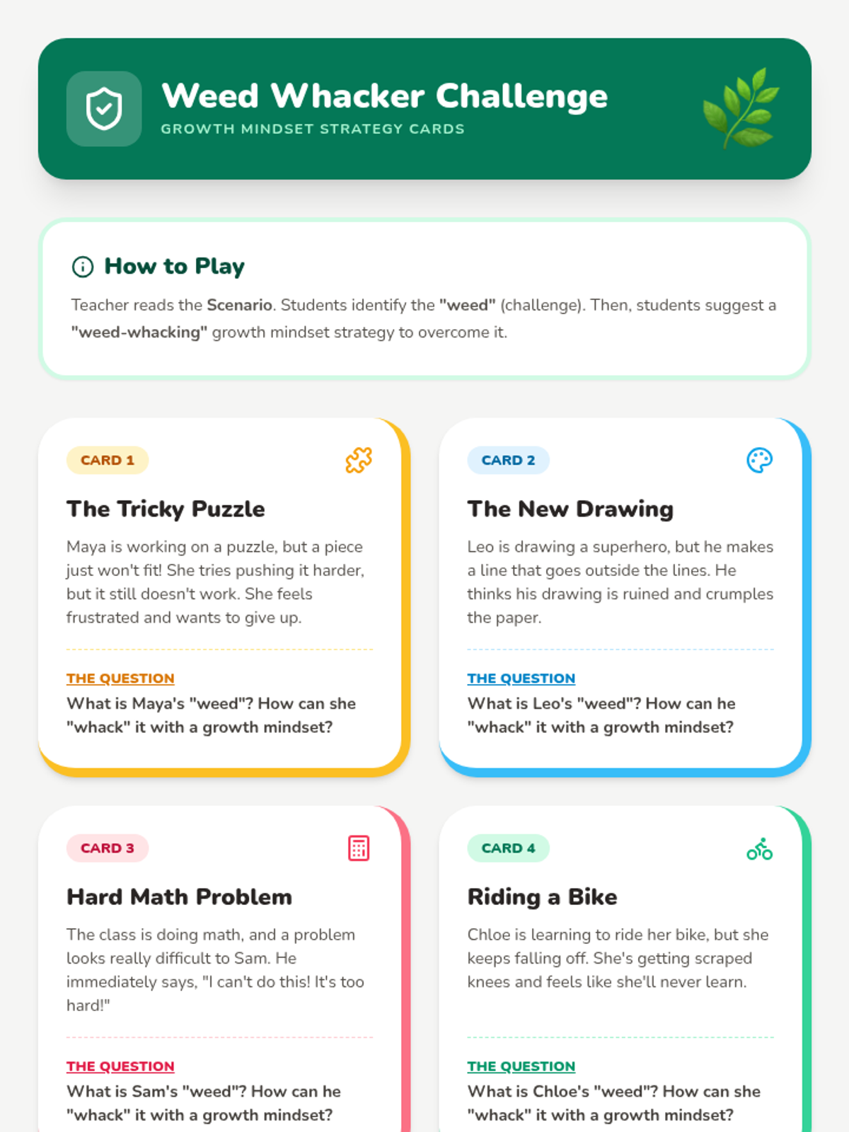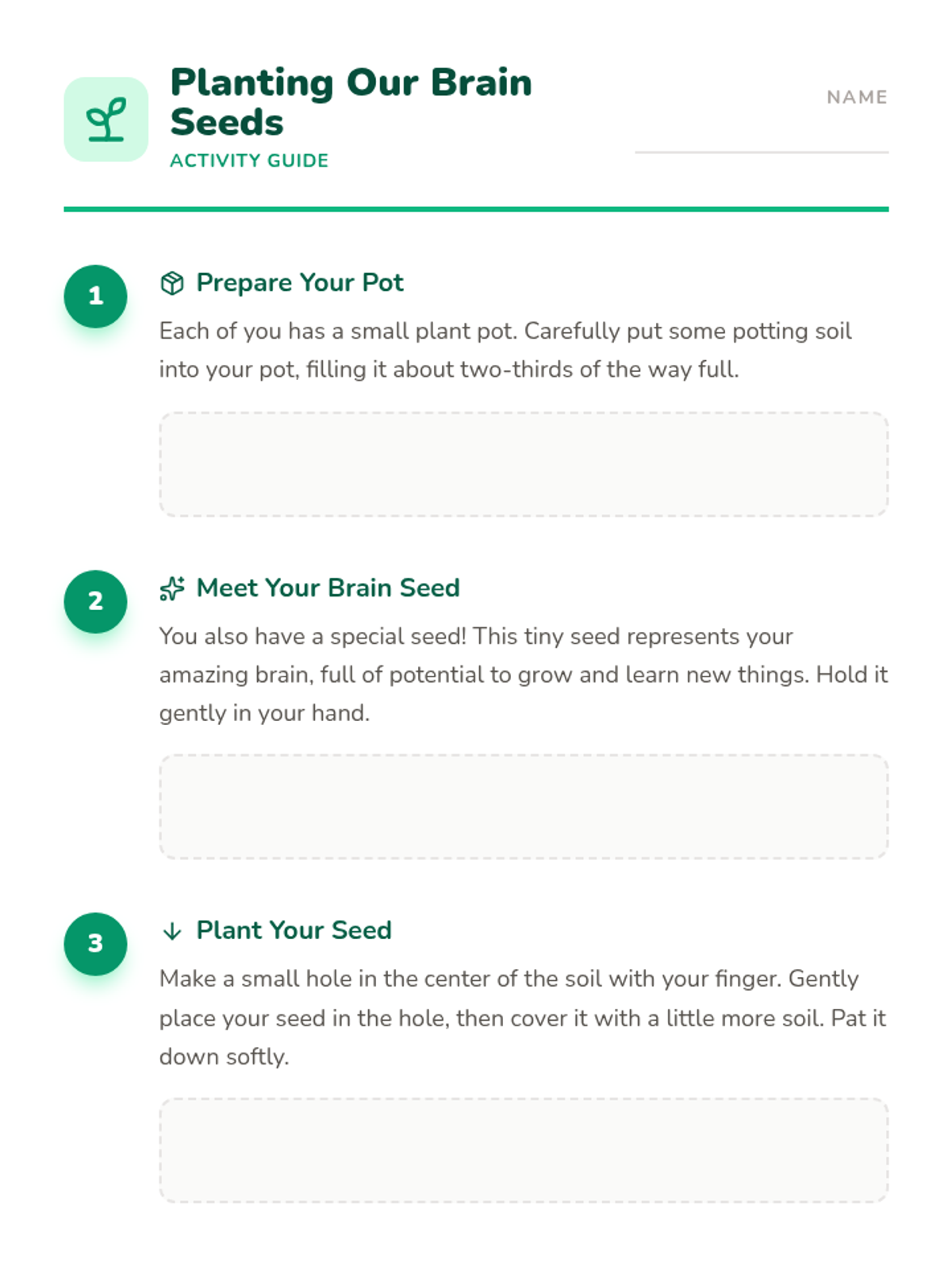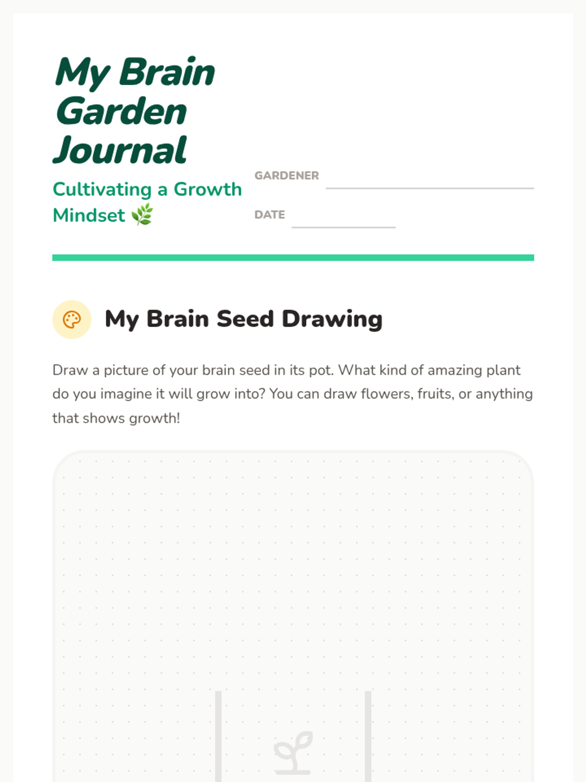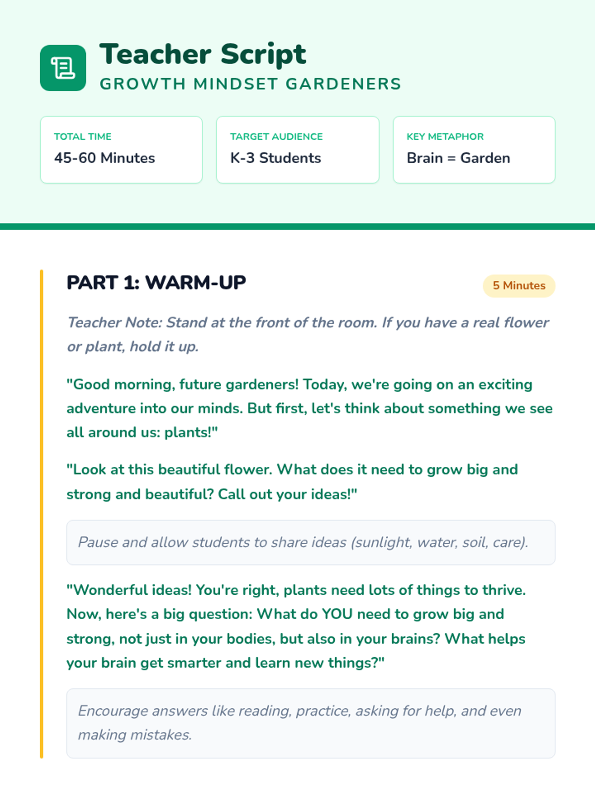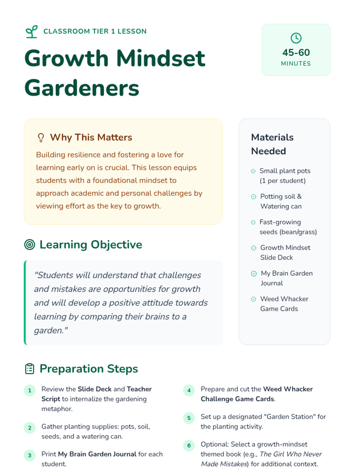 A gardening-themed lesson for K-3 students to cultivate a growth mindset. Students learn that challenges are like 'weeds' that help them grow and that effort makes their 'brain plants' blossom through storytelling, journaling, and a hands-on planting activity.