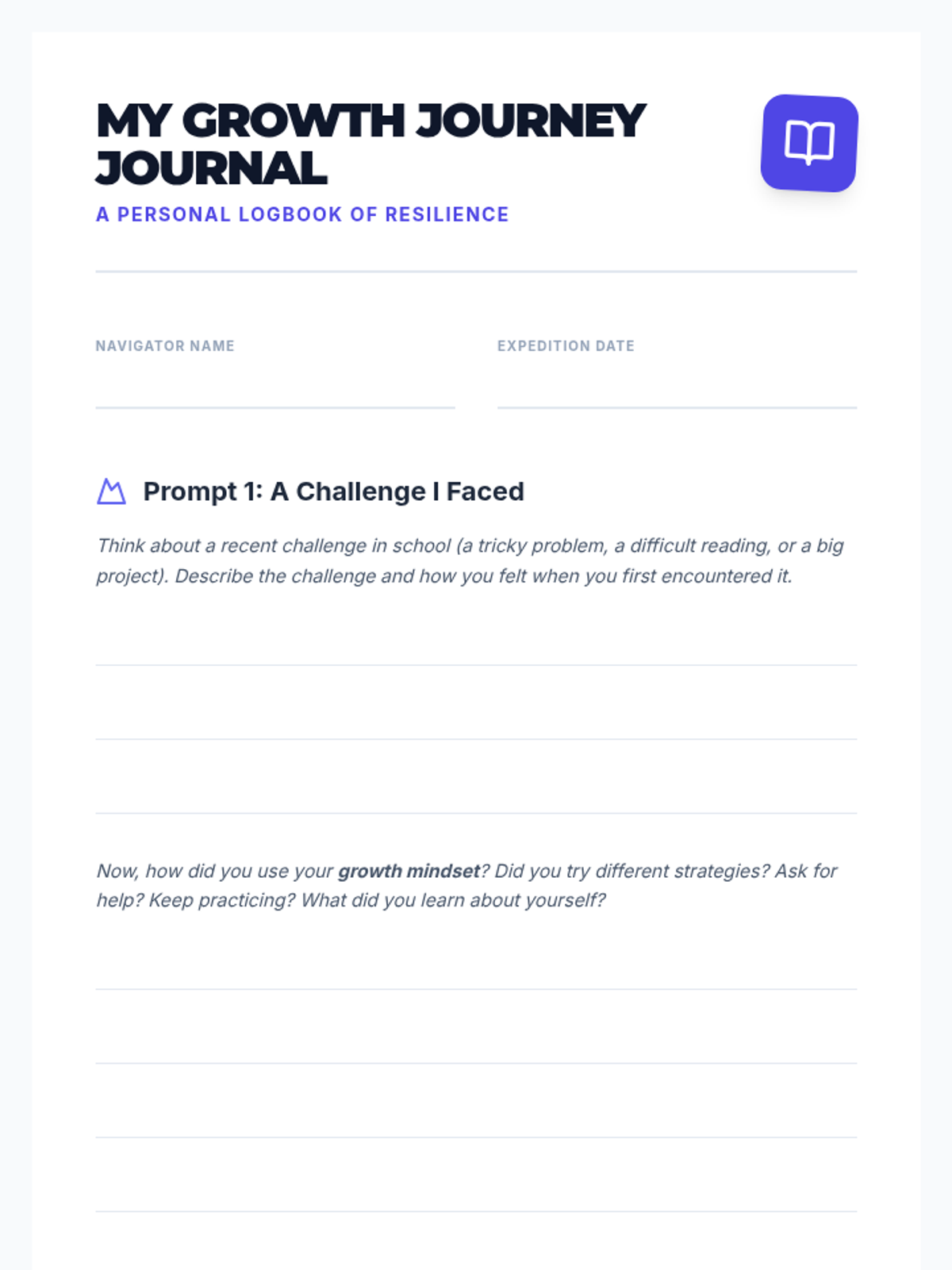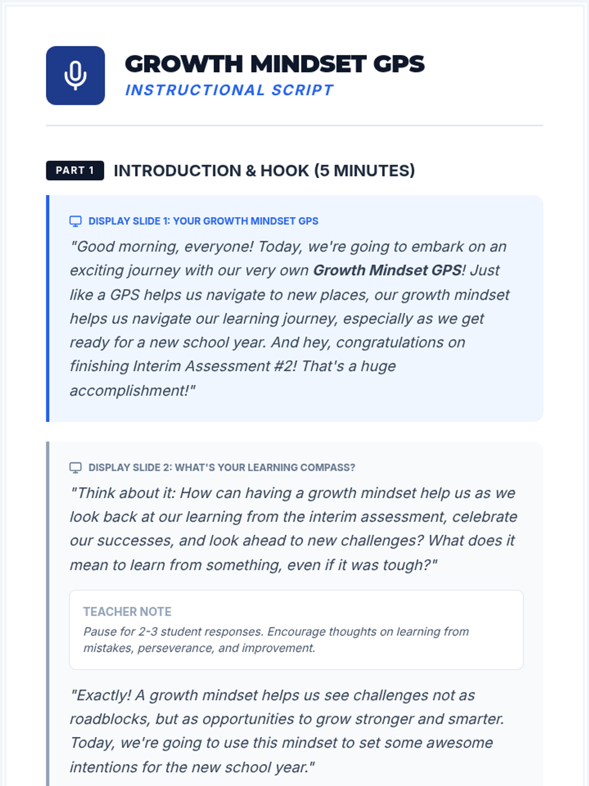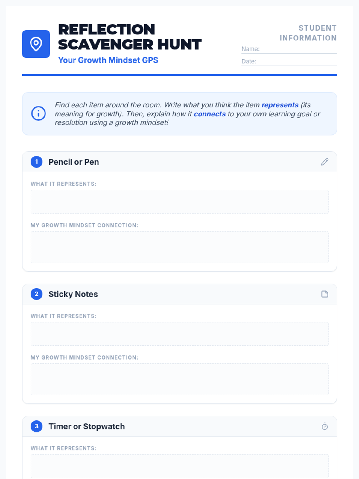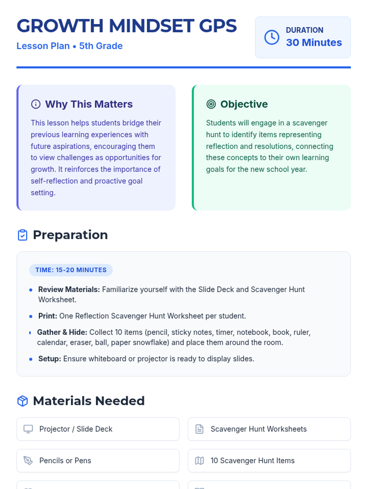 This interactive 30-minute lesson for 5th-grade students encourages reflection on past learning and the application of a growth mindset for future goals through a hands-on scavenger hunt.