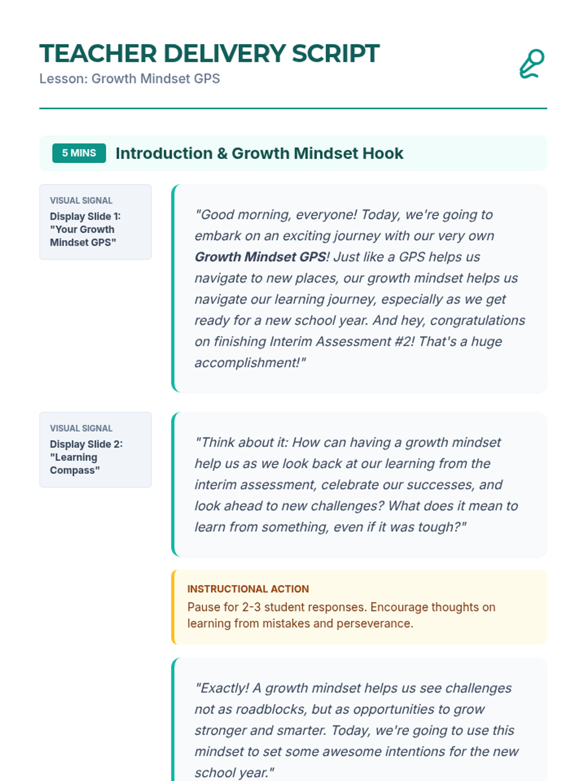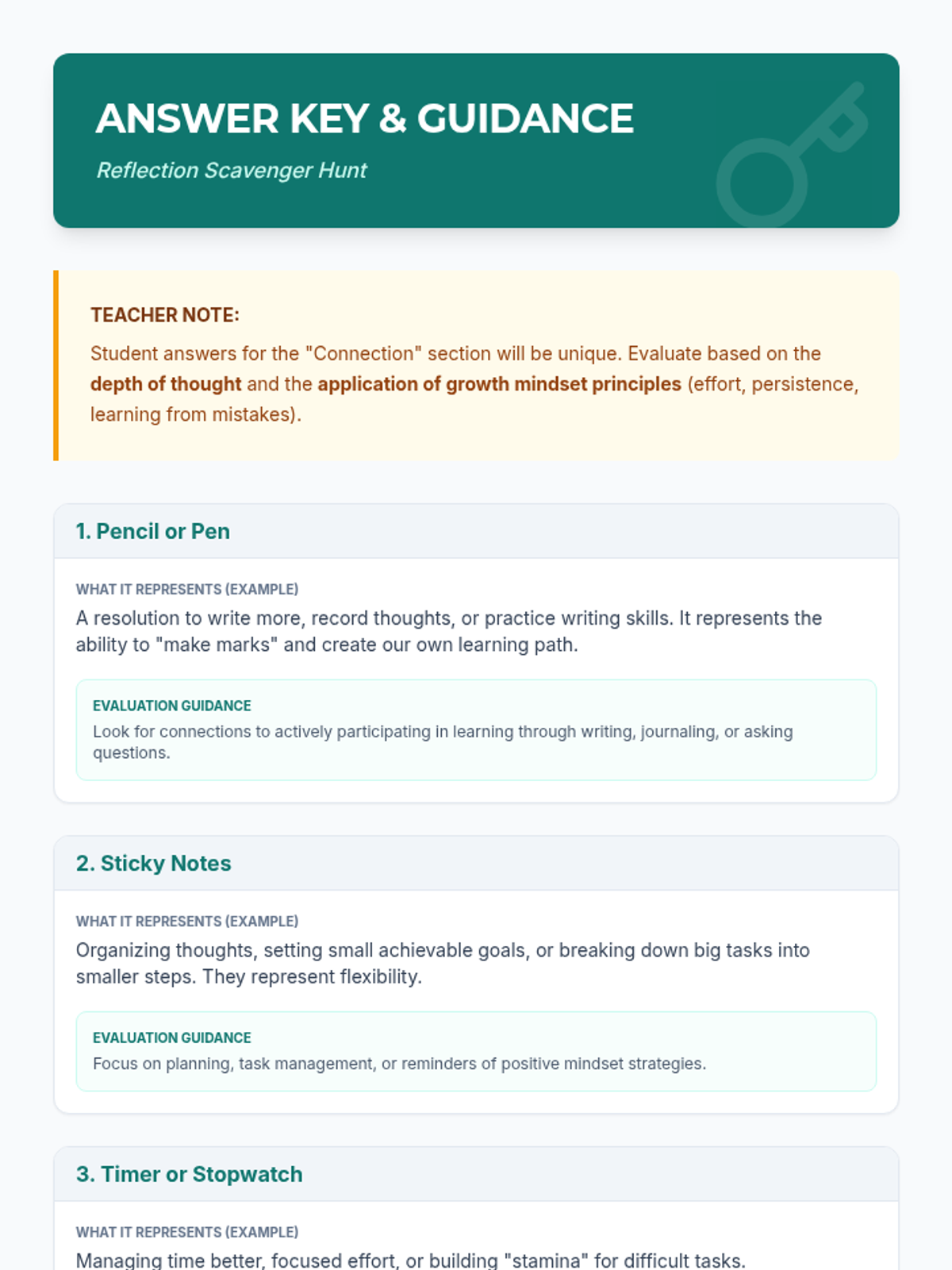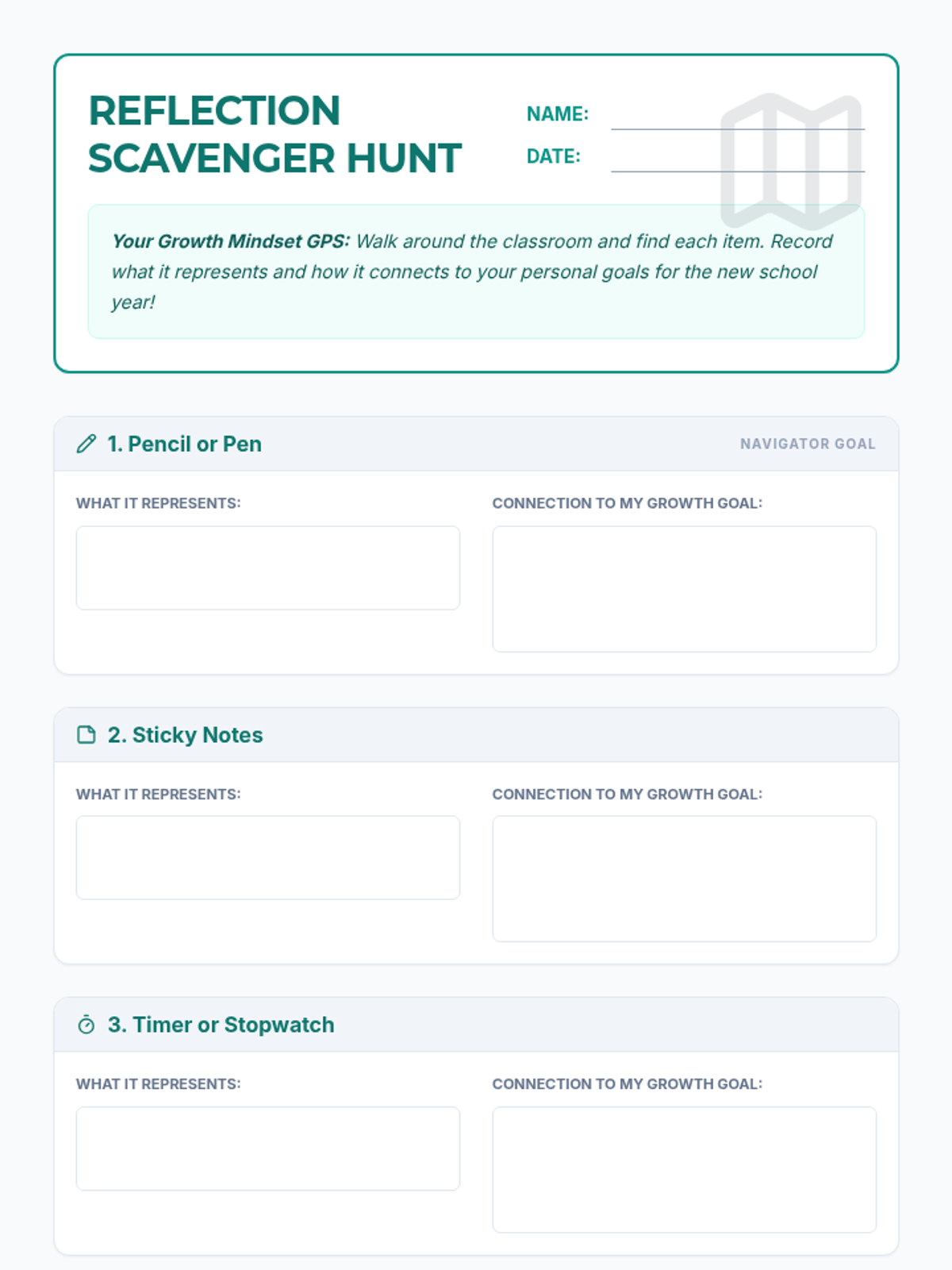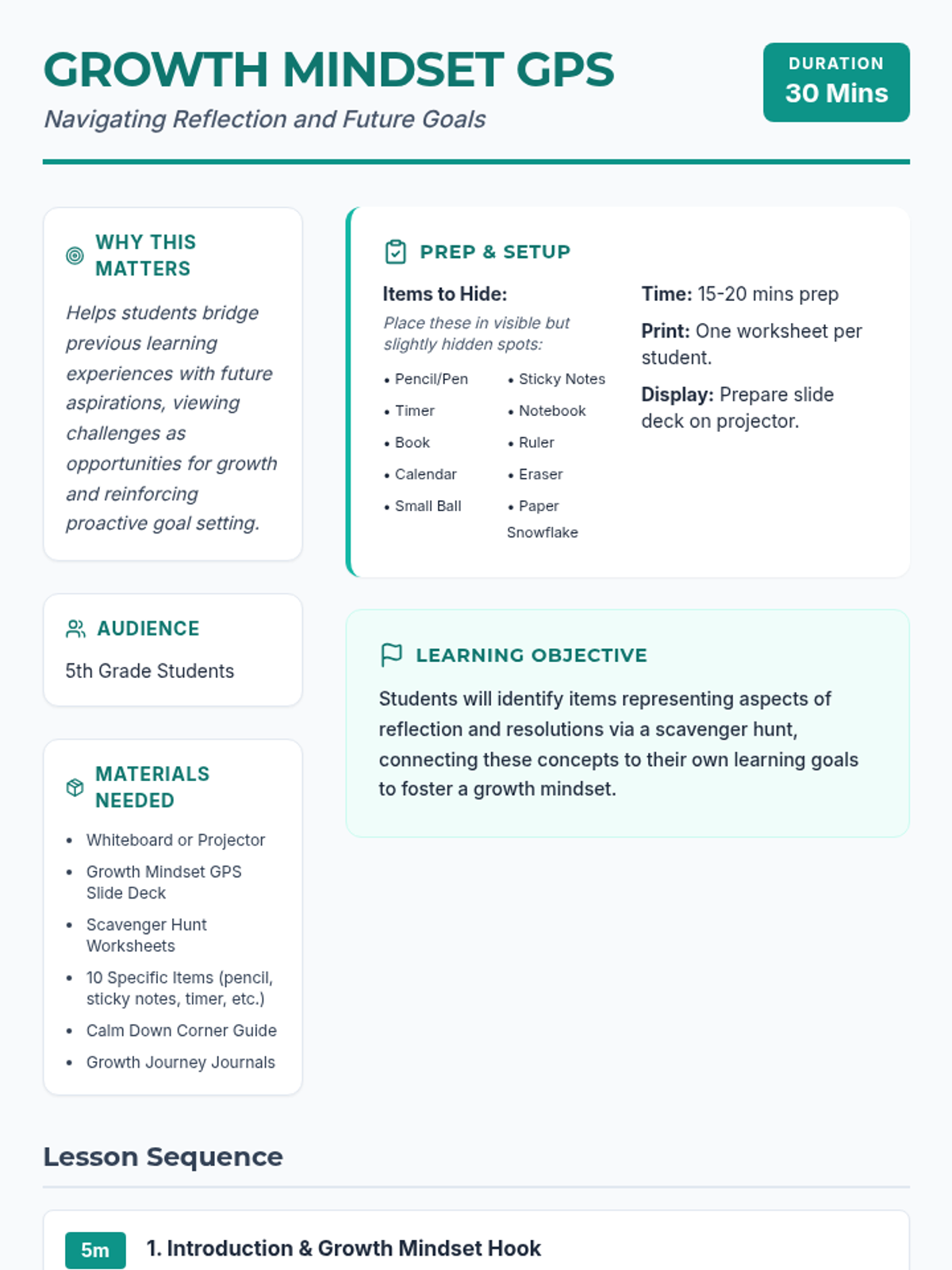 An interactive 30-minute lesson for 5th-grade students that uses a navigation-themed scavenger hunt to help them reflect on their progress and set growth mindset goals for the new school year.