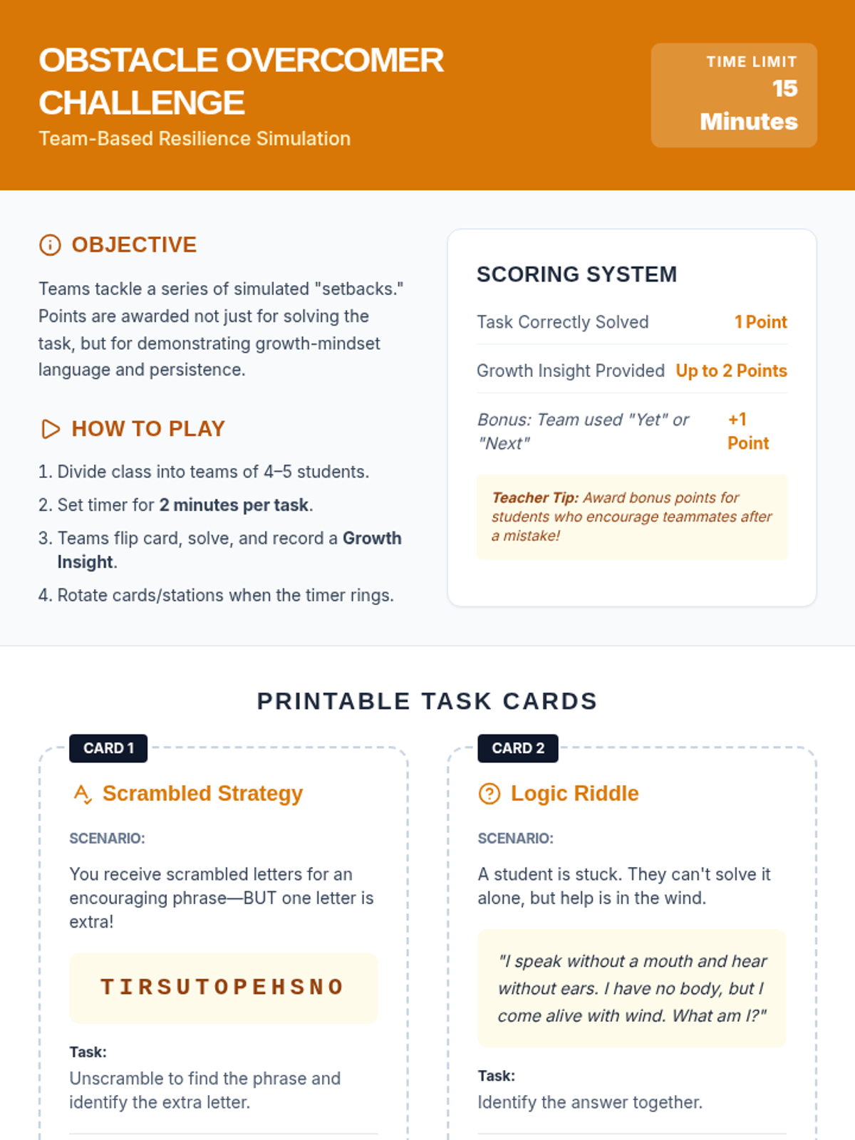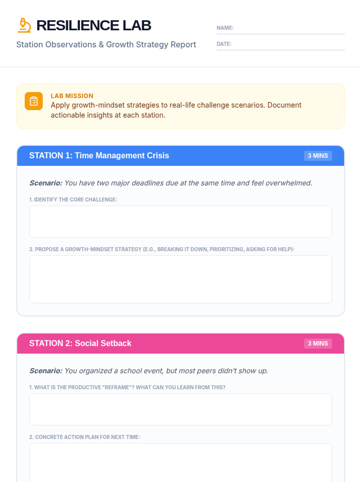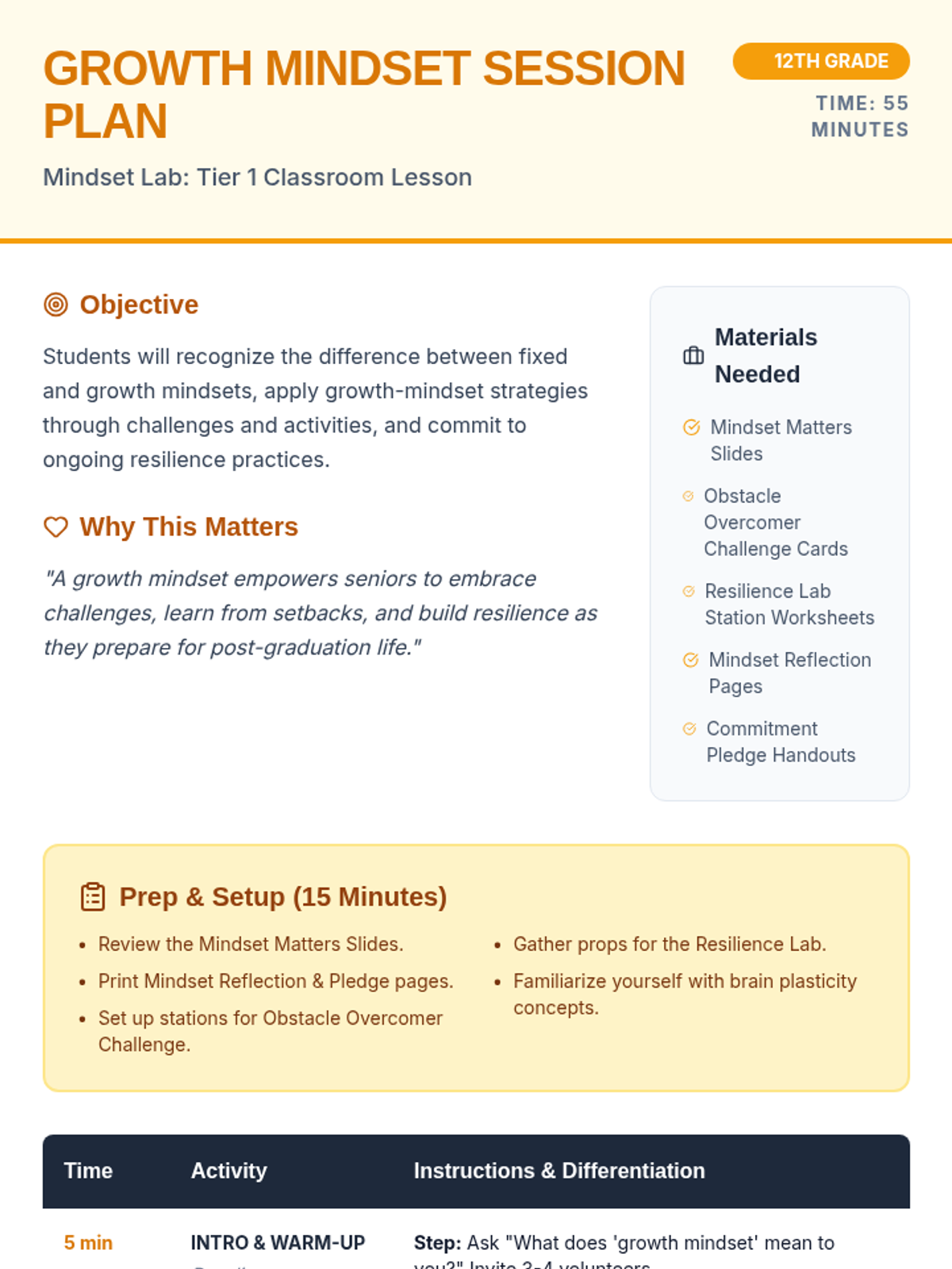 A comprehensive Tier 1 lesson for 12th graders focused on developing a growth mindset through interactive challenges, real-world scenario analysis, and personal reflection to build resilience for post-graduation life.