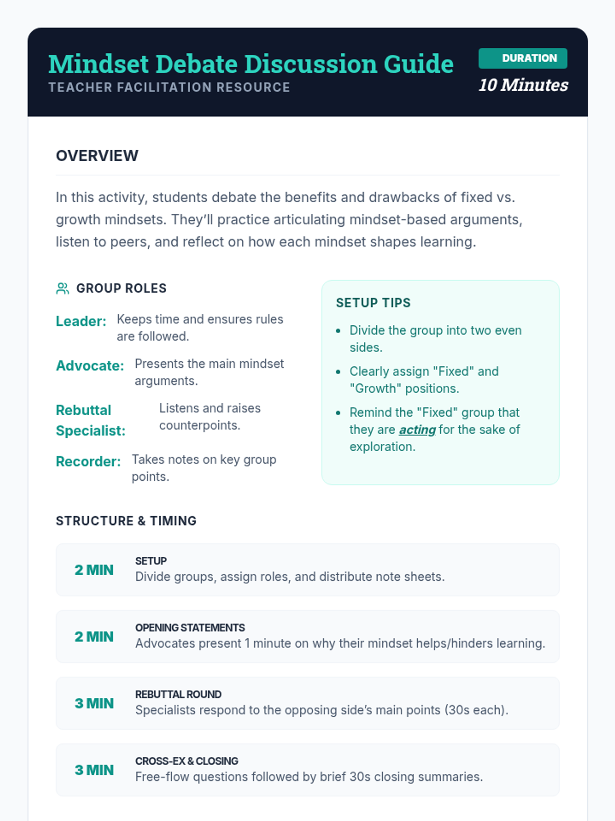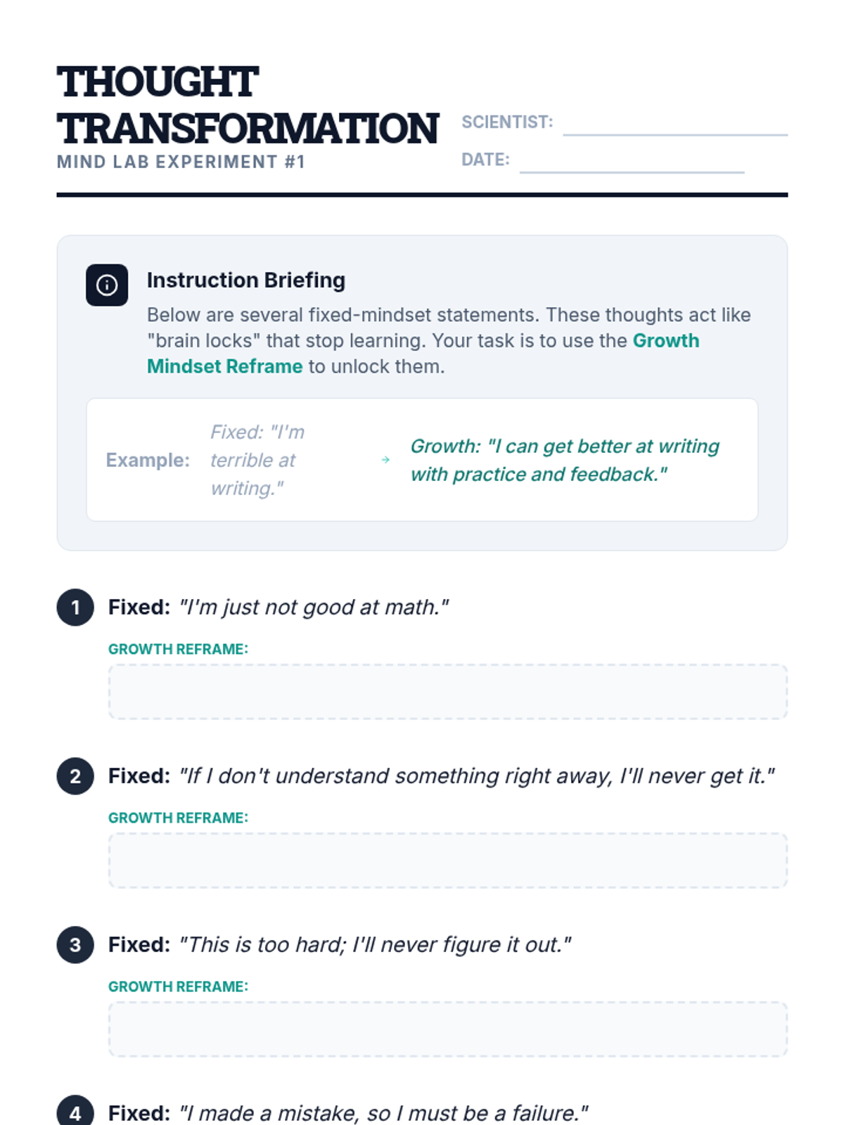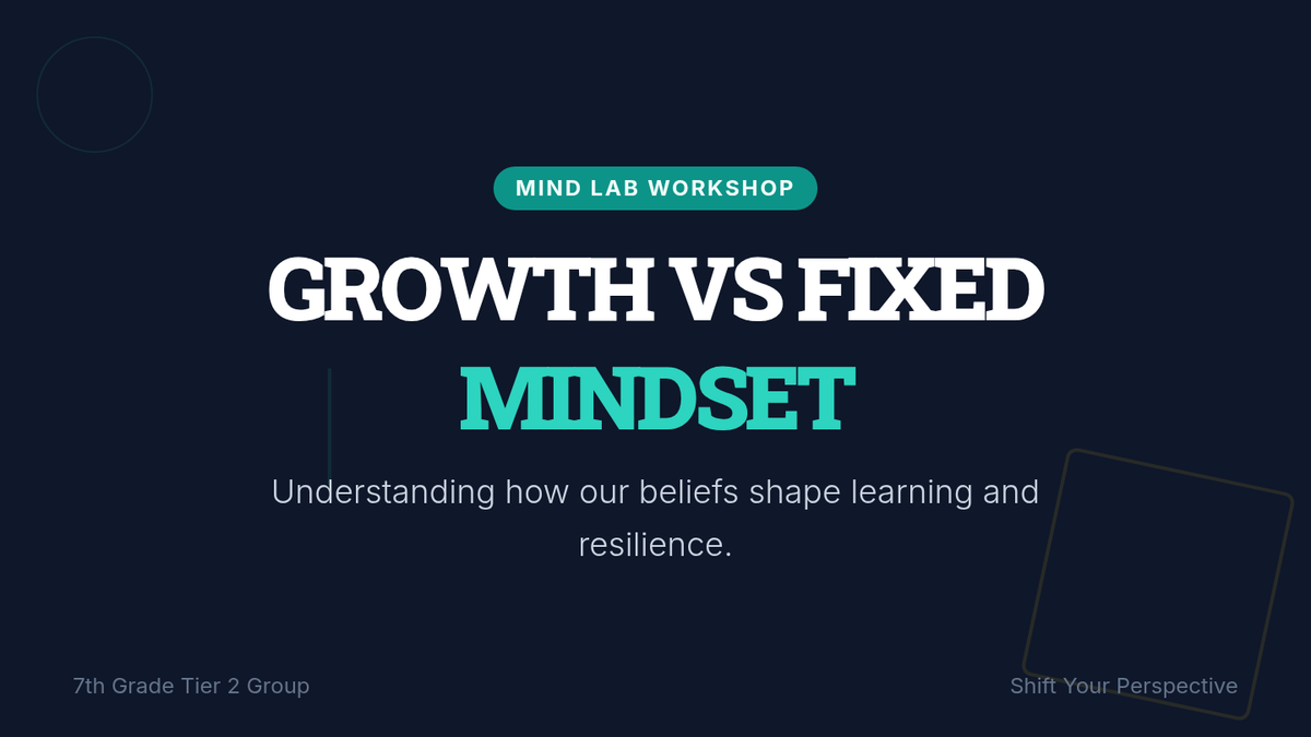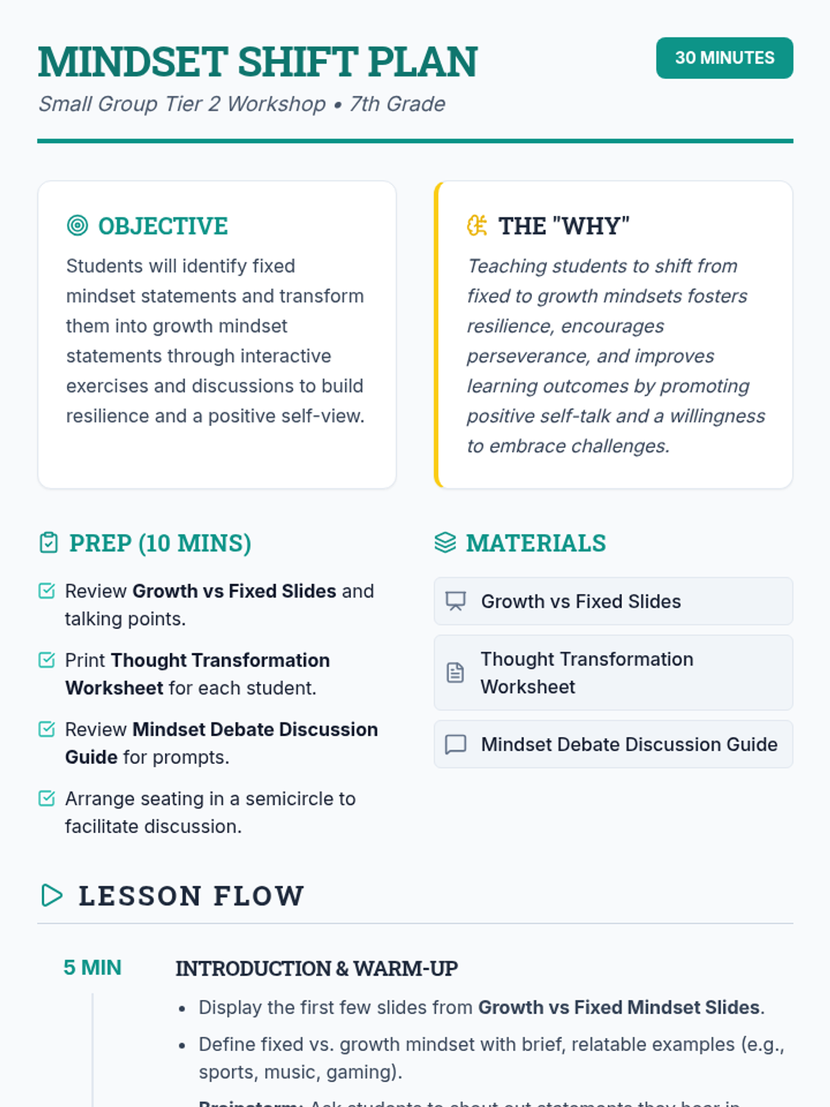 A 30-minute Tier 2 small-group workshop for 7th graders designed to help them identify fixed mindset triggers and reframe them into growth-oriented self-talk to build resilience and persistence.