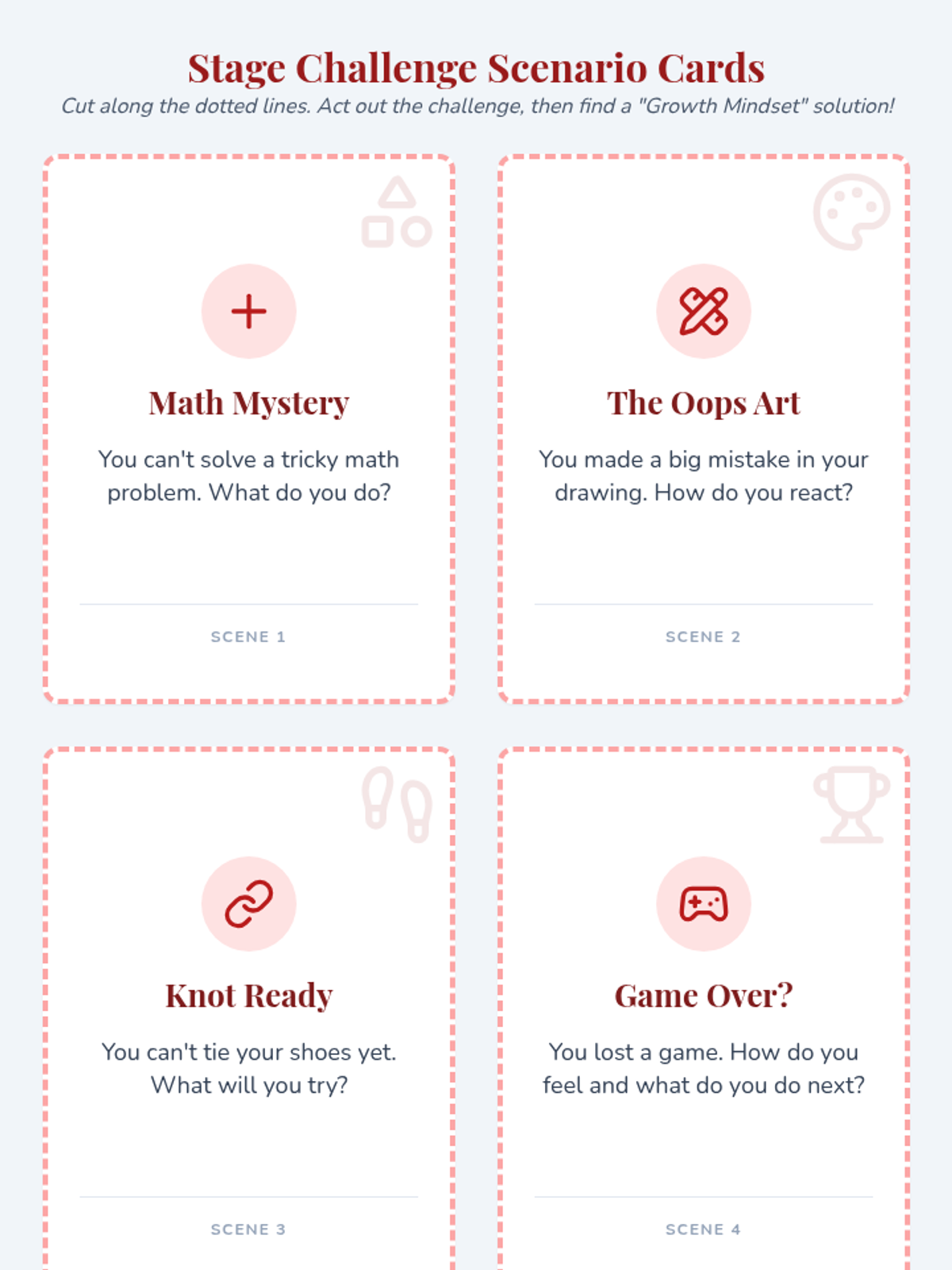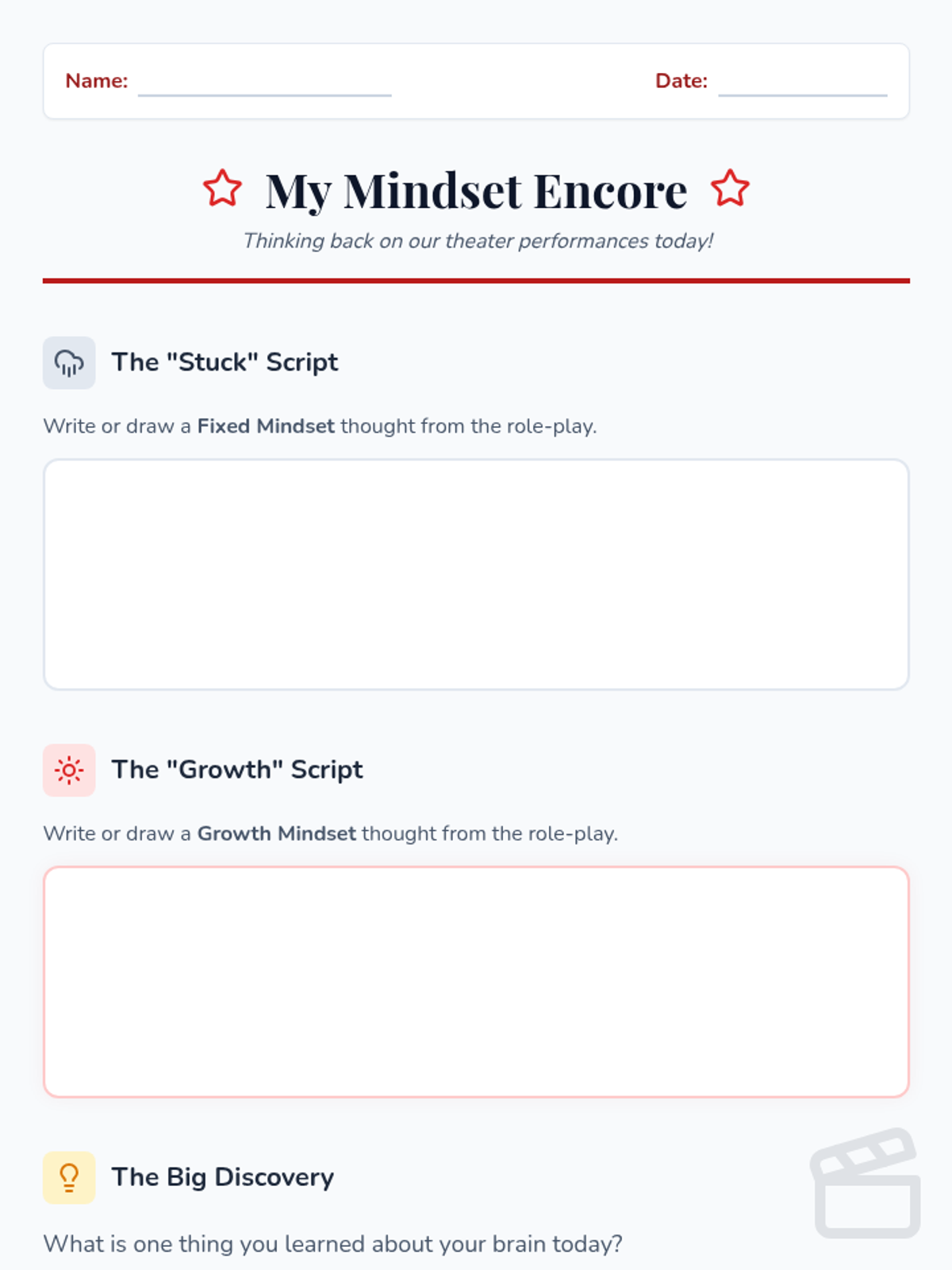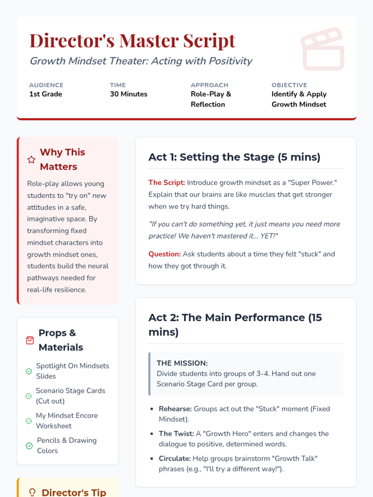 A 1st-grade lesson that uses role-play and theater-style activities to help students identify and transform fixed mindset thoughts into growth mindset ones. Students act out challenges to build resilience and positive attitudes towards learning.