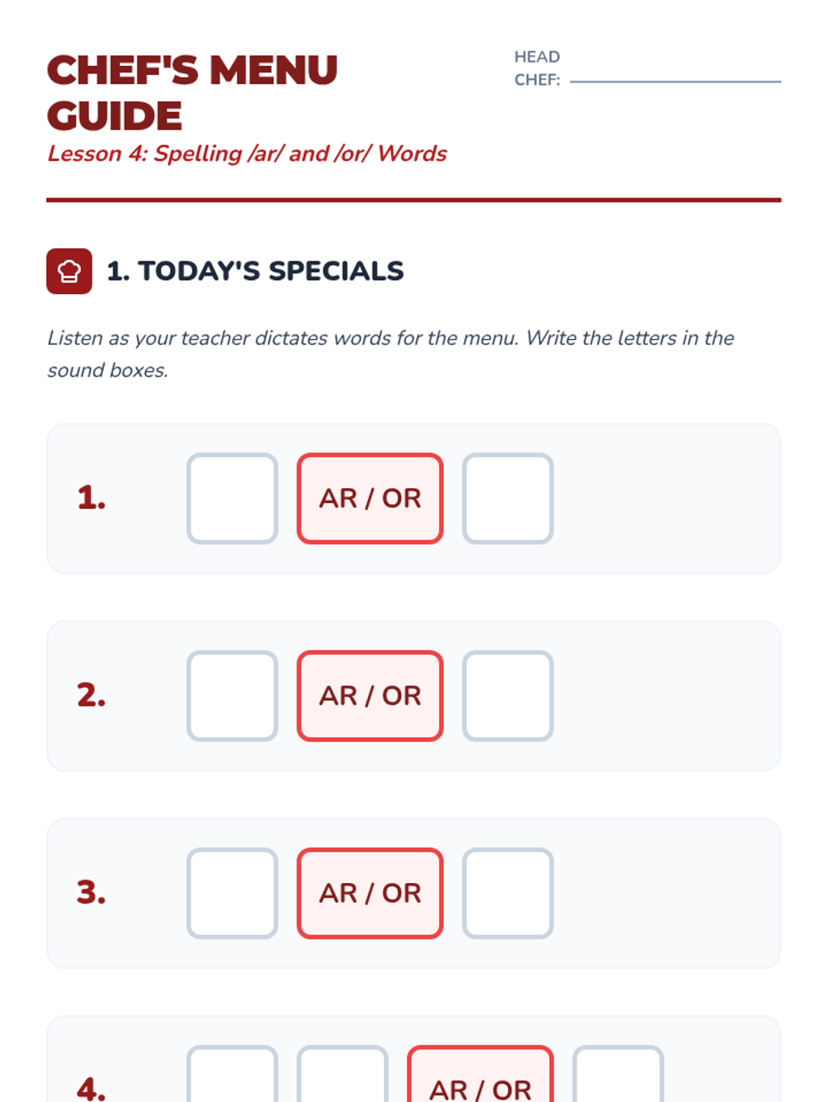 The focus shifts to spelling as students construct words dictated by the teacher, emphasizing hearing the vowel-r combination as a unit.