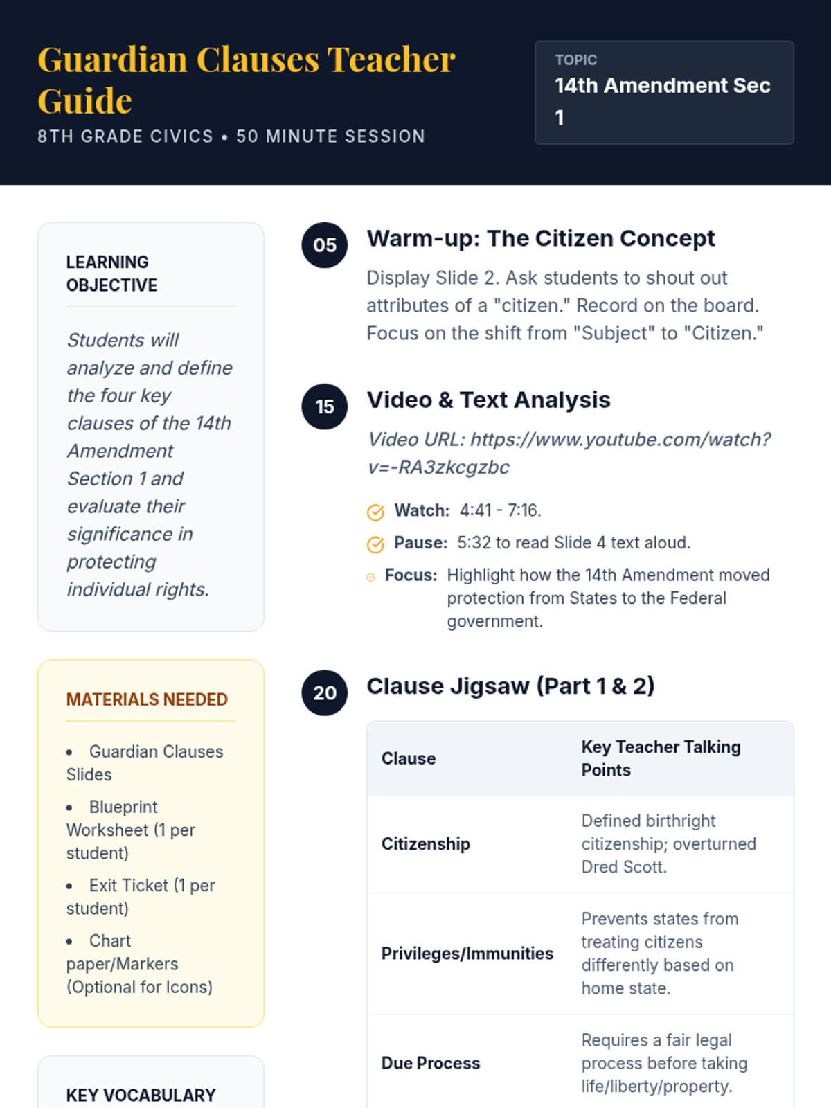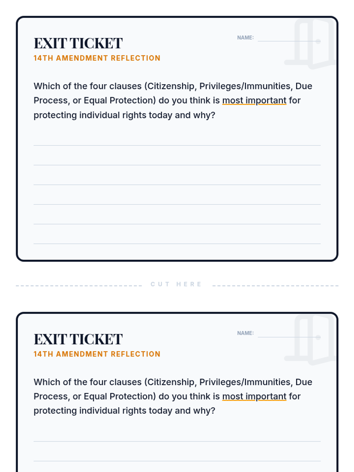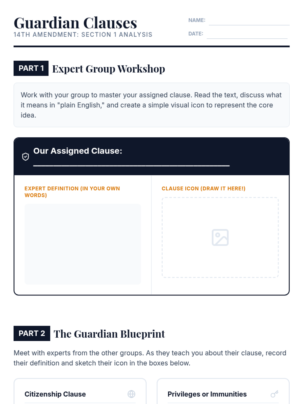 Students will dive deep into Section 1 of the 14th Amendment, analyzing the Citizenship, Privileges or Immunities, Due Process, and Equal Protection clauses through a collaborative jigsaw activity.