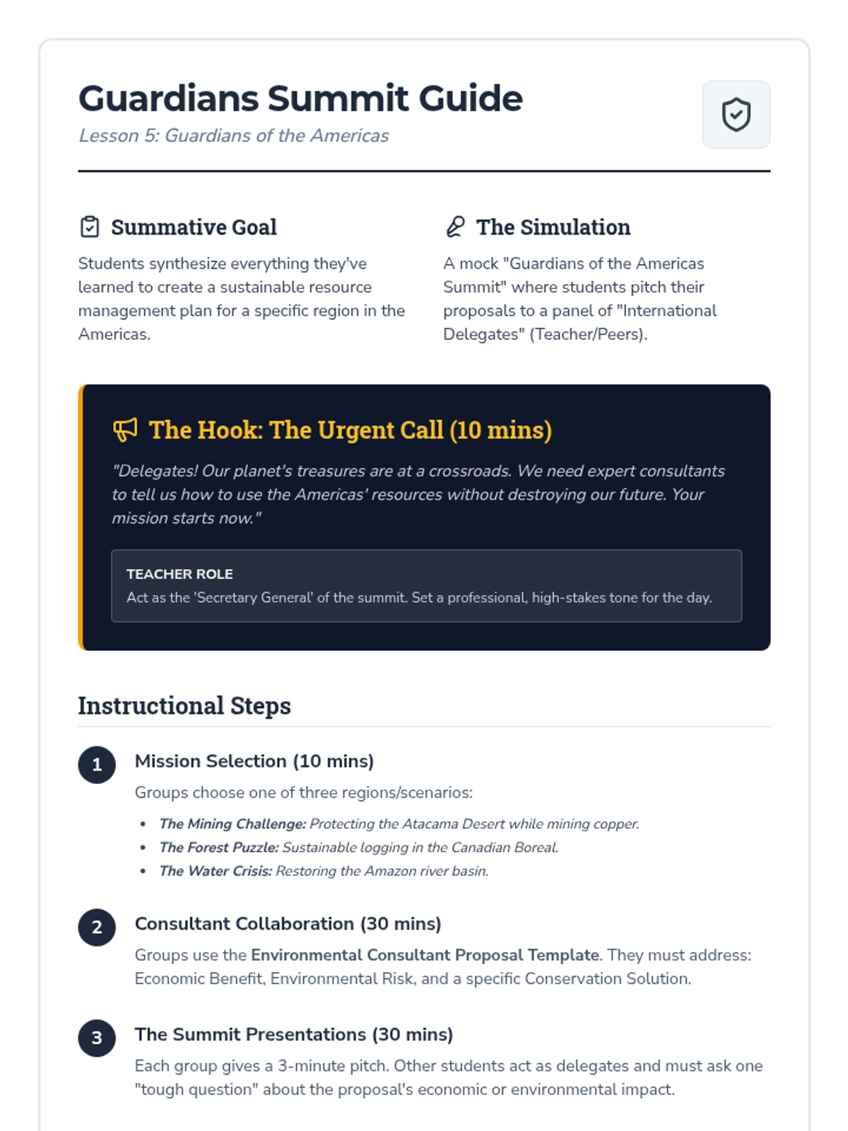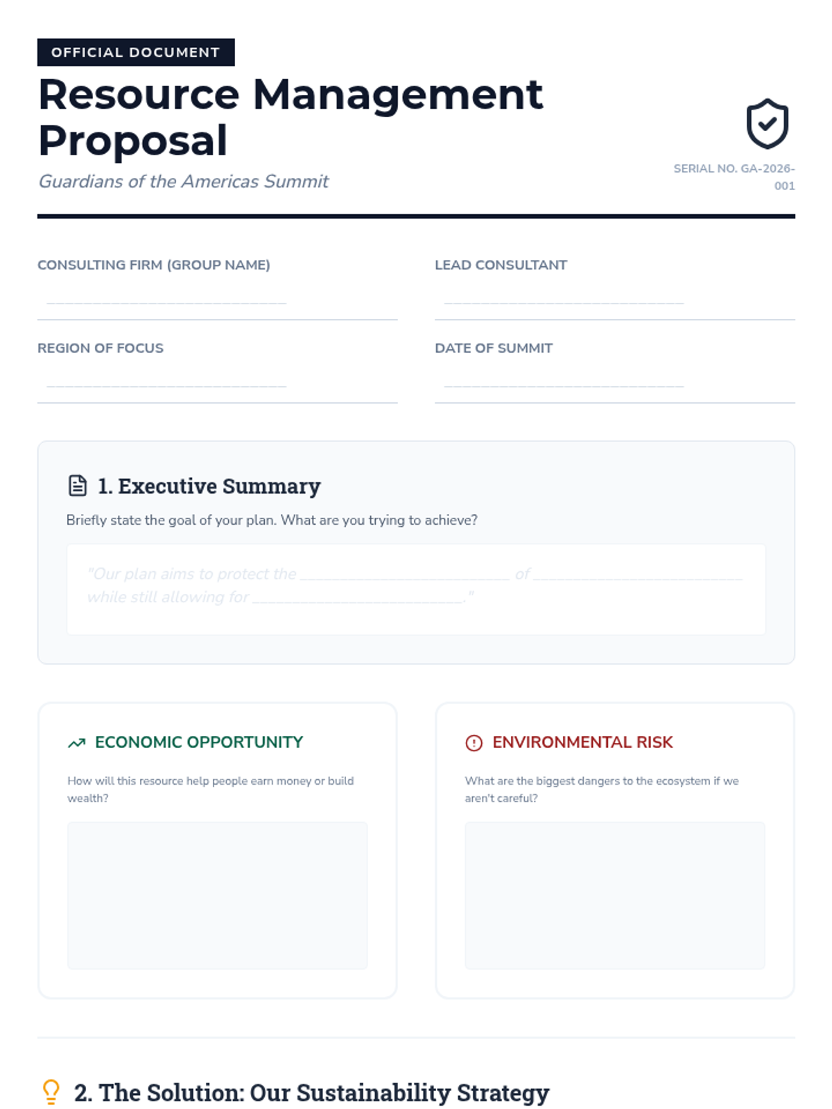 Students act as environmental consultants to create and present a sustainable resource management proposal for a region in the Americas.