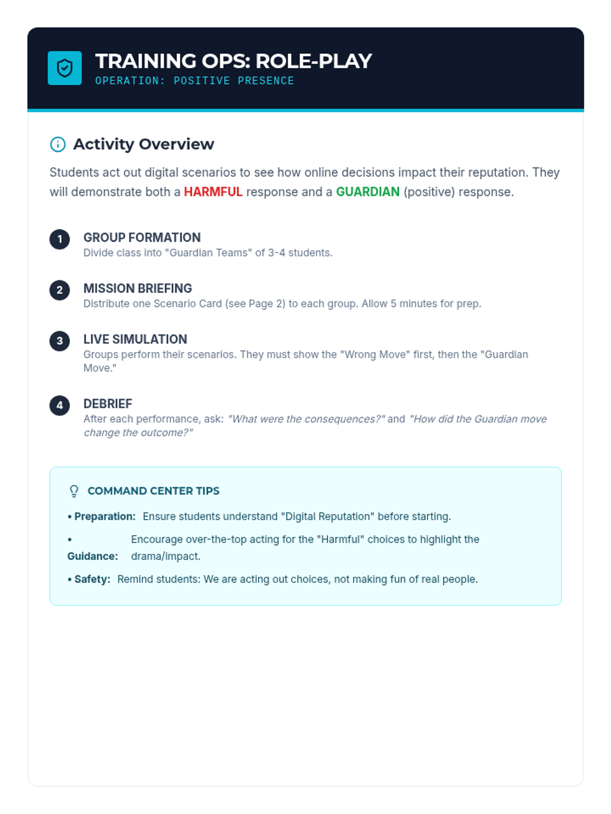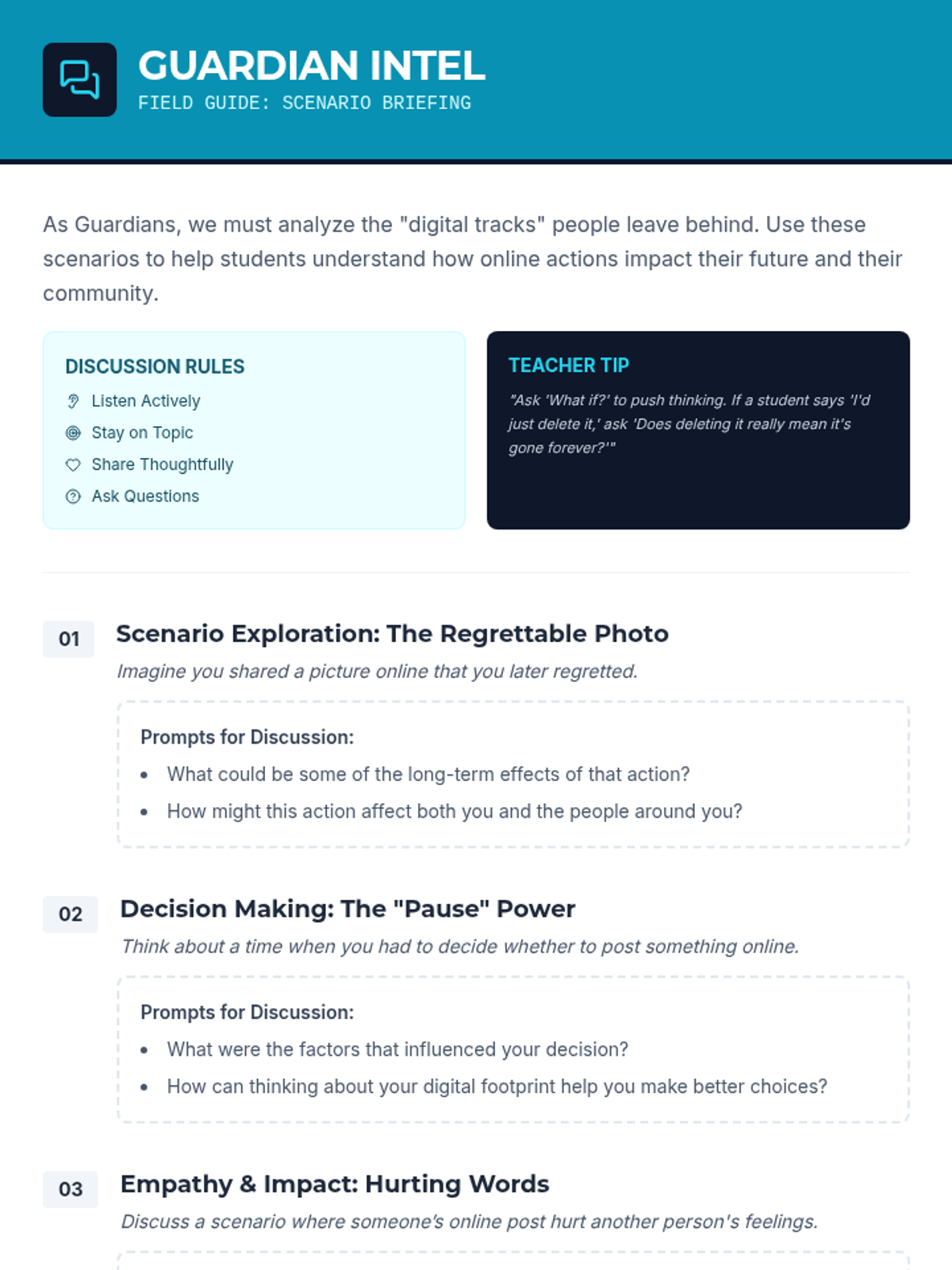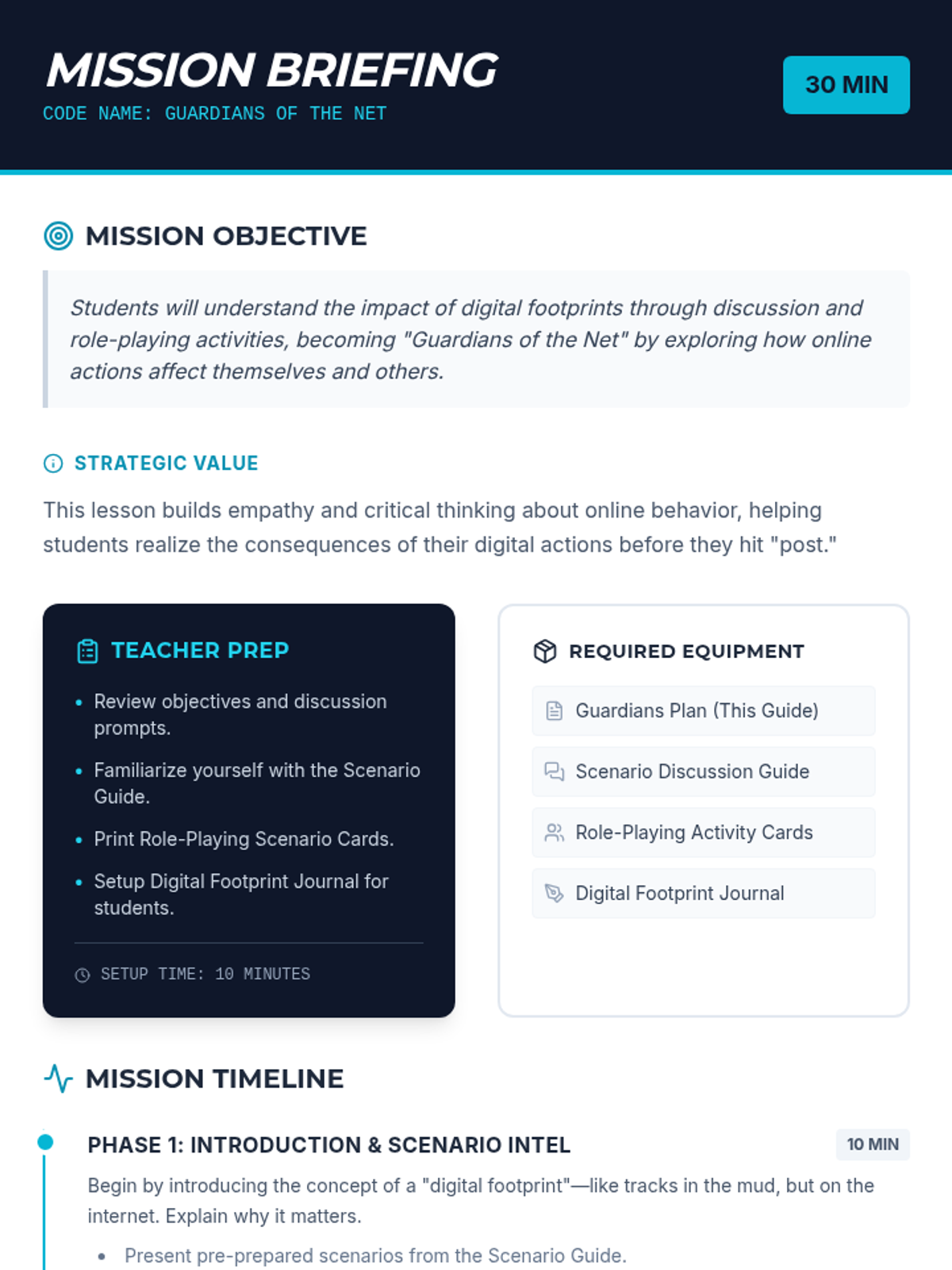 A small group lesson for 3rd graders focused on digital citizenship, empathy, and understanding the impact of digital footprints through discussion and role-play.
