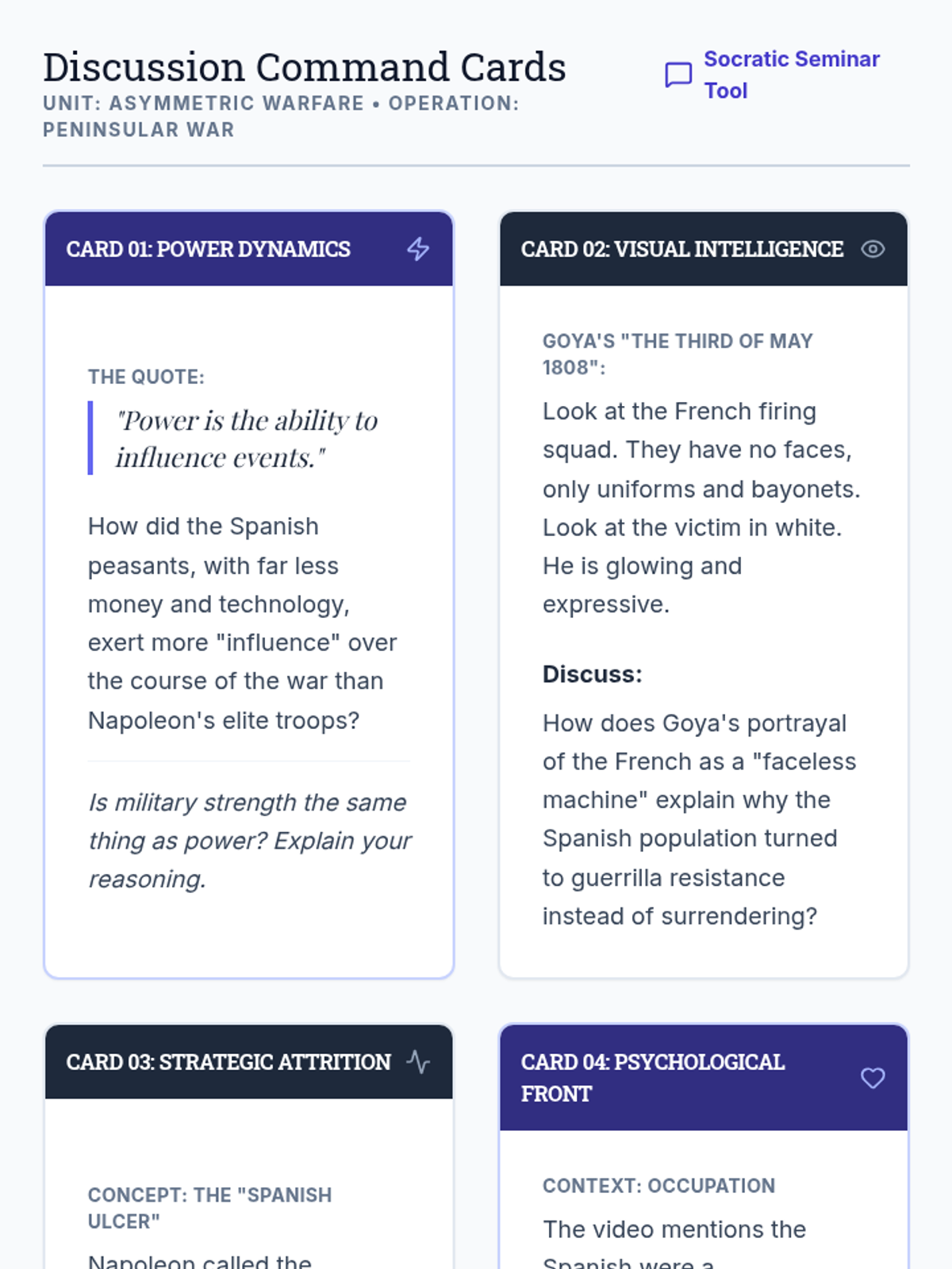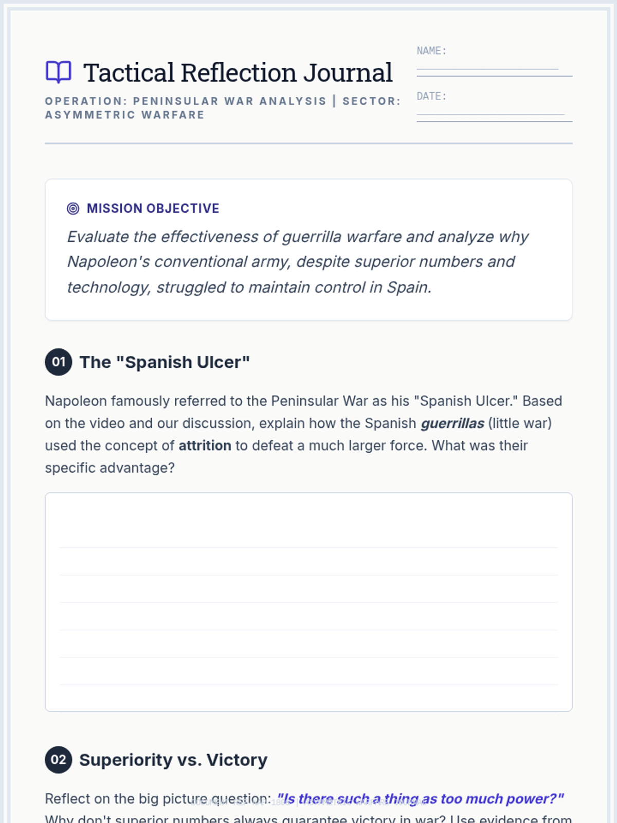 A high school history lesson exploring the Peninsular War and the effectiveness of guerrilla warfare against Napoleon's conventional army, featuring visual analysis of Goya's artwork.