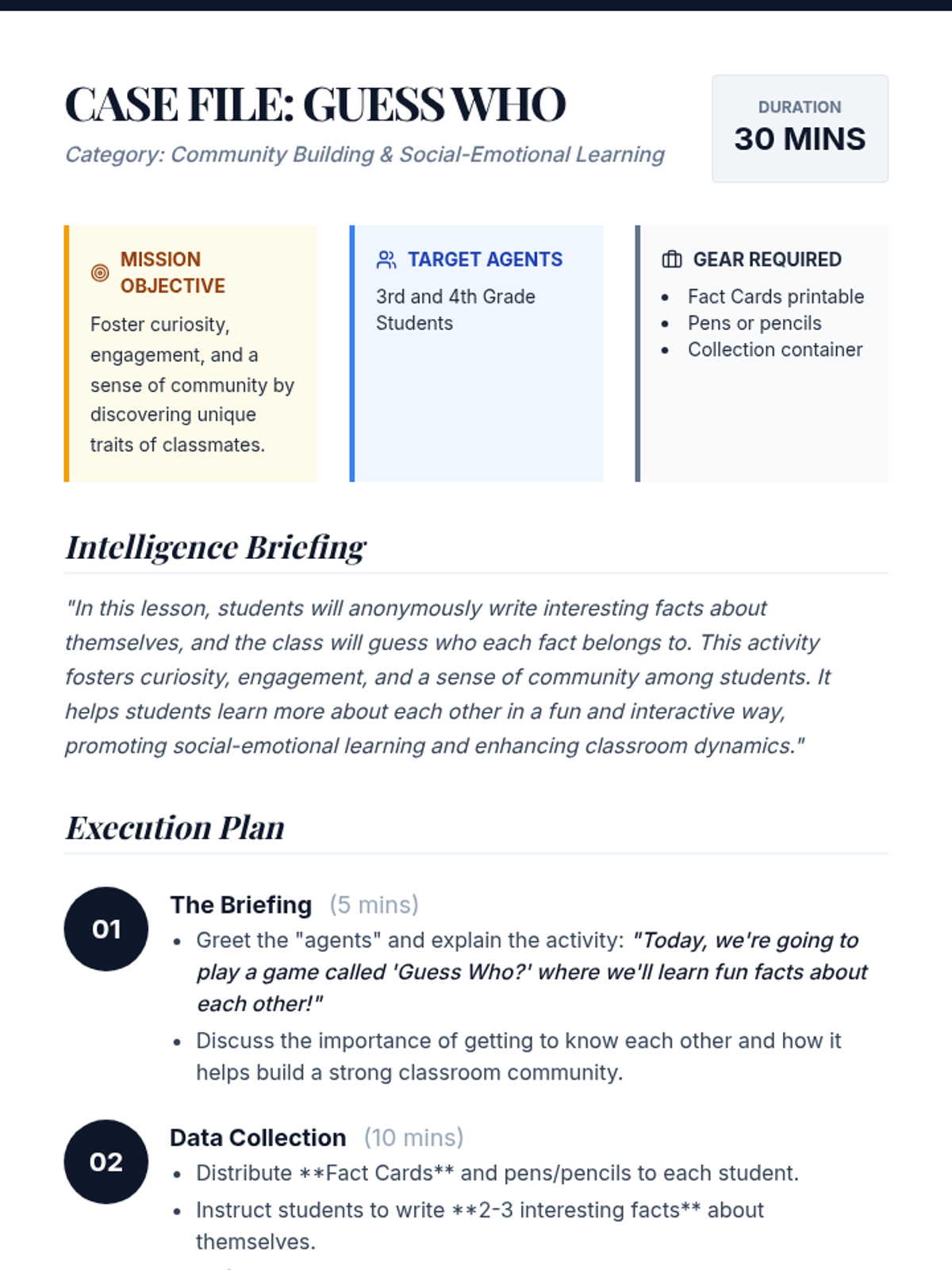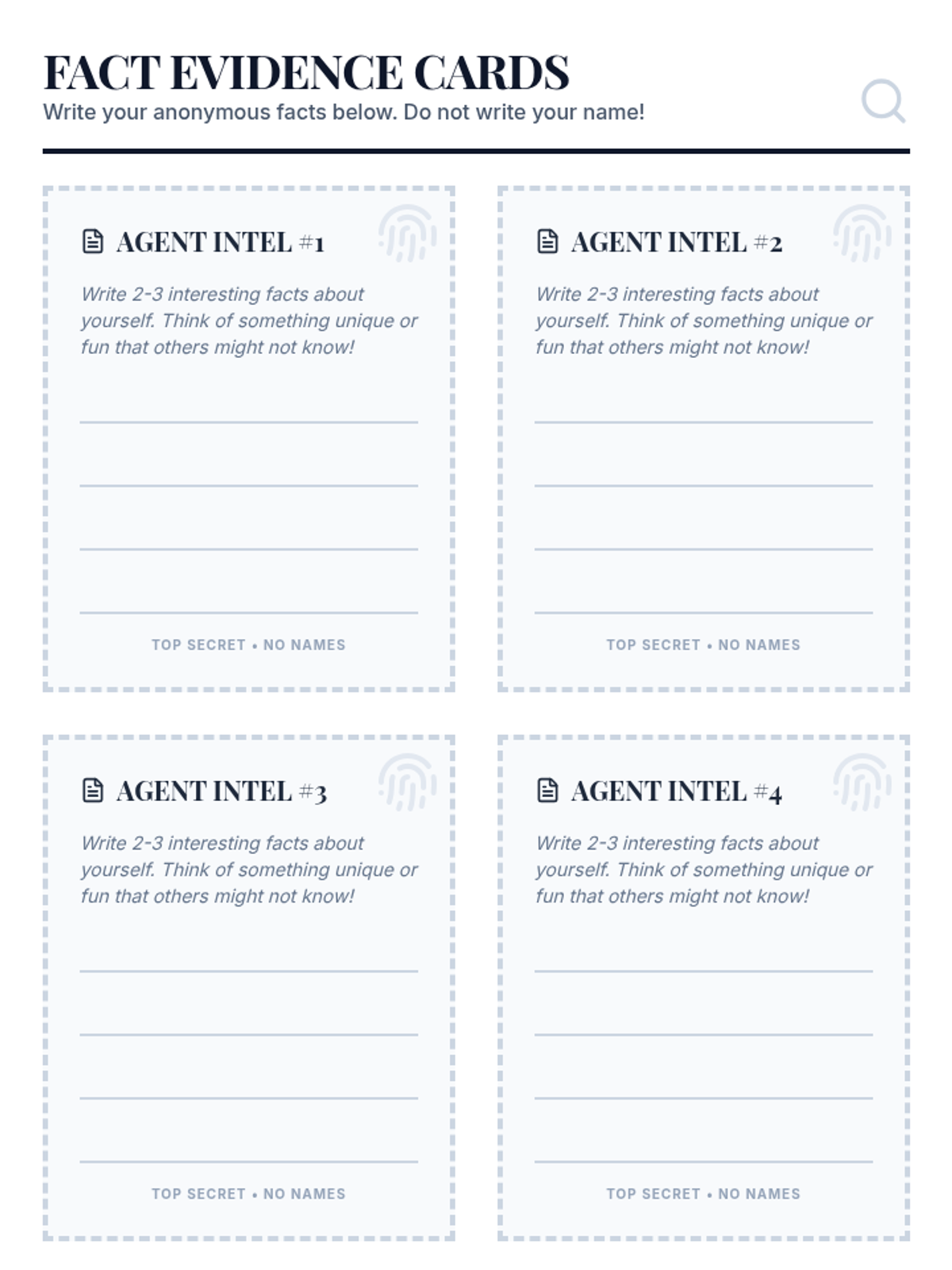 A fun, mystery-themed icebreaker lesson where 3rd and 4th grade students write anonymous facts about themselves for the class to guess. This activity builds community and social-emotional skills through curiosity and sharing.