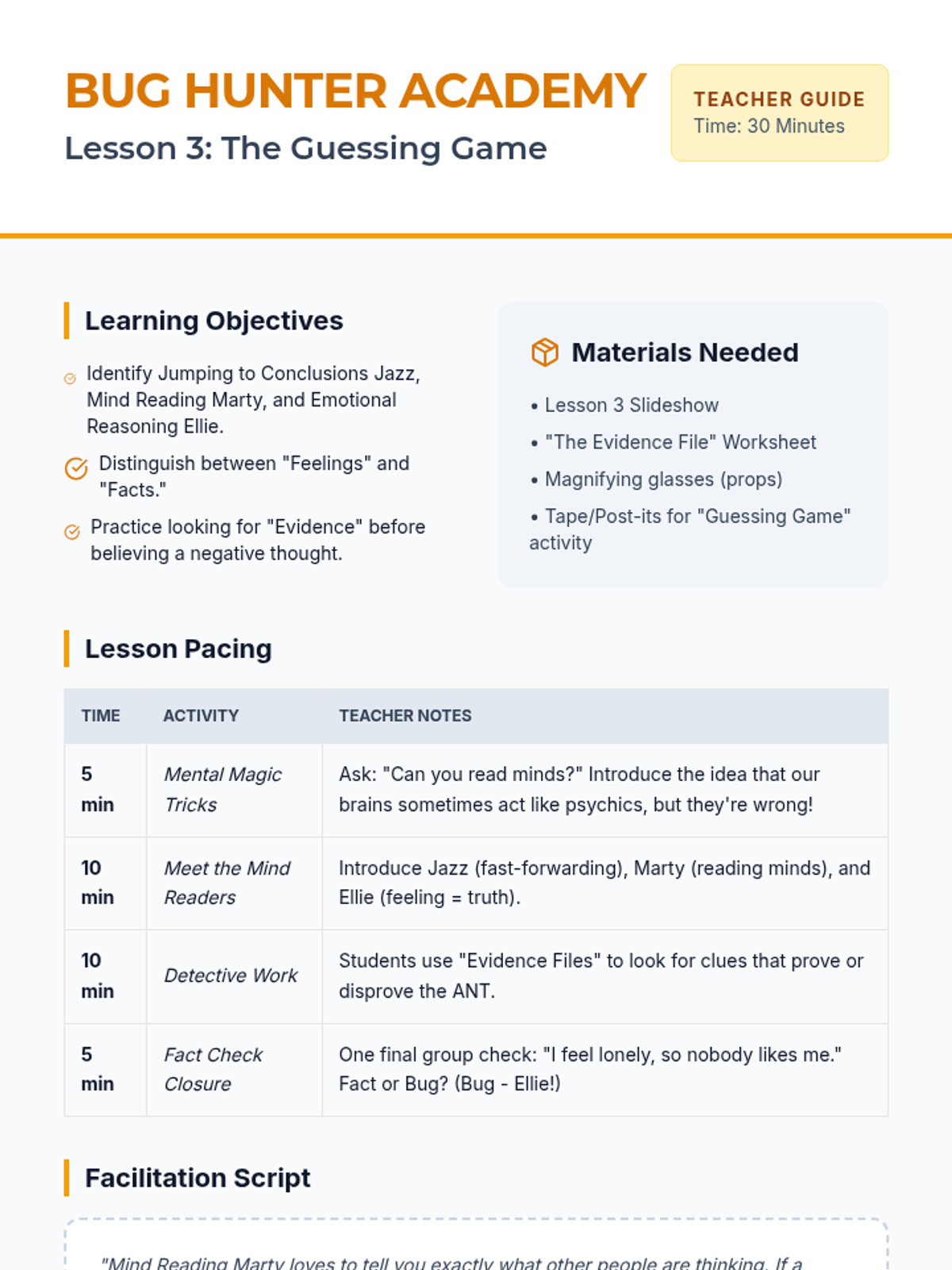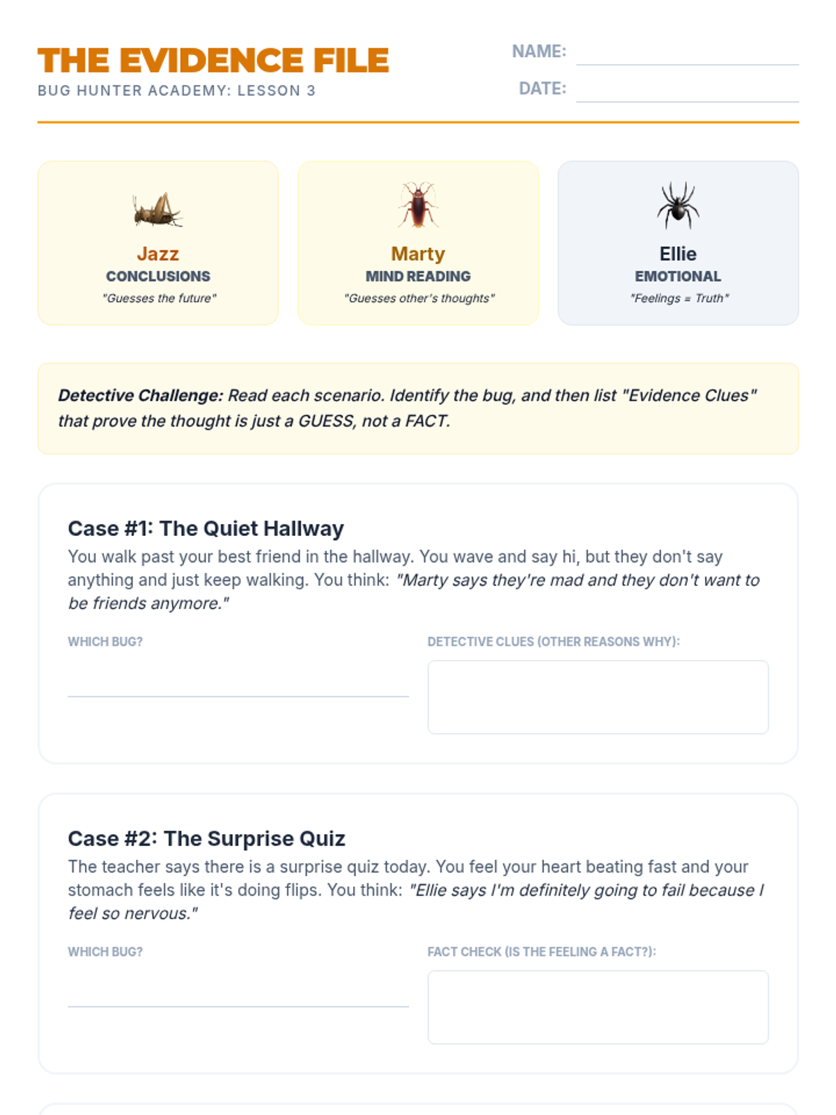 Students explore thoughts that jump to conclusions without facts and let big feelings dictate the truth, featuring Jumping to Conclusions Jazz, Mind Reading Marty, and Emotional Reasoning Ellie.
