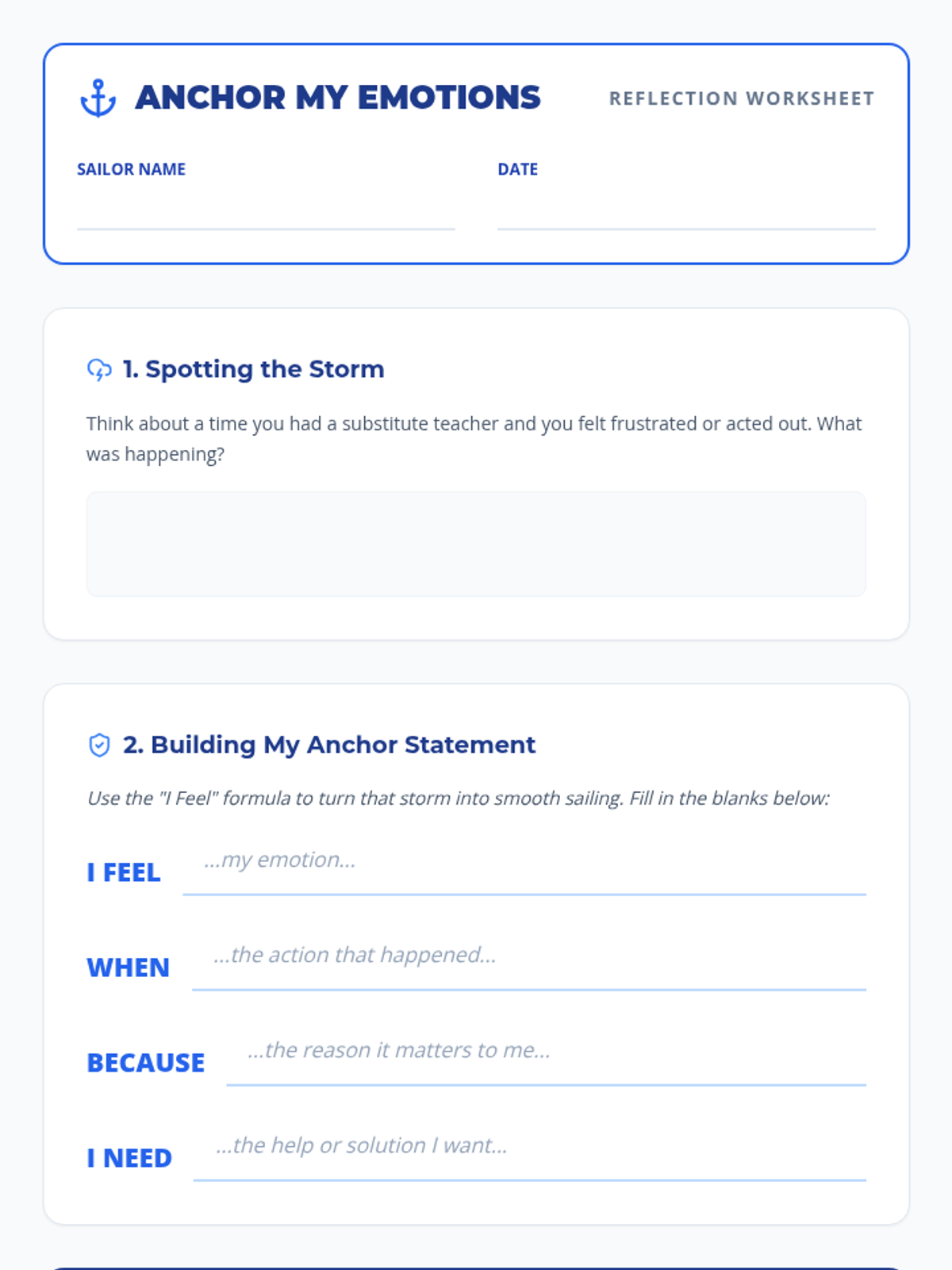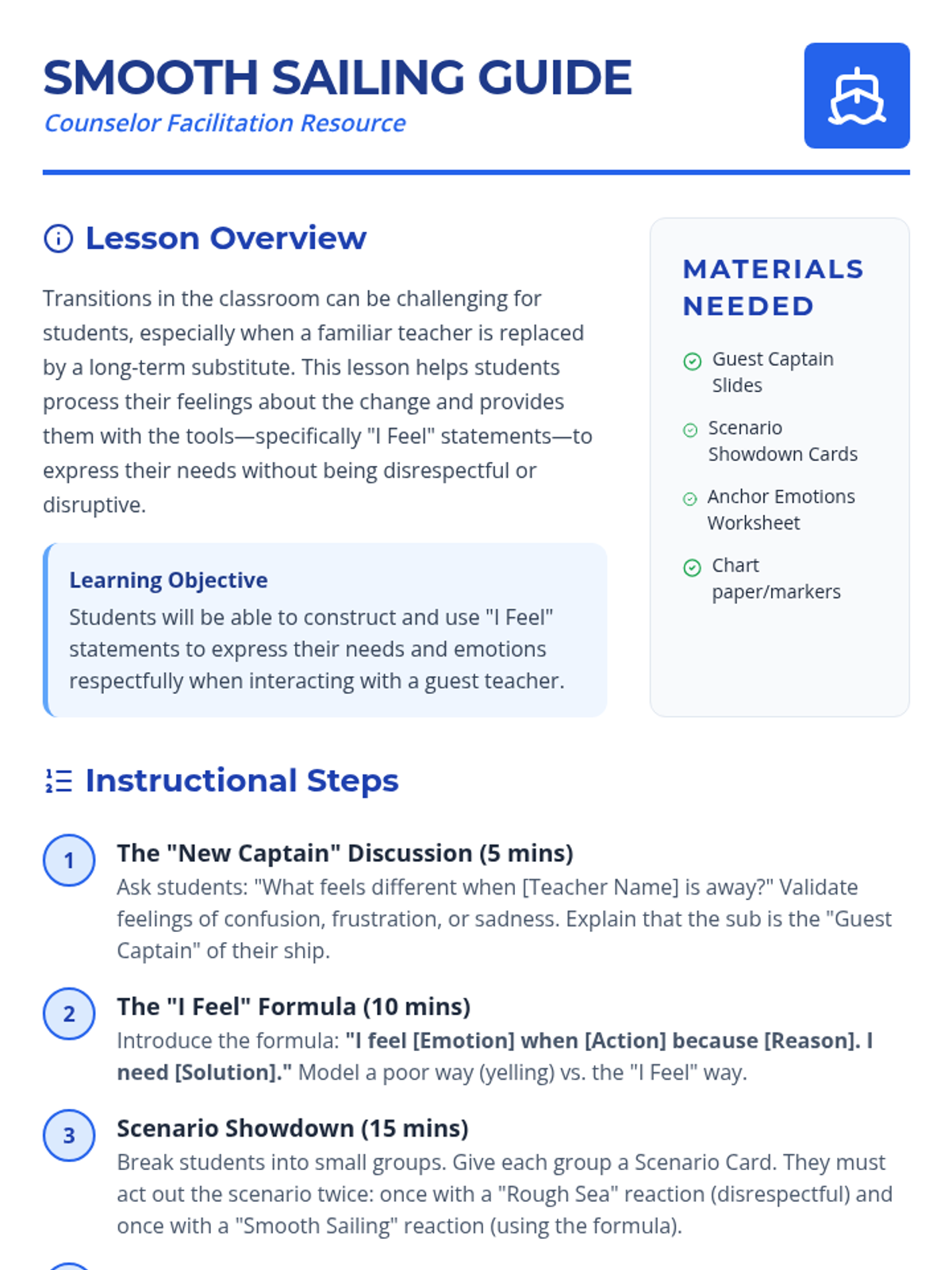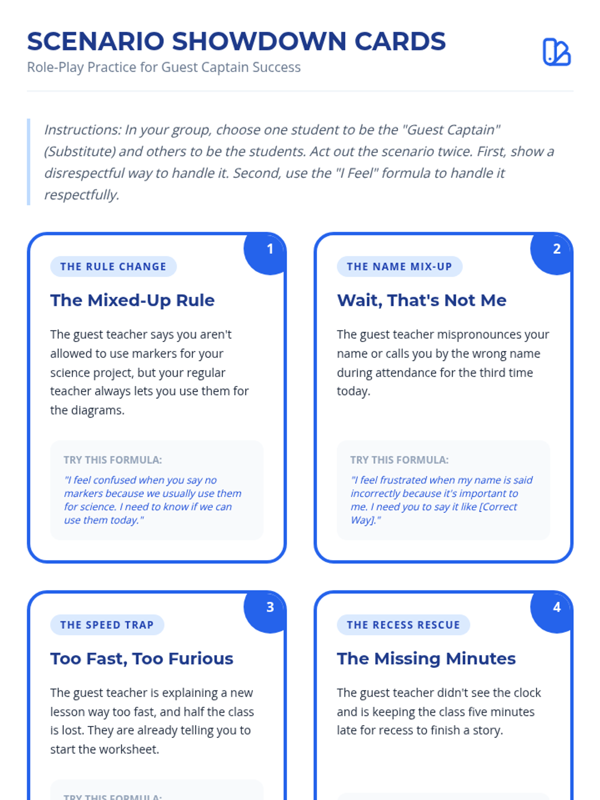 A social-emotional learning lesson focused on using 'I' statements to communicate respectfully with long-term substitute teachers during transitions.