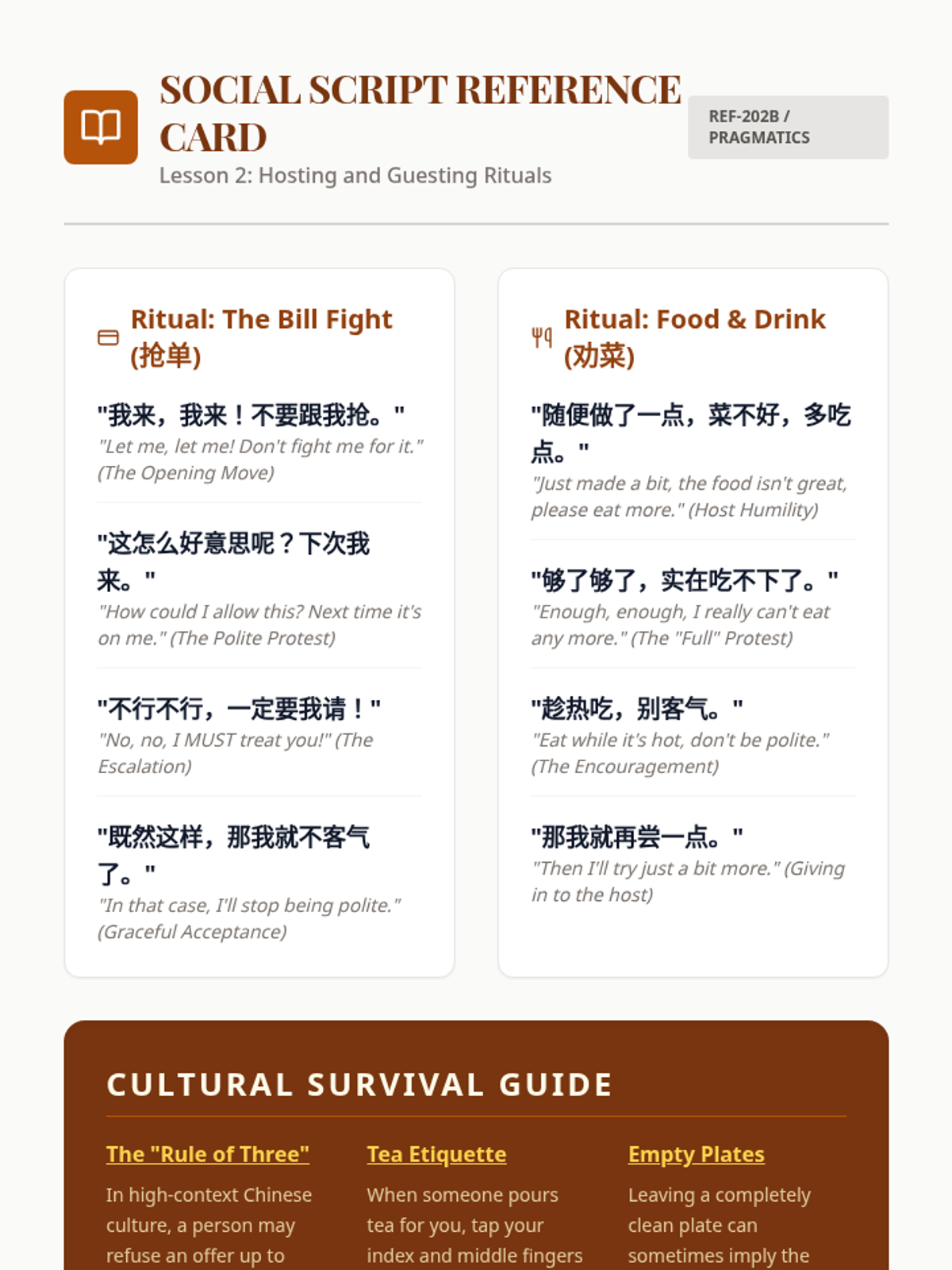An exploration of the ritualistic language used in hosting and guesting in Chinese culture. Focuses on the 'bill fight' and food offering rituals.
