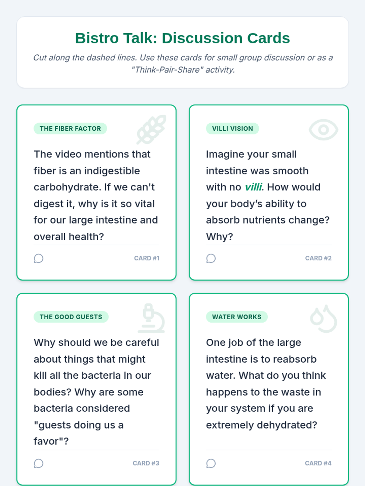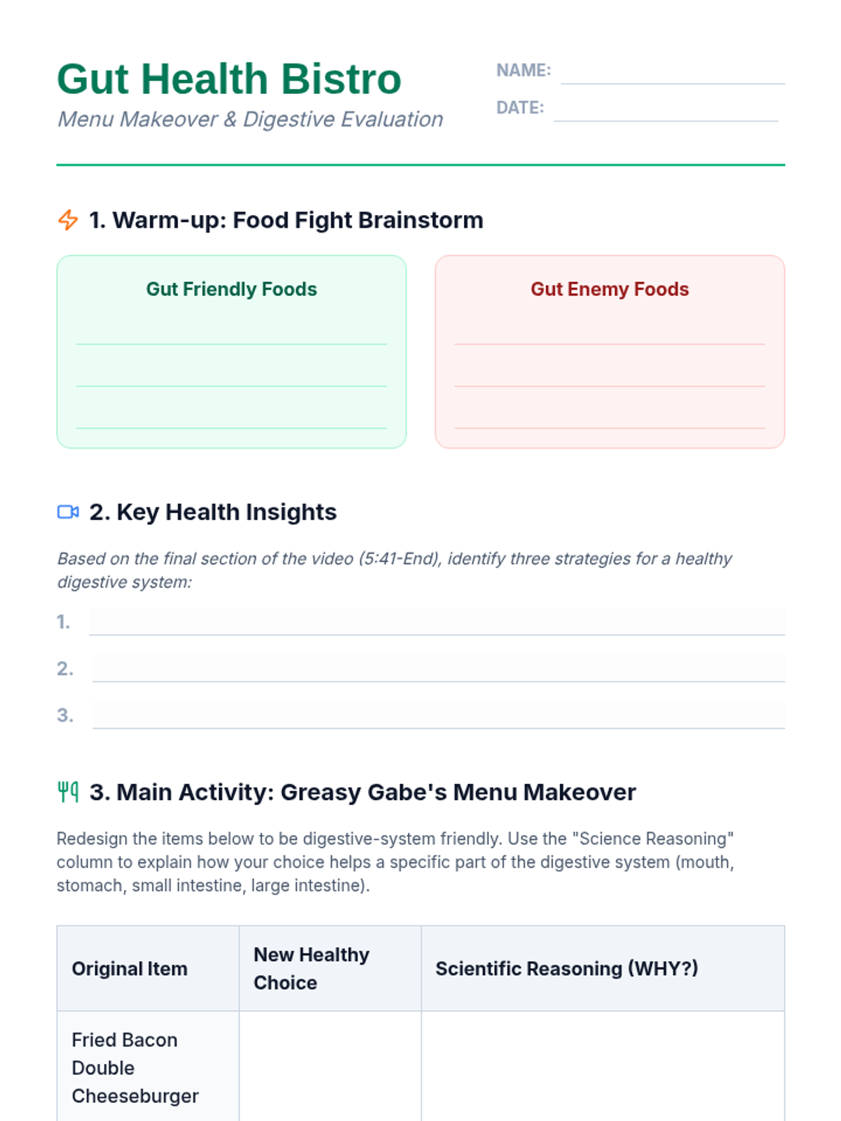 A lesson focused on evaluating dietary choices for digestive health. Students analyze food impacts, redesign a menu for optimal digestion, and explore the role of probiotics.