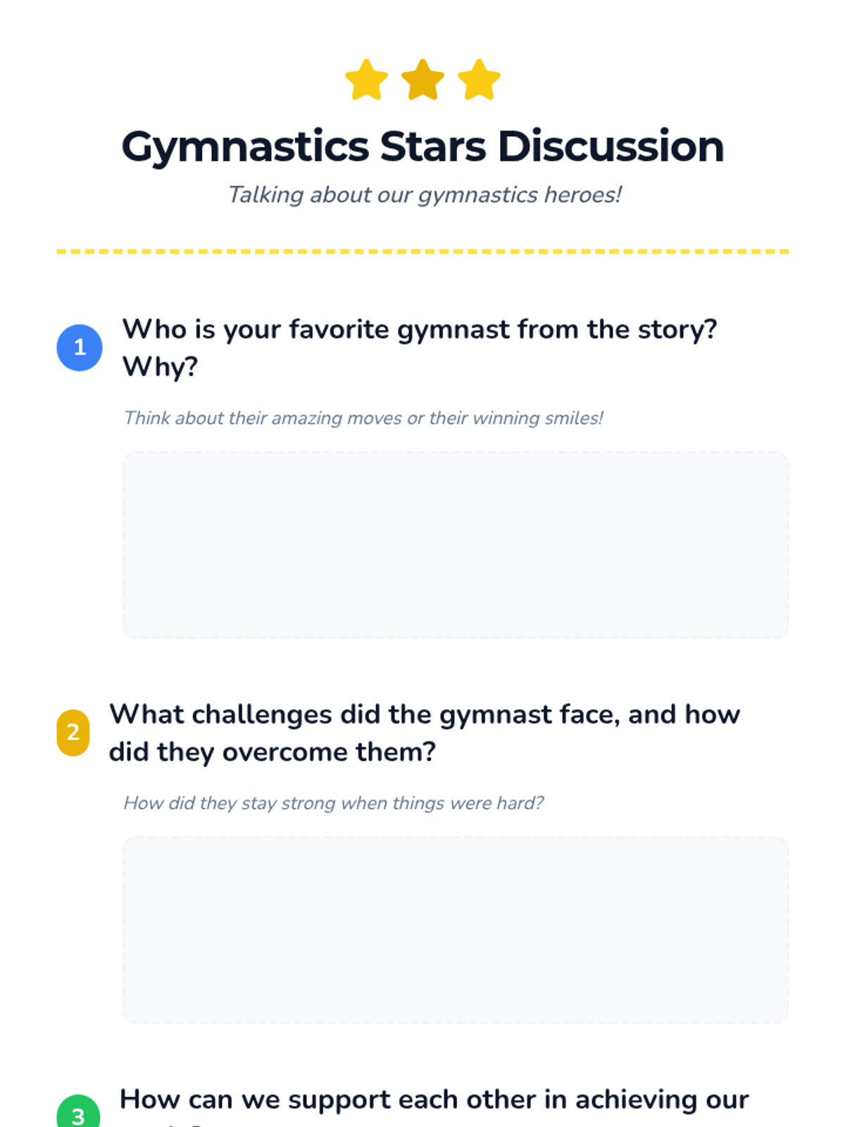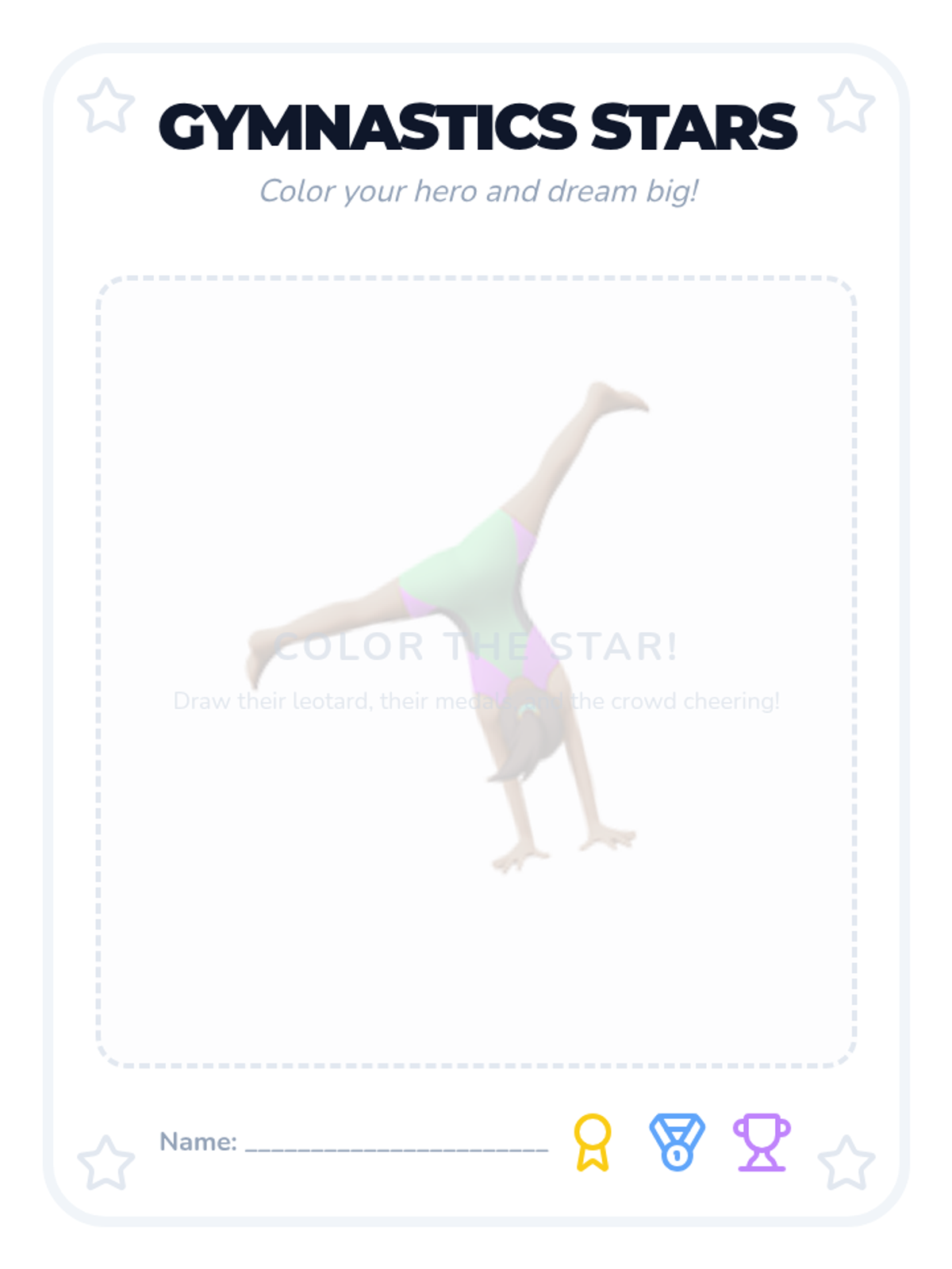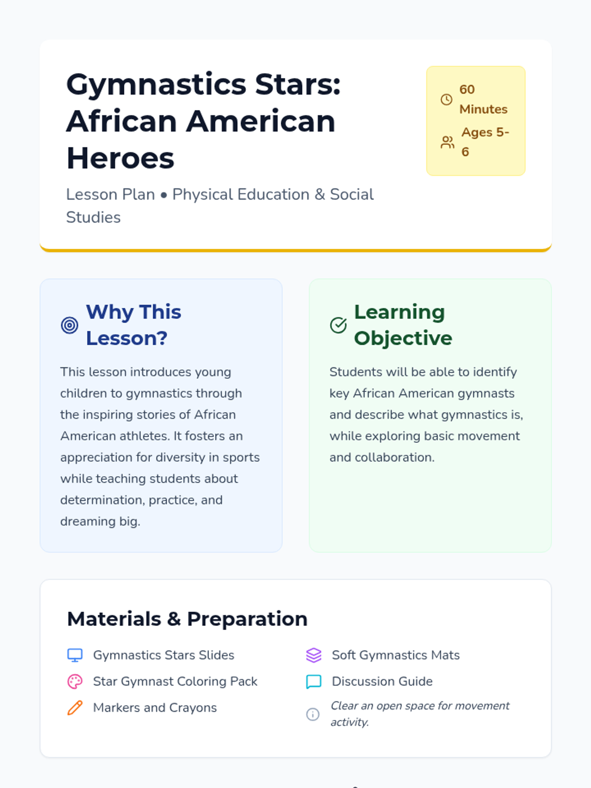 A lesson for 5-6 year olds celebrating the achievements of African American gymnasts like Simone Biles and Gabby Douglas through stories, collaborative coloring, and basic physical exploration.