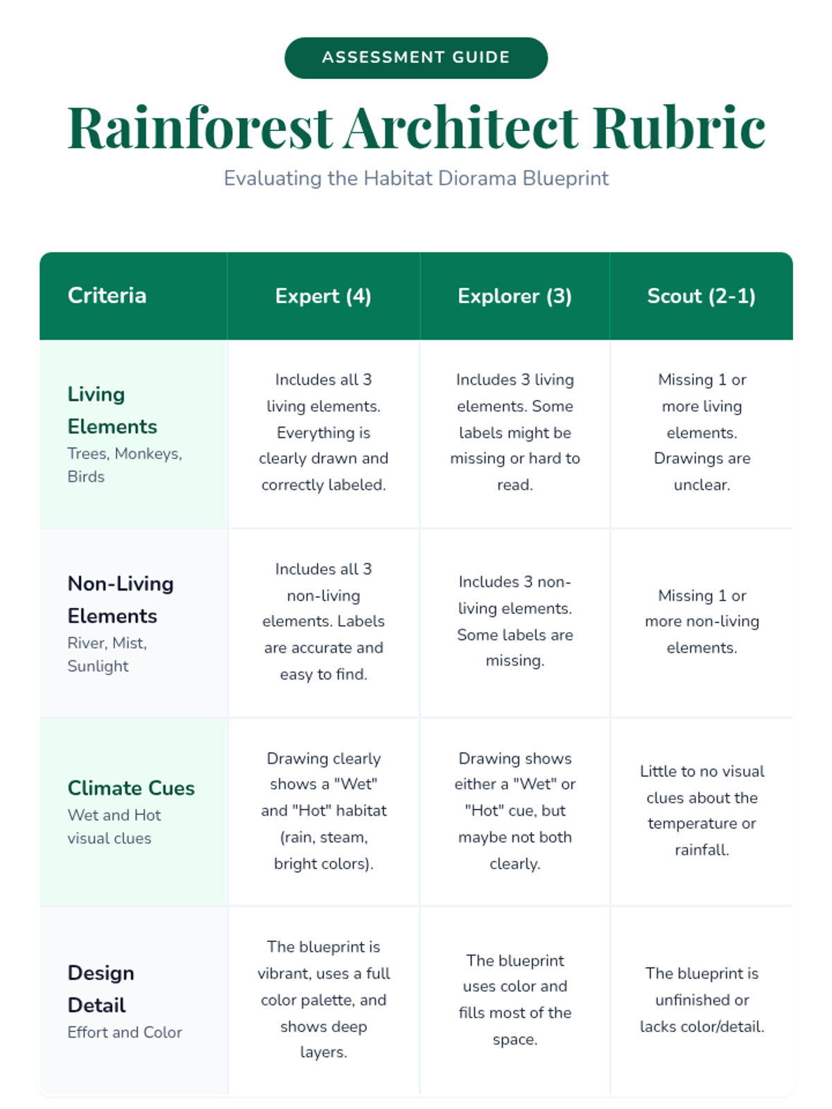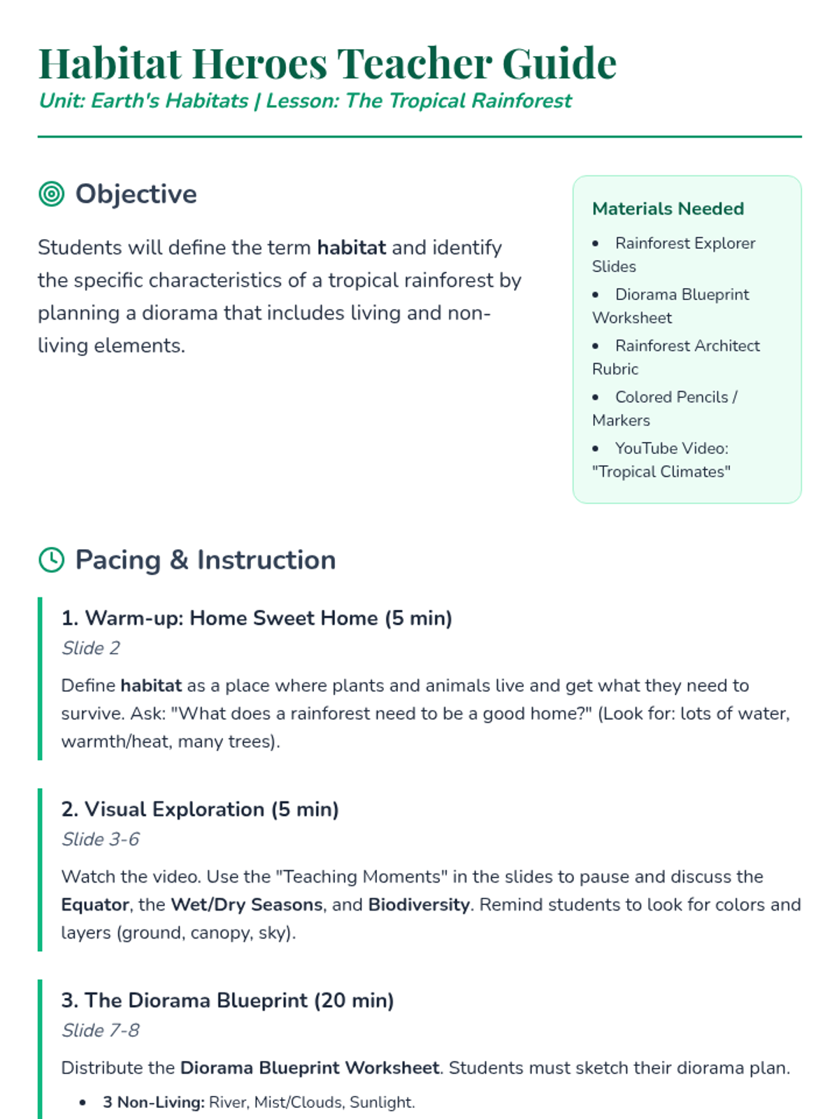 A 3rd-grade lesson exploring the characteristics of a rainforest habitat. Students define what makes a habitat, watch a video on tropical climates, and design a blueprint for a rainforest diorama including living and non-living elements.