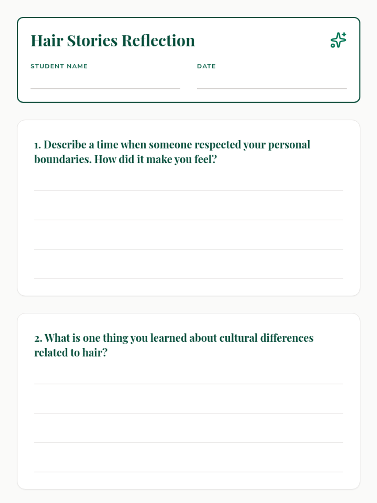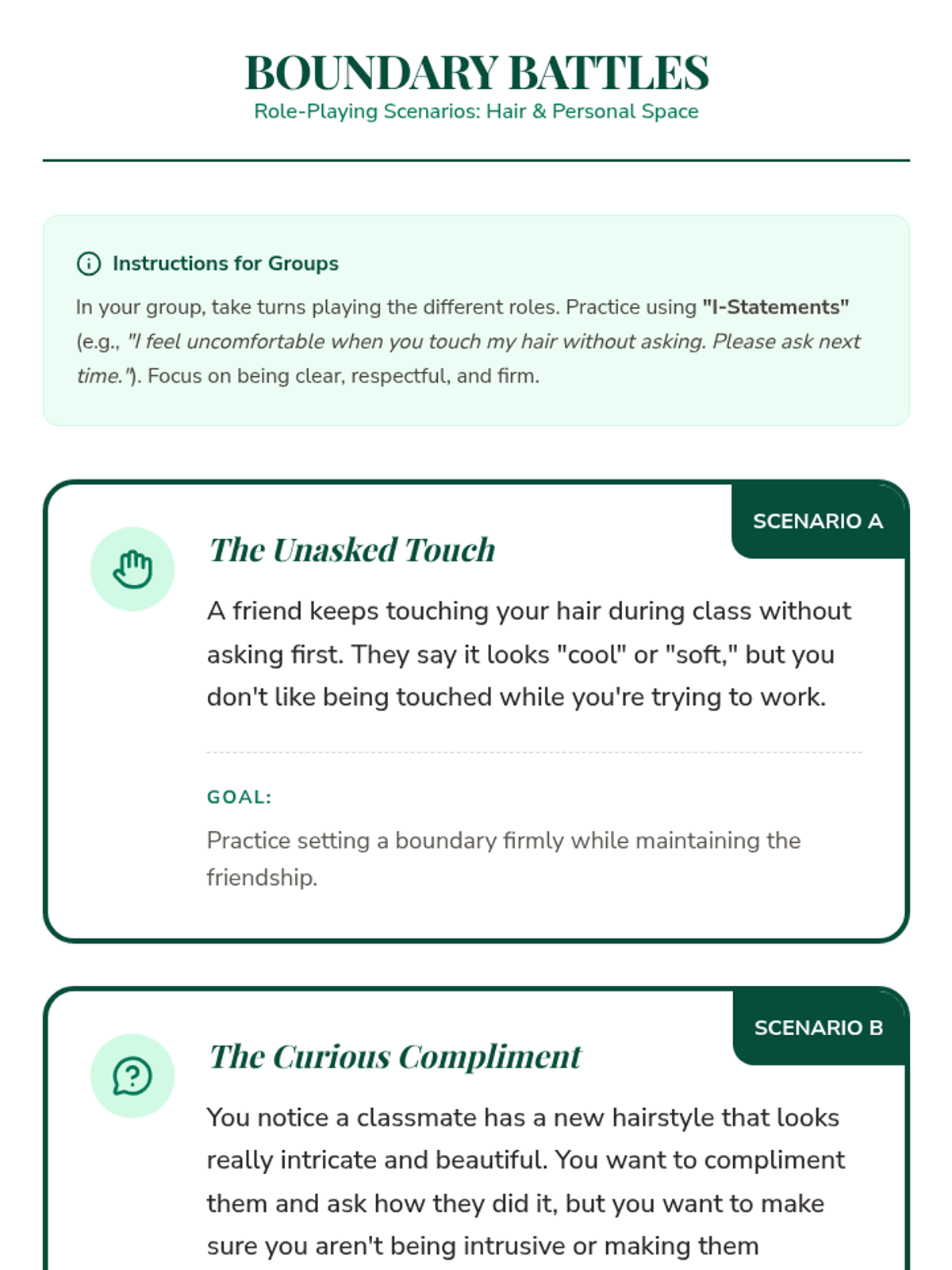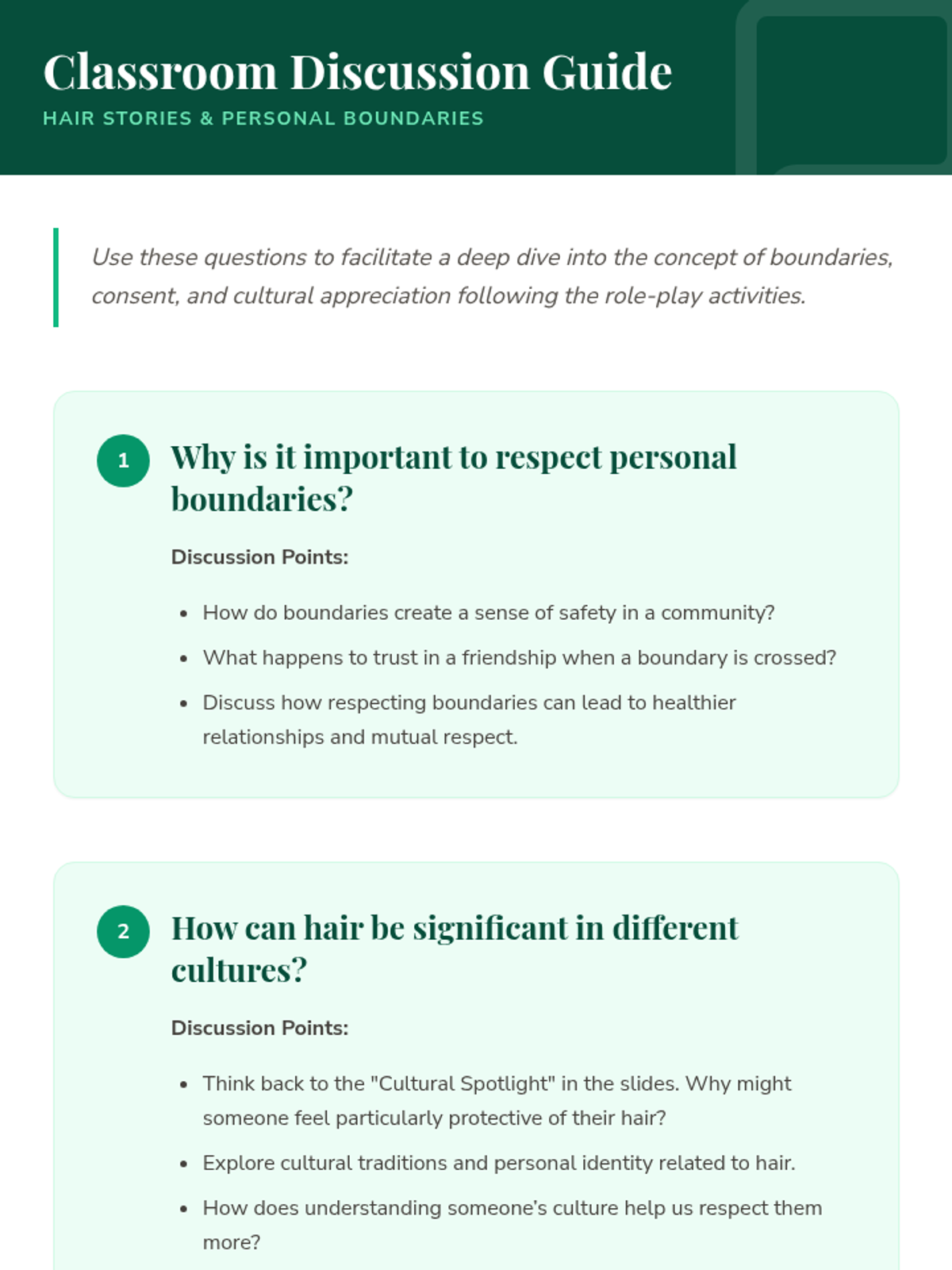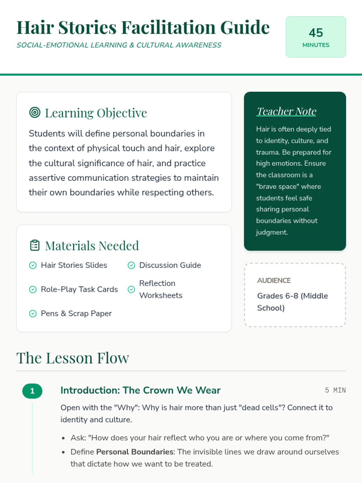 This lesson uses storytelling and role-playing to teach middle school students about the significance of hair as a cultural marker and the importance of respecting physical boundaries. Students explore empathy and cultural awareness through personal reflection and practical scenarios.
