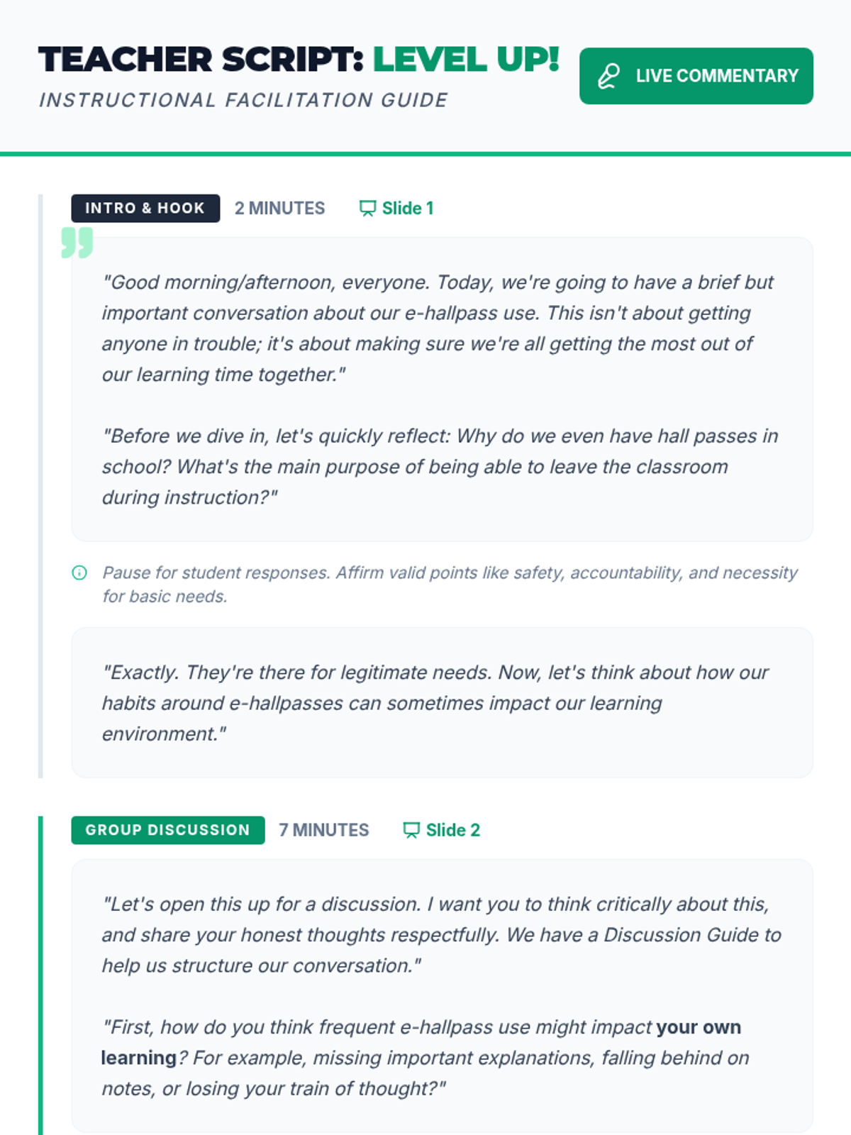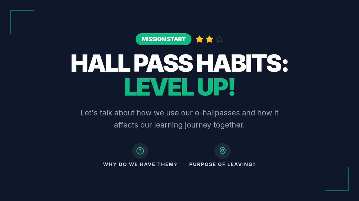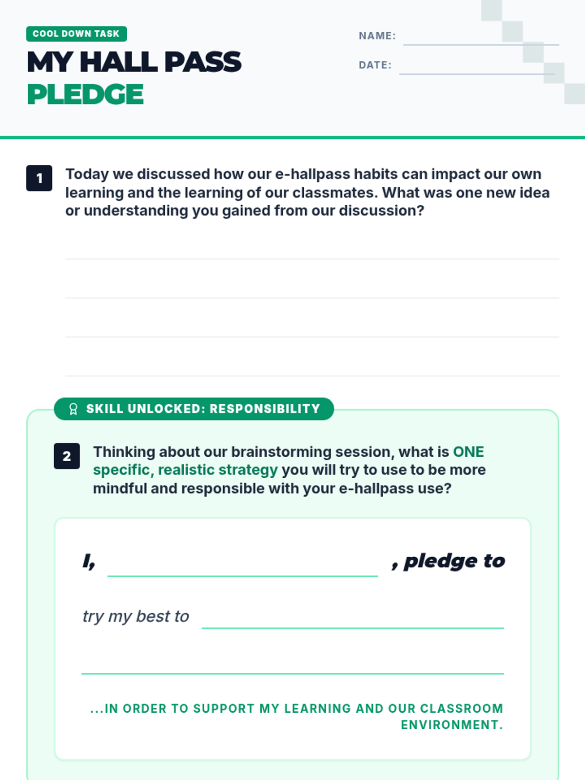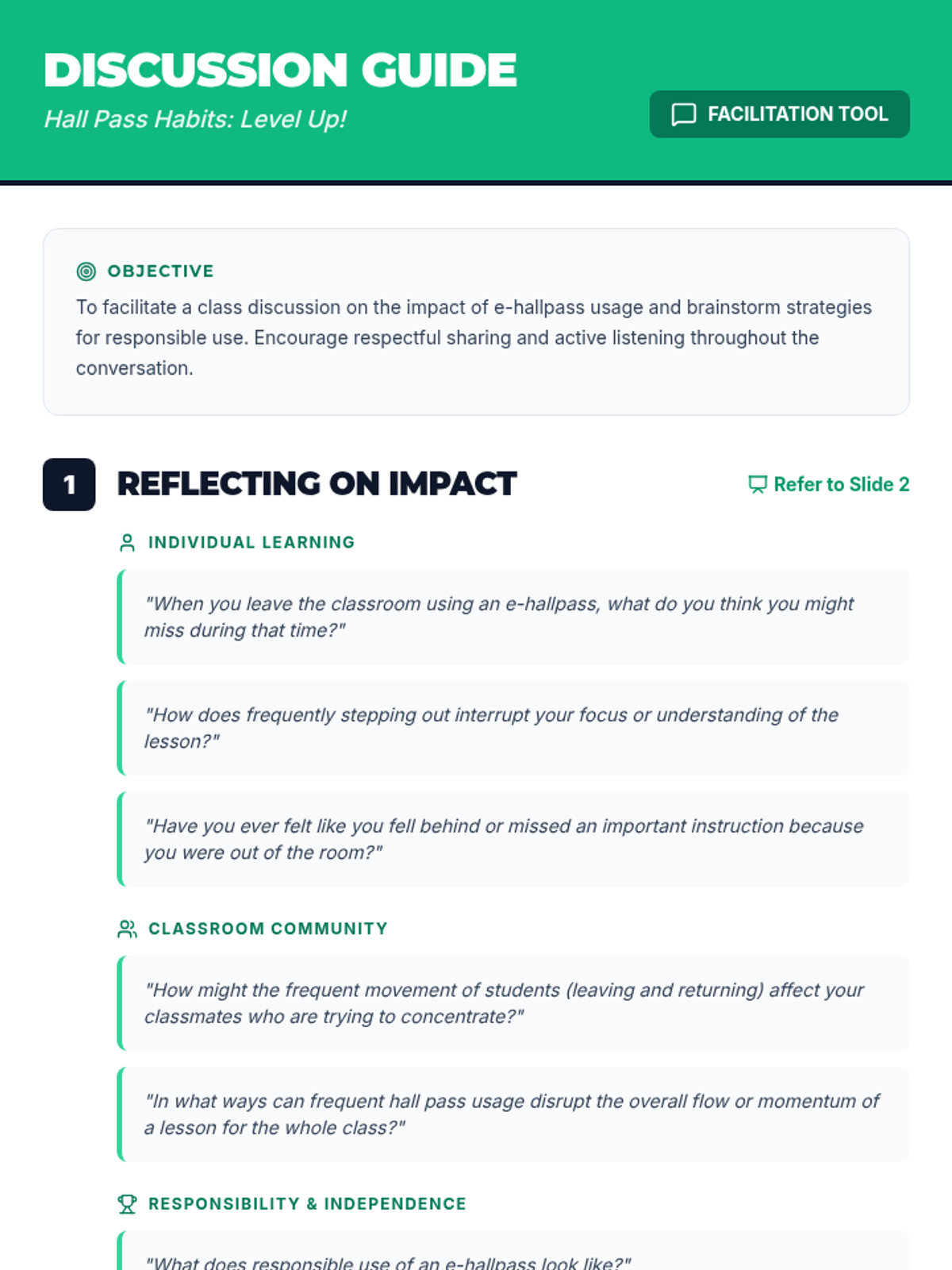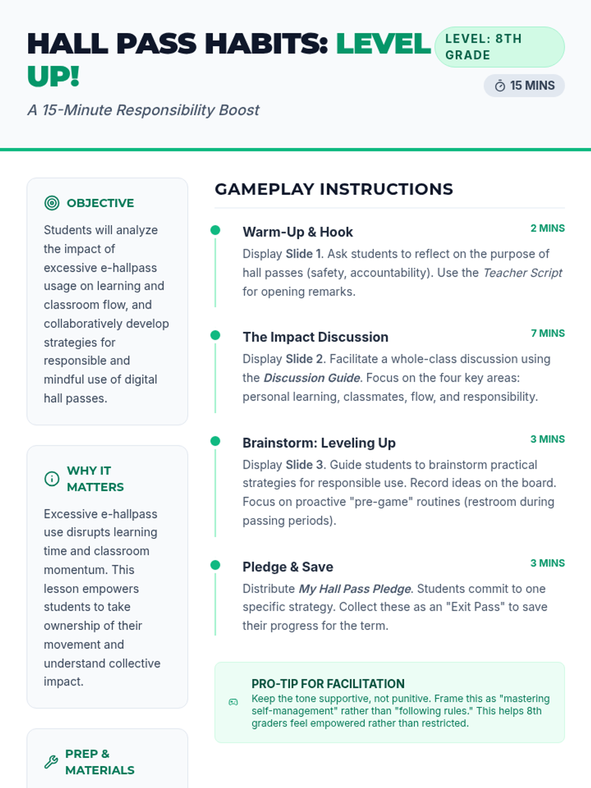 A 15-minute lesson for 8th graders to reflect on e-hallpass usage and develop responsible self-management habits. Students analyze the impact of their choices on classroom flow and commit to a personal 'level up' strategy.