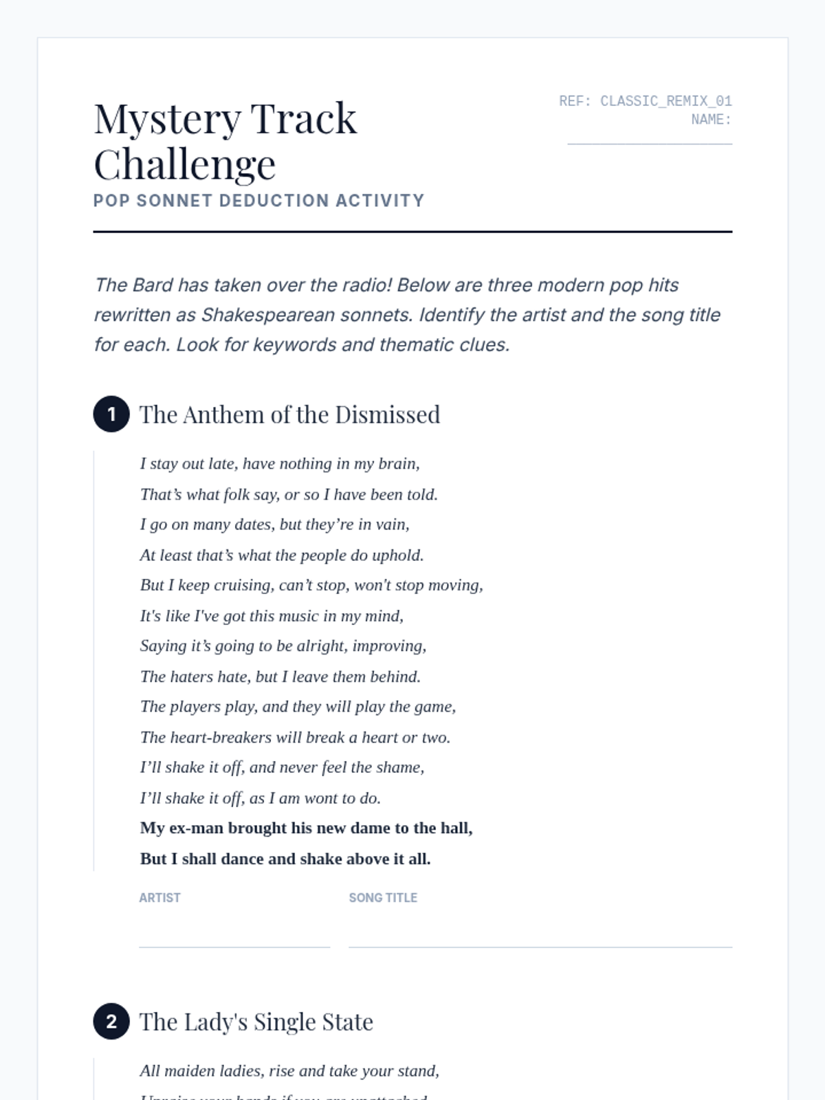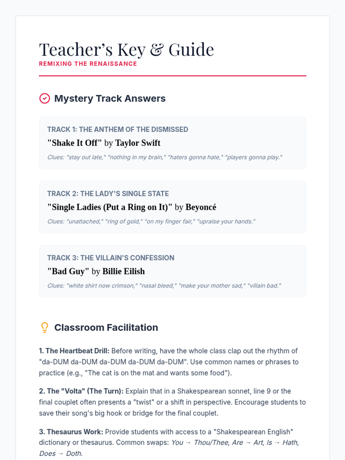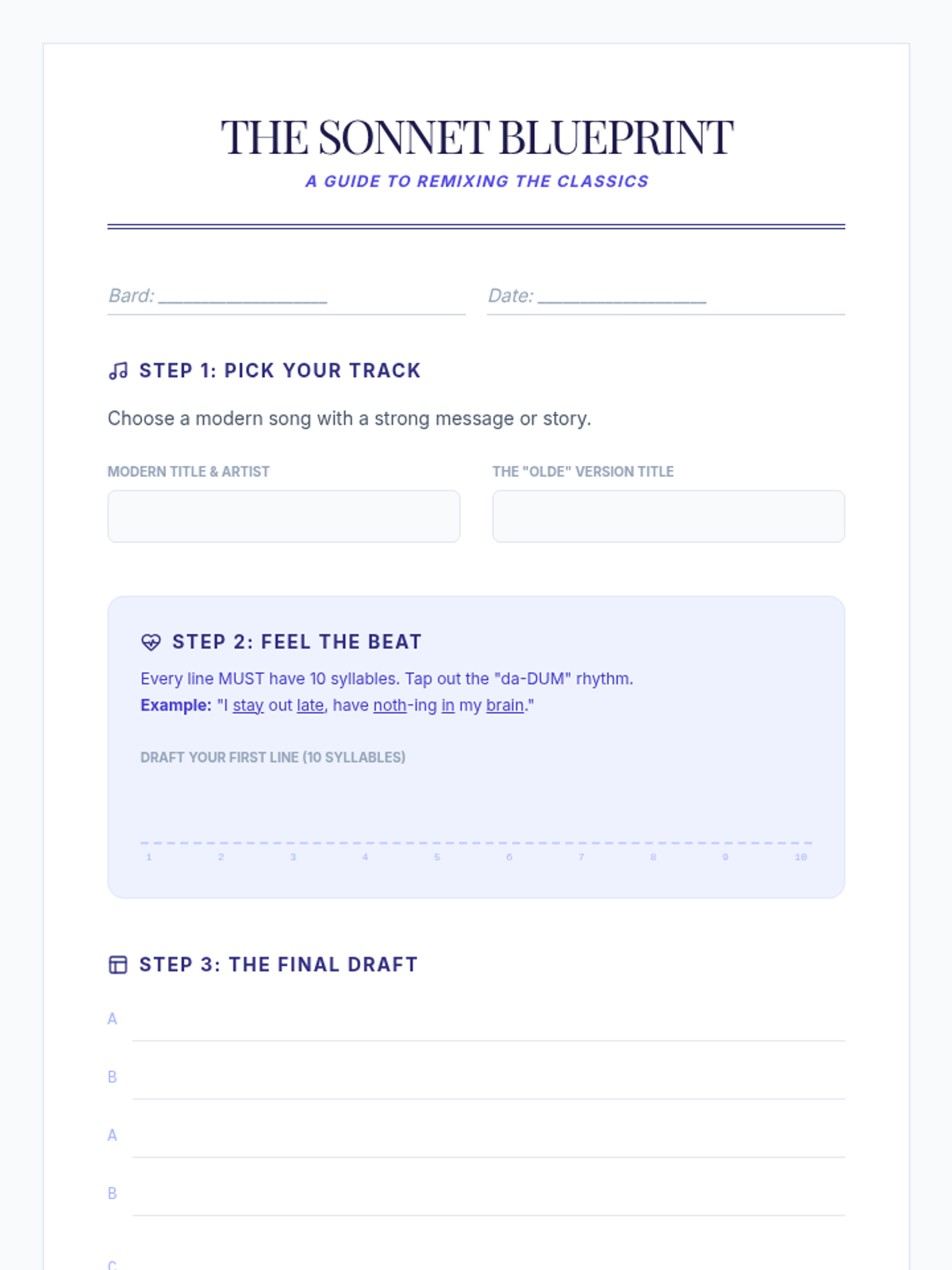 A lesson focused on the structure of Shakespearean sonnets through the lens of modern pop music, covering iambic pentameter, rhyme schemes, and creative adaptation.