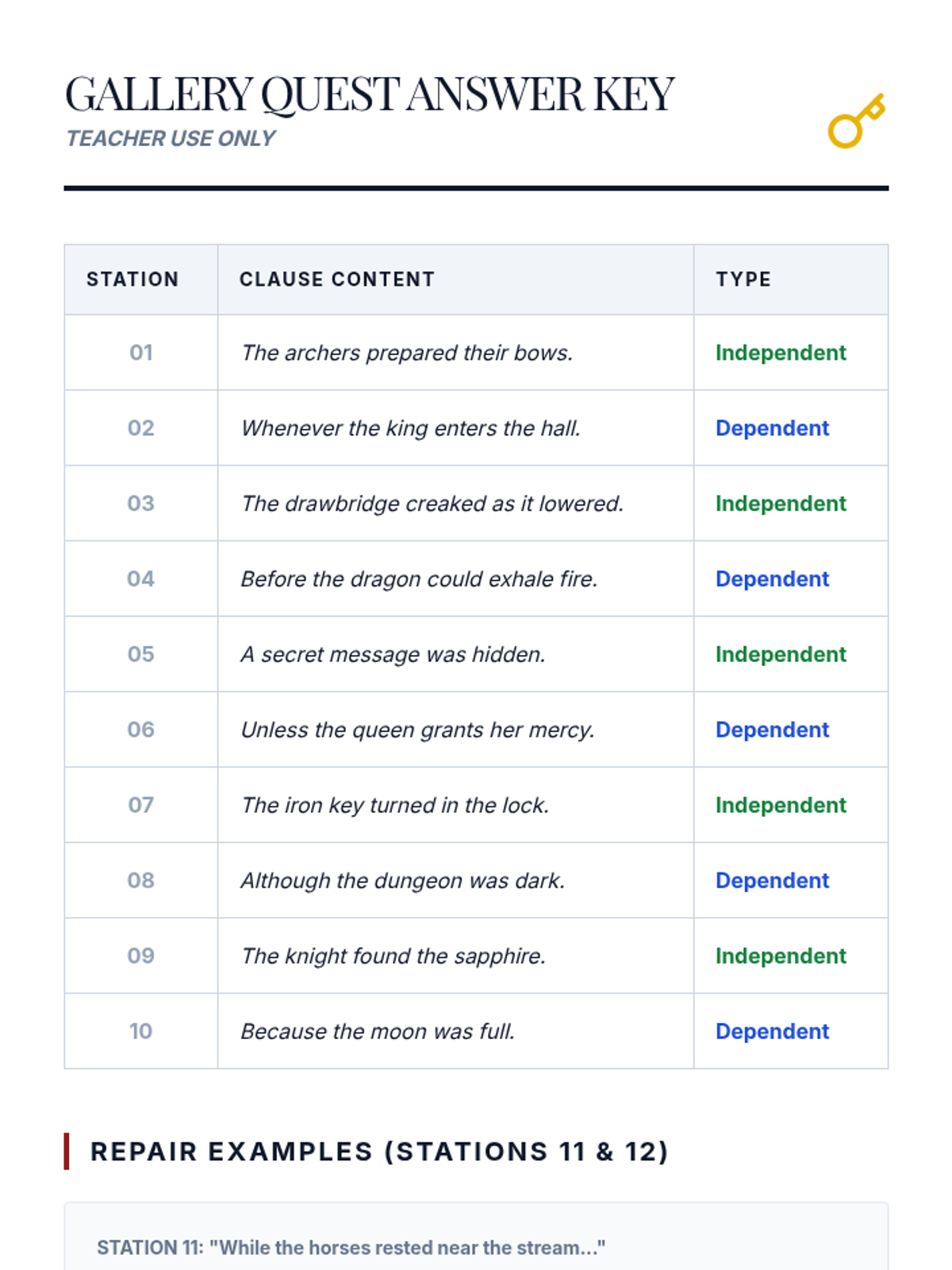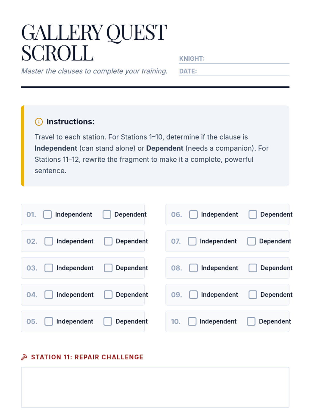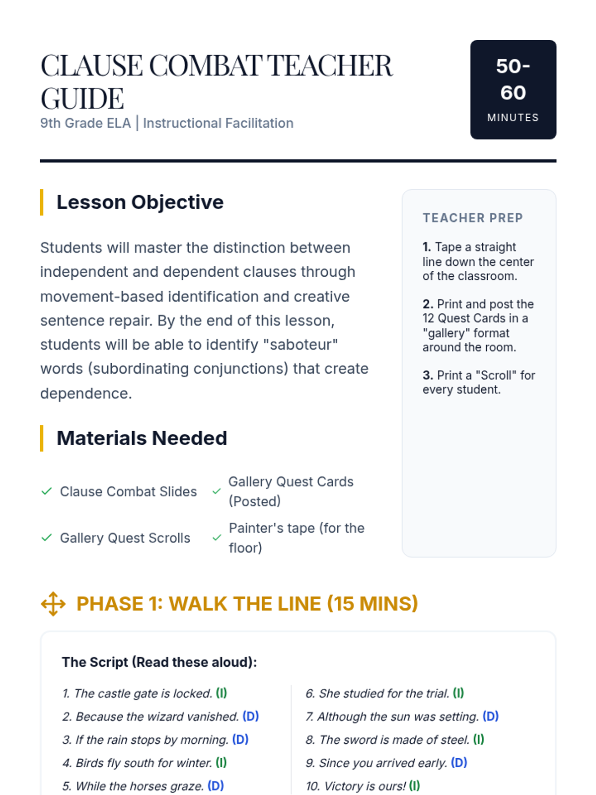 A high-energy lesson using movement-based games to master the distinction between independent and dependent clauses. Students engage in a 'Walk the Line' identification challenge and a 'Gallery Quest' analysis activity.