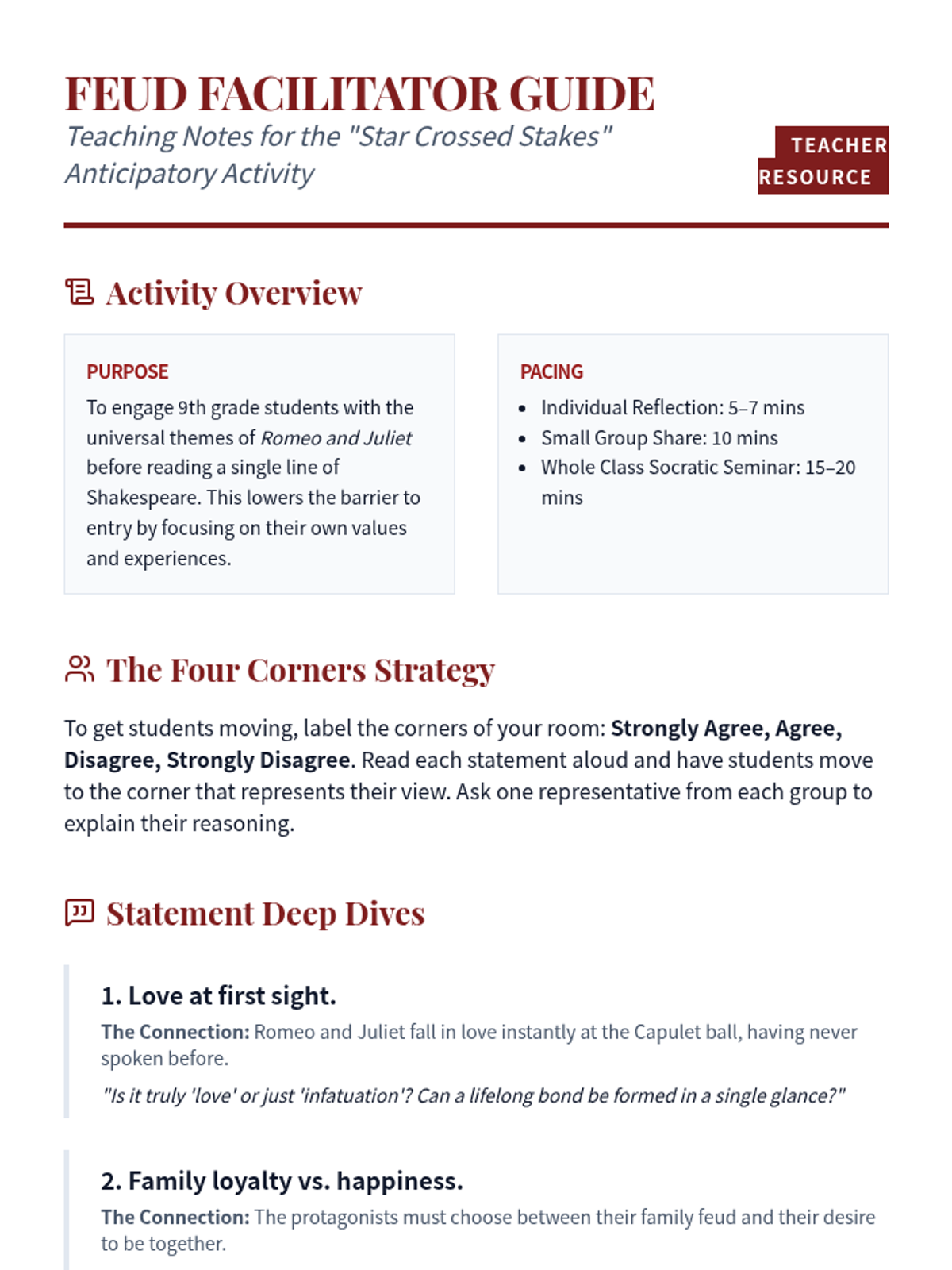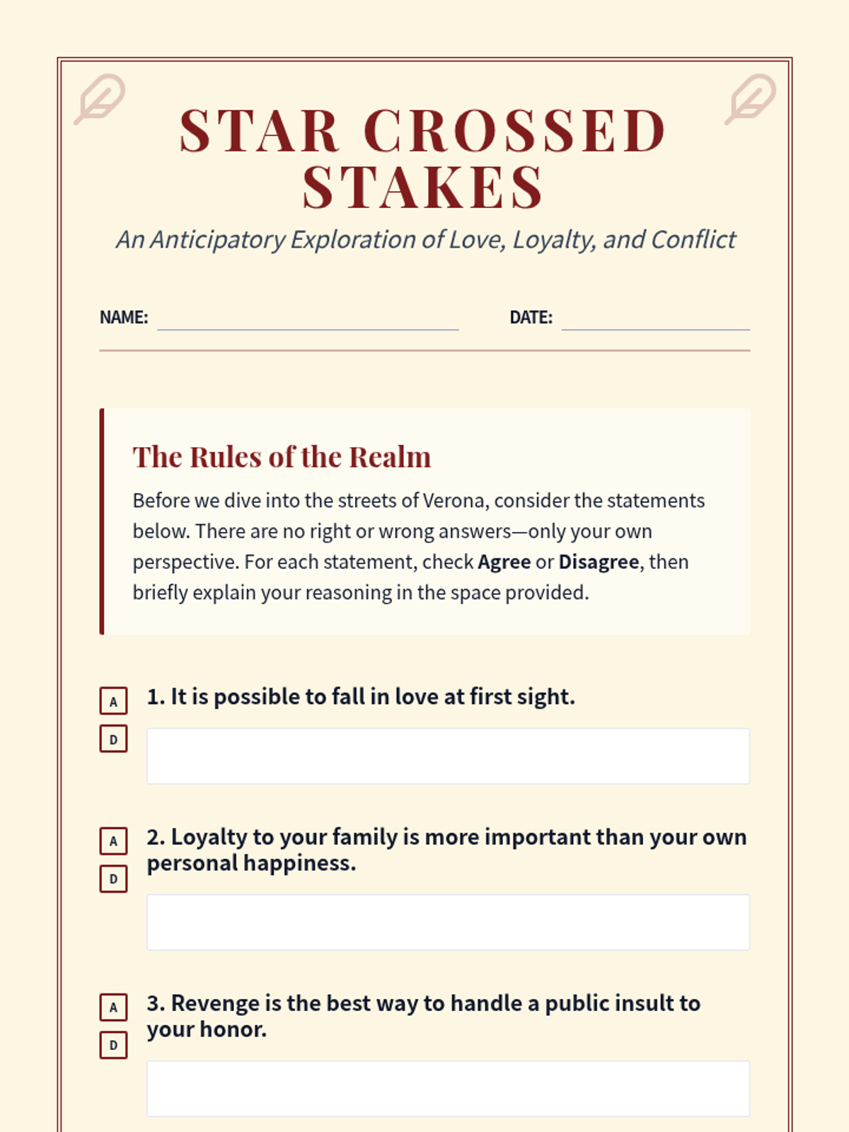 An introductory lesson for Romeo and Juliet where students explore central themes of love, loyalty, and conflict through an anticipatory guide and class discussion.