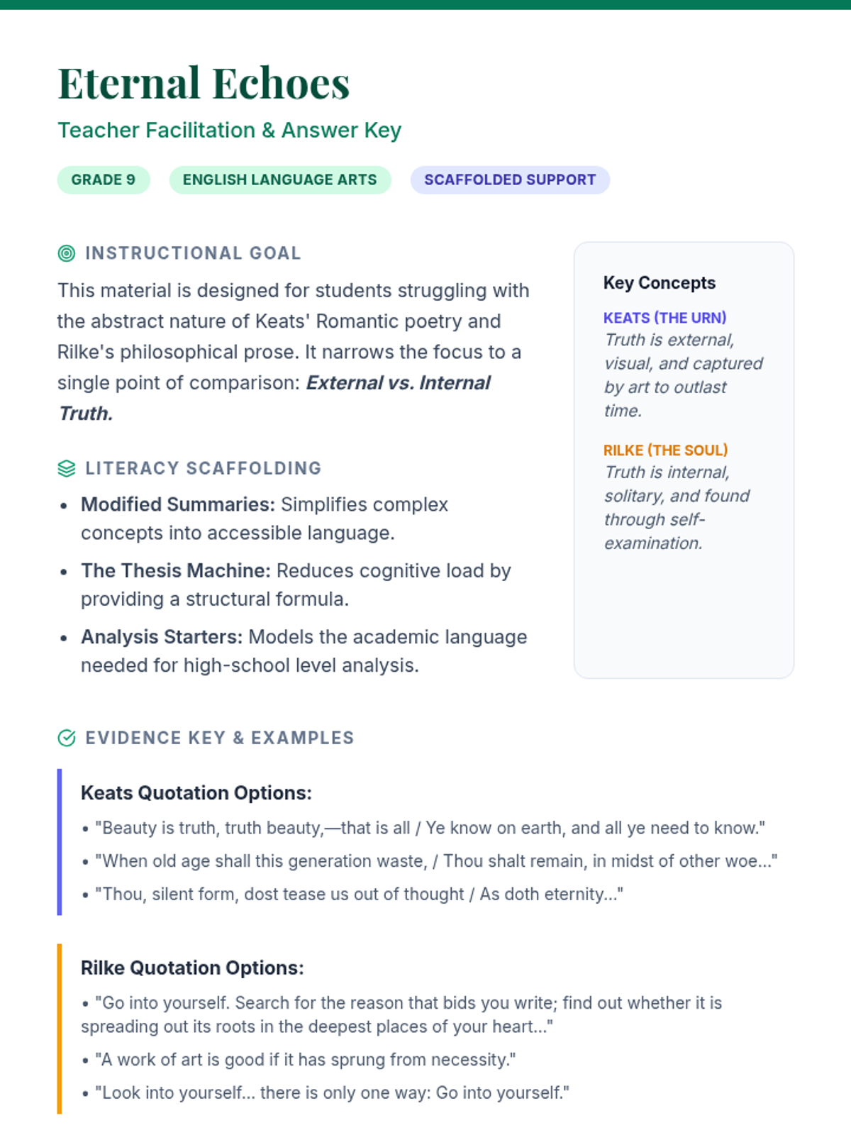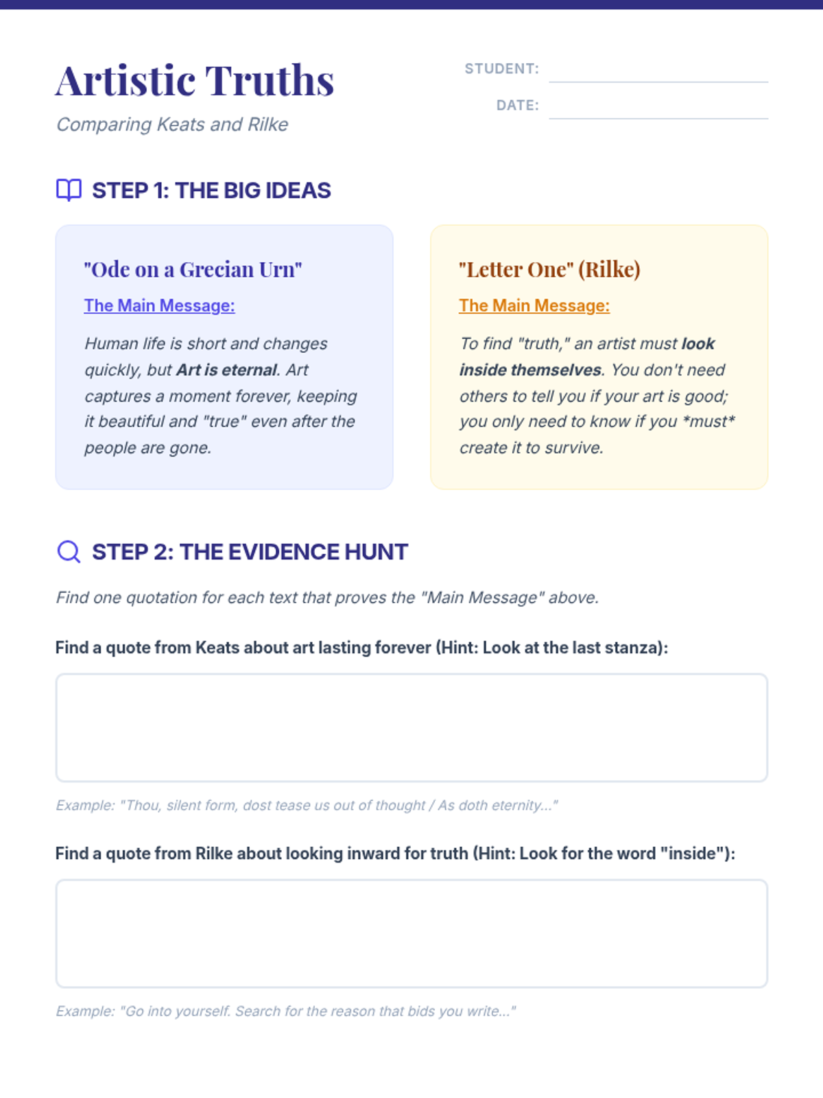 A scaffolded lesson designed to help 9th-grade students compare the central ideas of Keats' 'Ode on a Grecian Urn' and Rilke's 'Letter One' through evidence collection and thesis construction.
