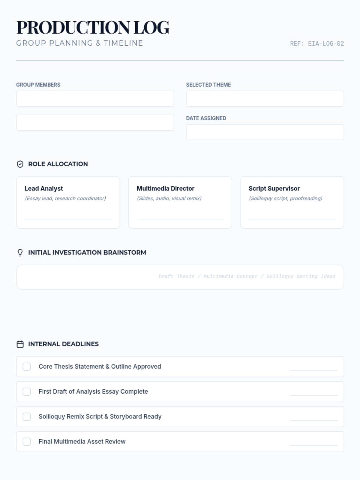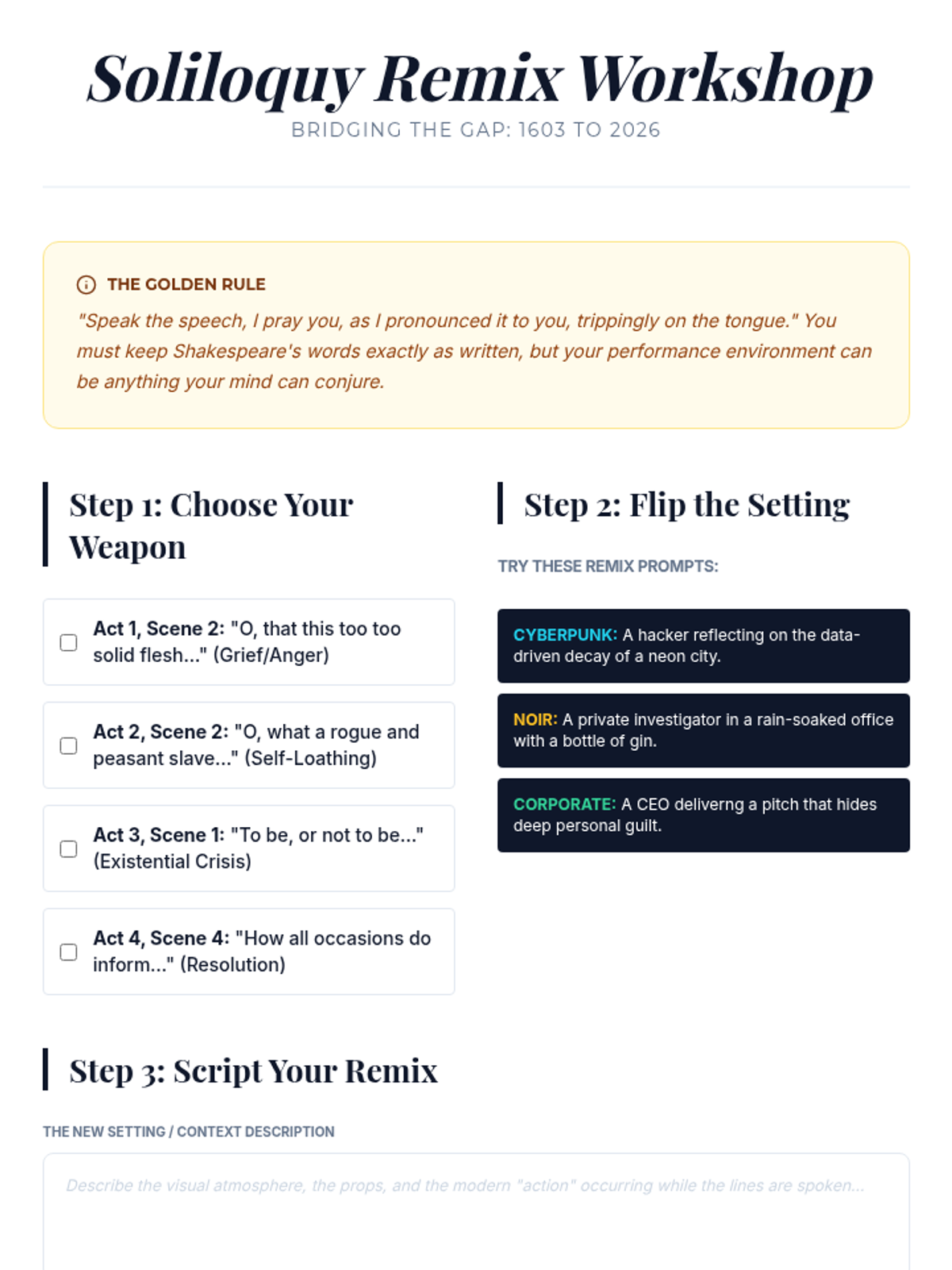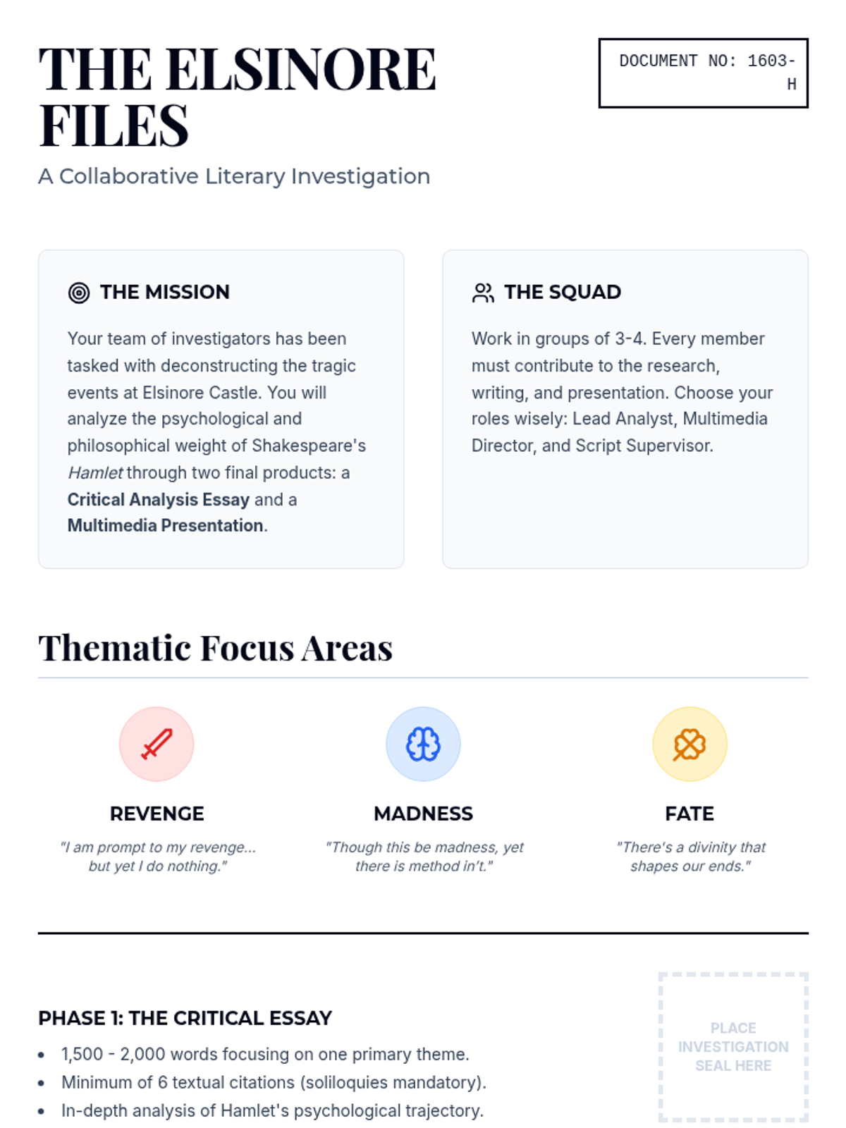 The core lesson for the Hamlet collaborative project, guiding students through thematic analysis, soliloquy performance, and final presentation preparation.