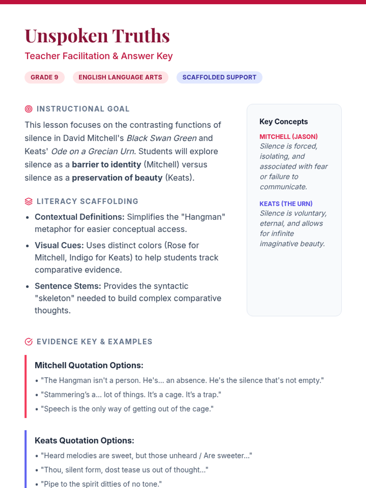 A comparative lesson for 9th-grade students focusing on the theme of silence and expression in David Mitchell's 'Black Swan Green' and Keats' 'Ode on a Grecian Urn'.