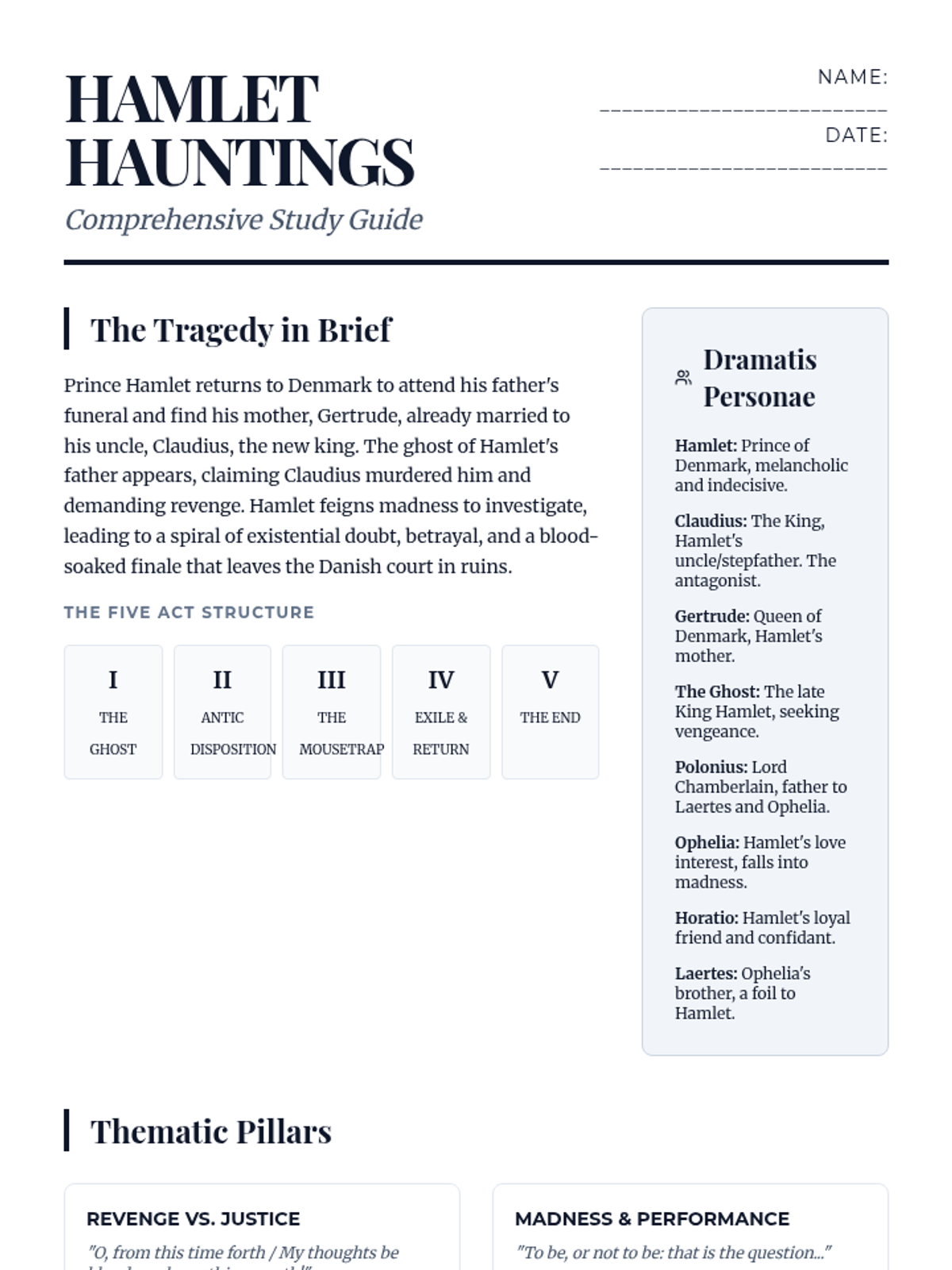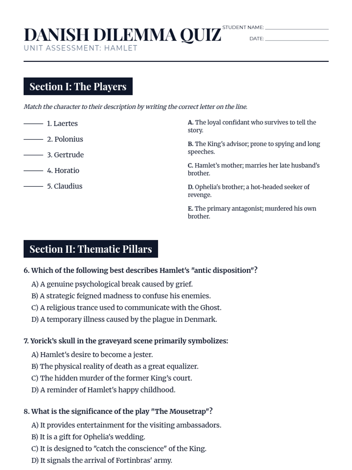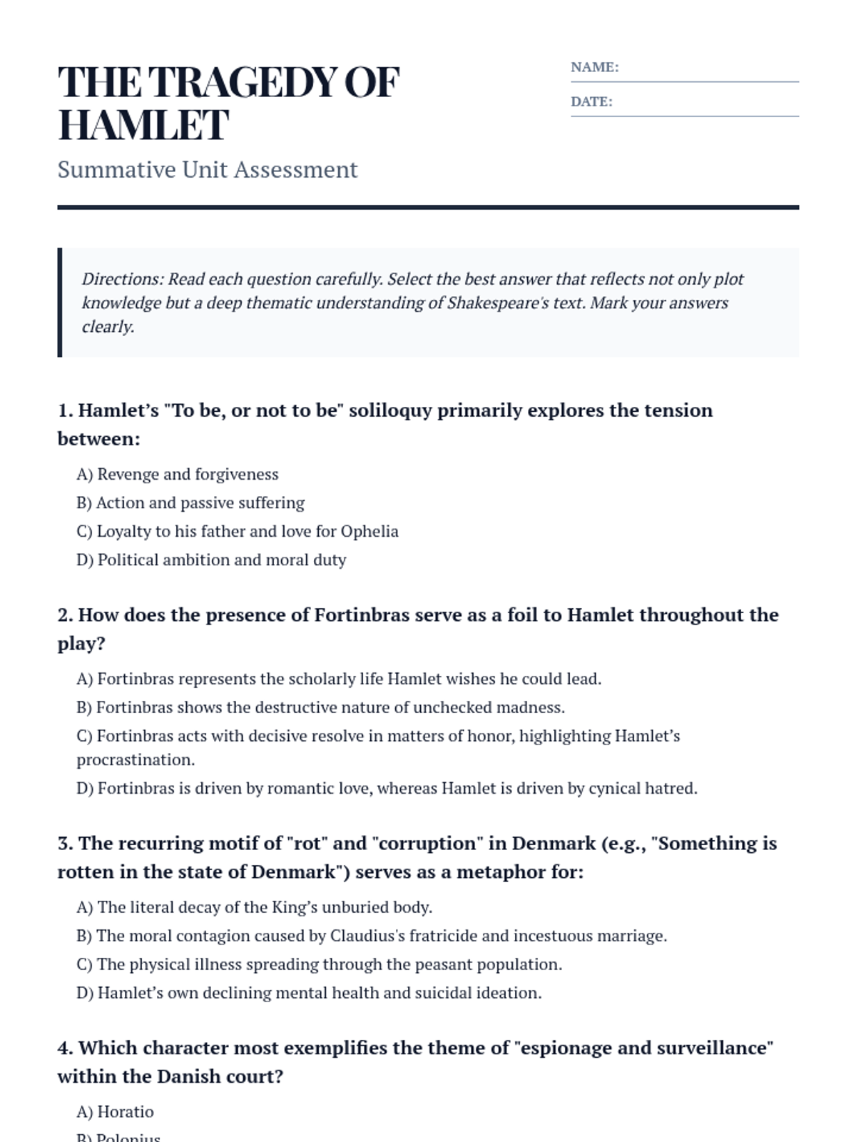 A comprehensive summative assessment for William Shakespeare's Hamlet, focusing on thematic depth, character foils, and textual analysis through key quotations.